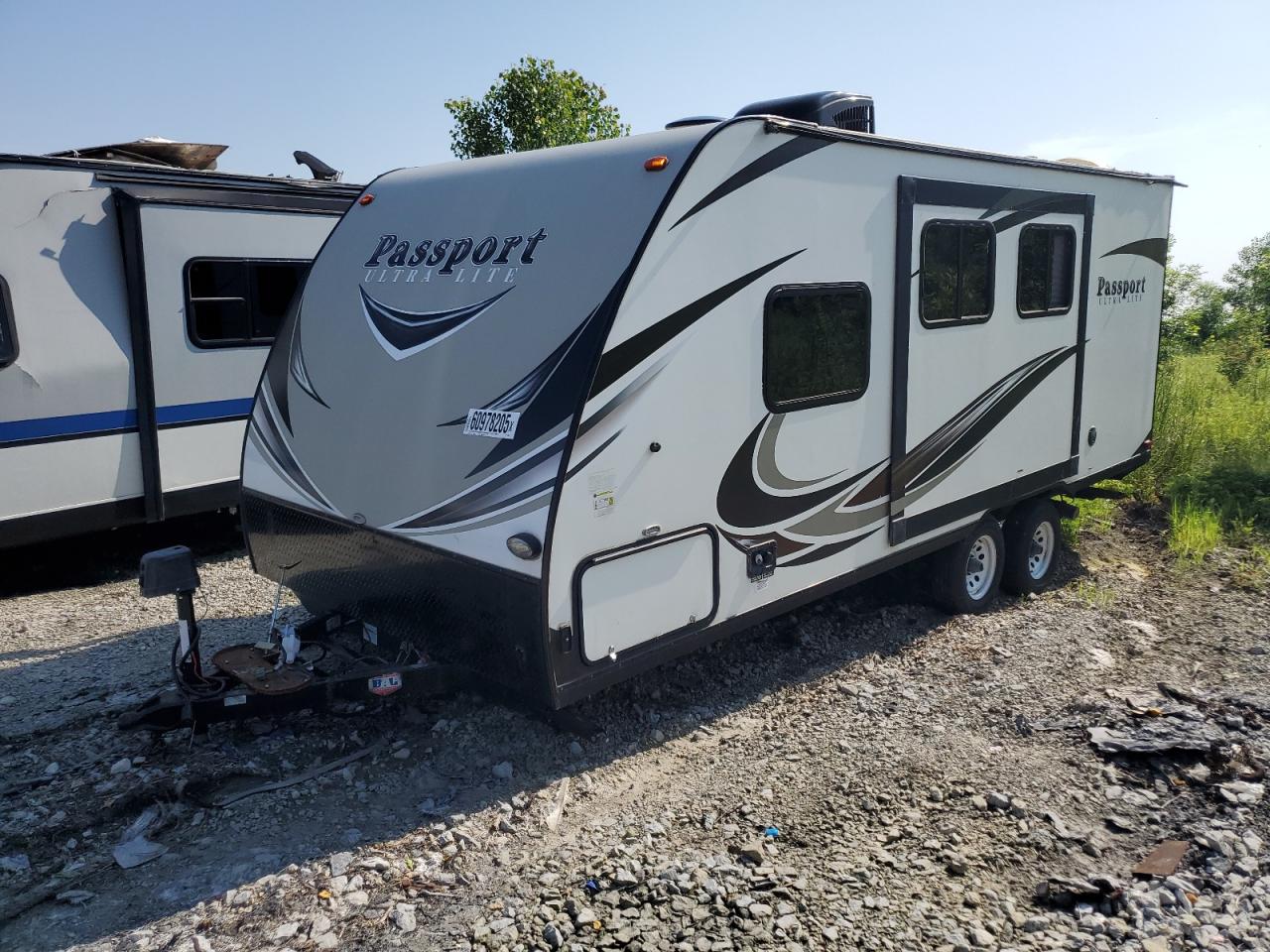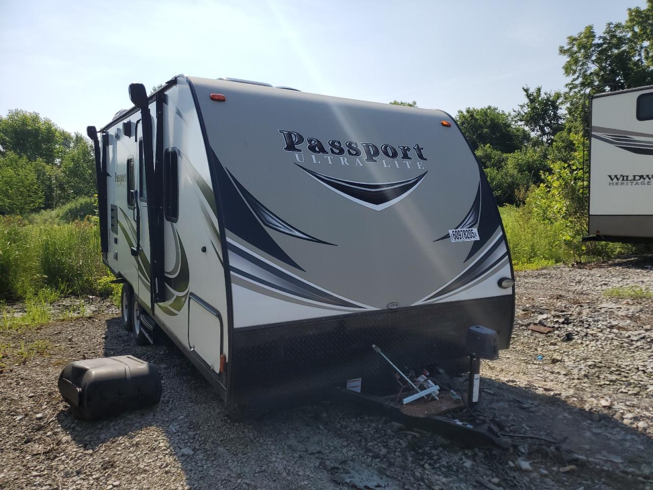This is a KEYSTONE PASSPORT 2018 RV. The primary damage consists of MINOR DENT/SCRATCHES, and there is no secondary damage. The RV has a two-tone color scheme, and its start code is DEFAULT. The wheels, lights, and glasses appear to be in good condition.