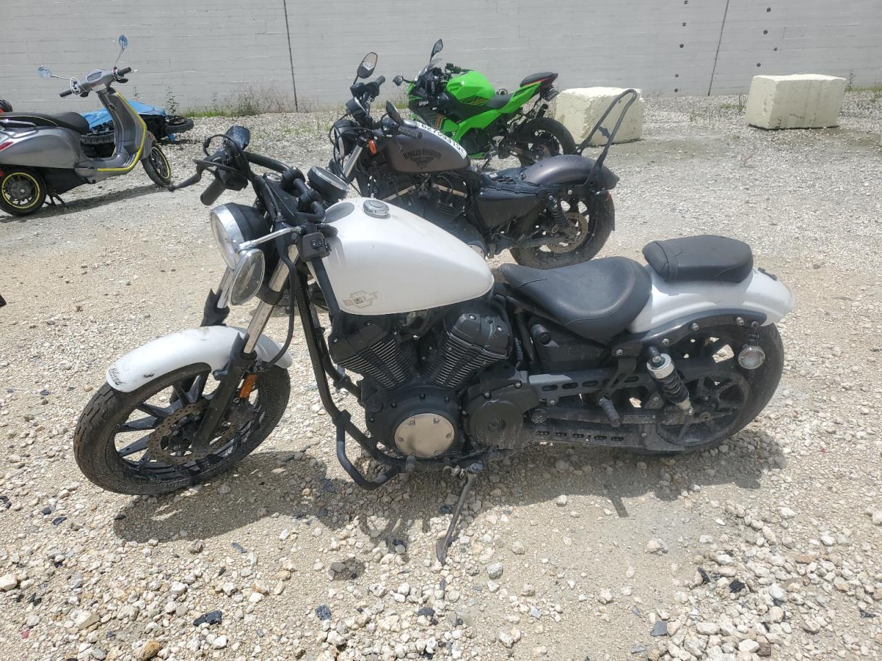 GoodThis is a YAMAHA XVS950 CU 2014 motorcycle with a two-tone color scheme. The primary damage is on the side. The motorcycle appears to have moderate visible damage. The wheels and lights seem intact, but the overall condition is fair, suggesting the need for some repairs. The motorcycle is drivable.