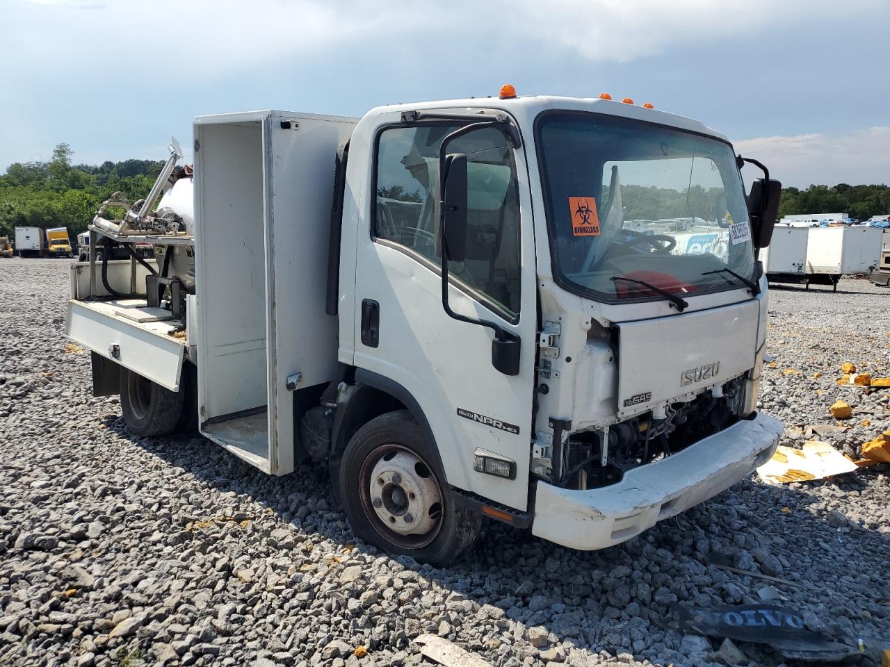 The ISUZU NPR HD exhibits extensive body damage across multiple panels, and the interior shows significant damage. The overall damage is extensive, and the vehicle's condition is significantly compromised.