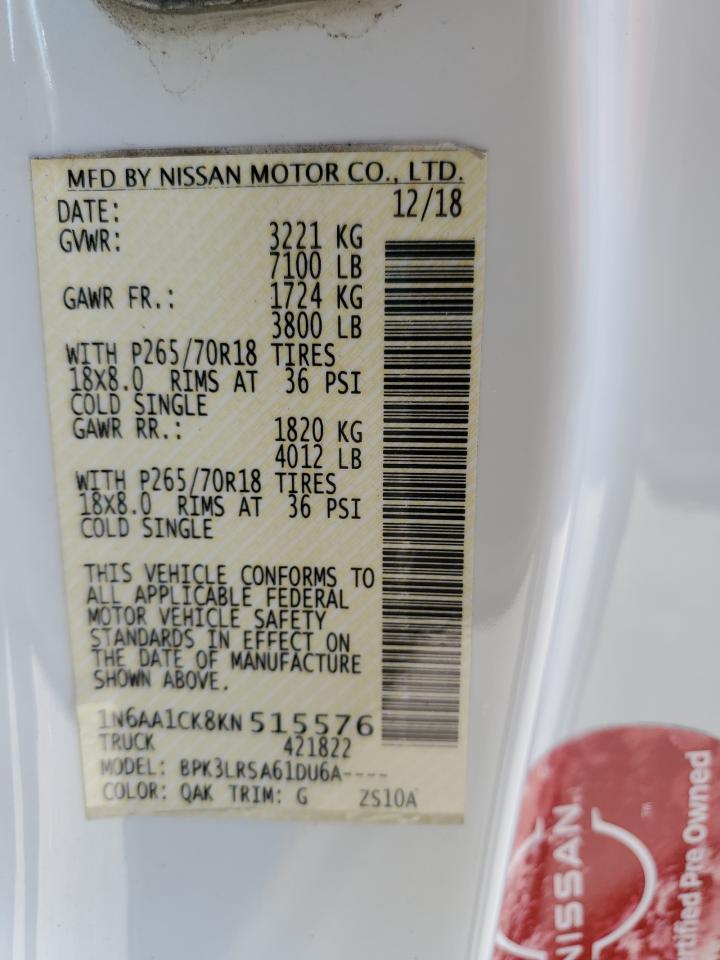 GoodThe 2019 NISSAN TITAN S is a white pickup truck with RUN & DRIVE VERIFIED status. The primary damage is NORMAL WEAR, with secondary damage to the REAR END. This truck shows signs of use consistent with its age and mileage. The images show a white exterior with some wear and tear. The interior appears to be in decent condition, with some visible wear. The wheels and lights appear to be in good condition. The glasses appears to be ok.