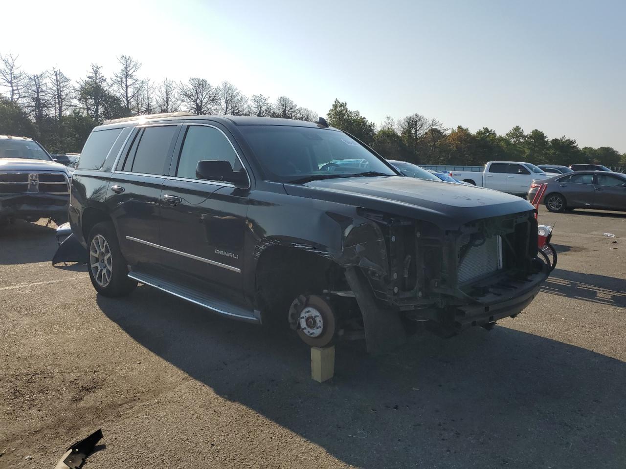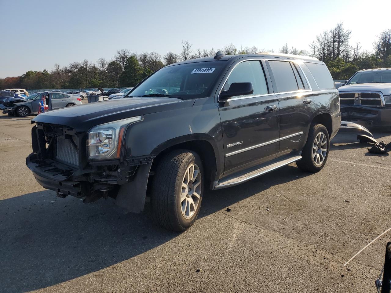 FairThe 2015 GMC Yukon Denali is black with front-end and undercarriage damage. The vehicle's exterior shows significant damage, including missing components and body panel issues, particularly at the front. The interior appears to be in better condition, with only moderate wear and tear. The car starts, but its overall condition is considered fair, indicating that it requires repair before it is roadworthy.