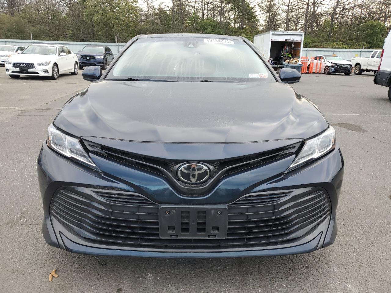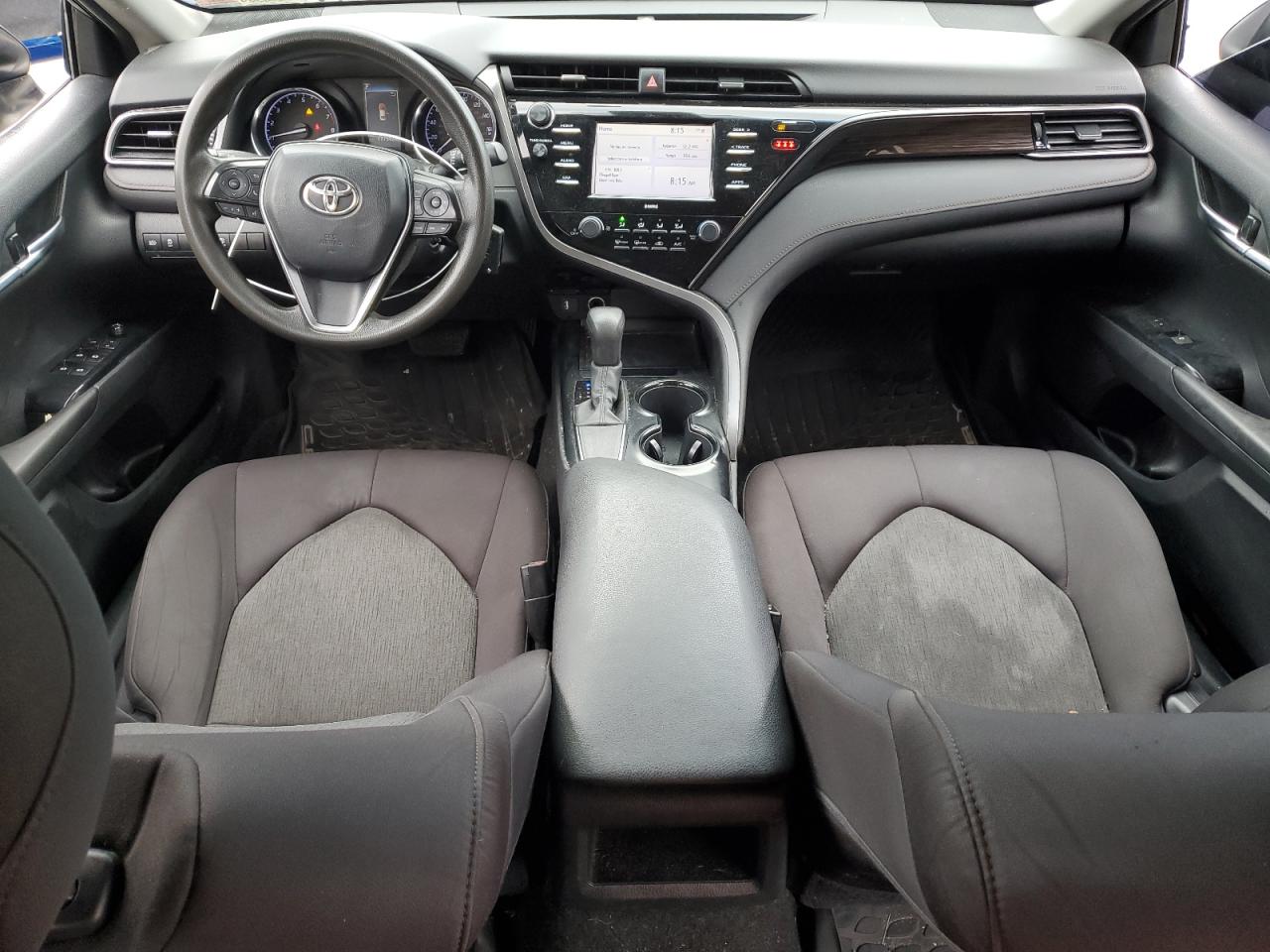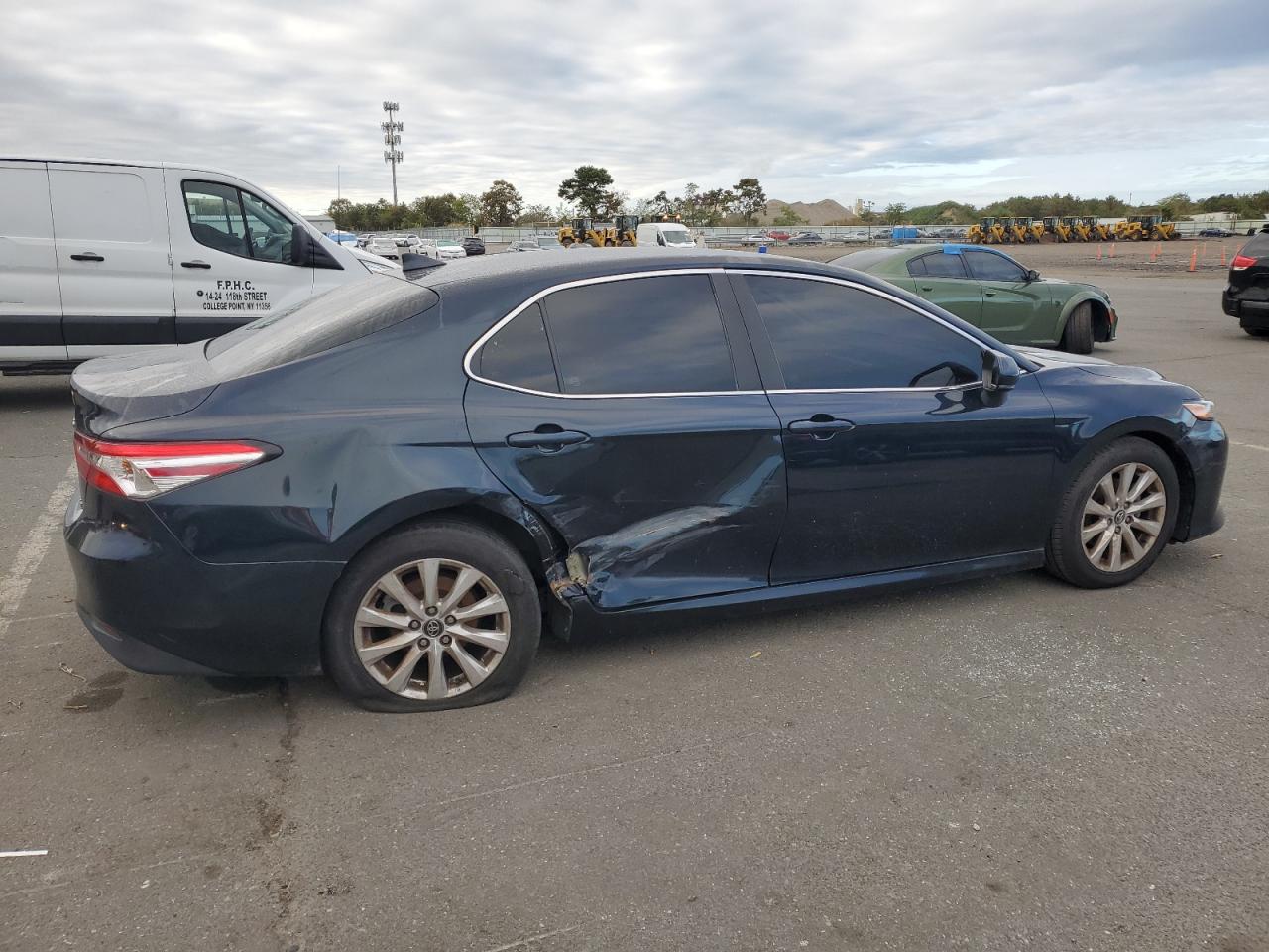 FairThe 2020 Toyota Camry LE is a dark blue sedan. It has sustained side damage with visible dents and scratches. The wheels appear to be intact. The lights and glasses appear undamaged. The interior shows signs of wear consistent with its age and mileage. The car is drivable, Run & Drive Verified.