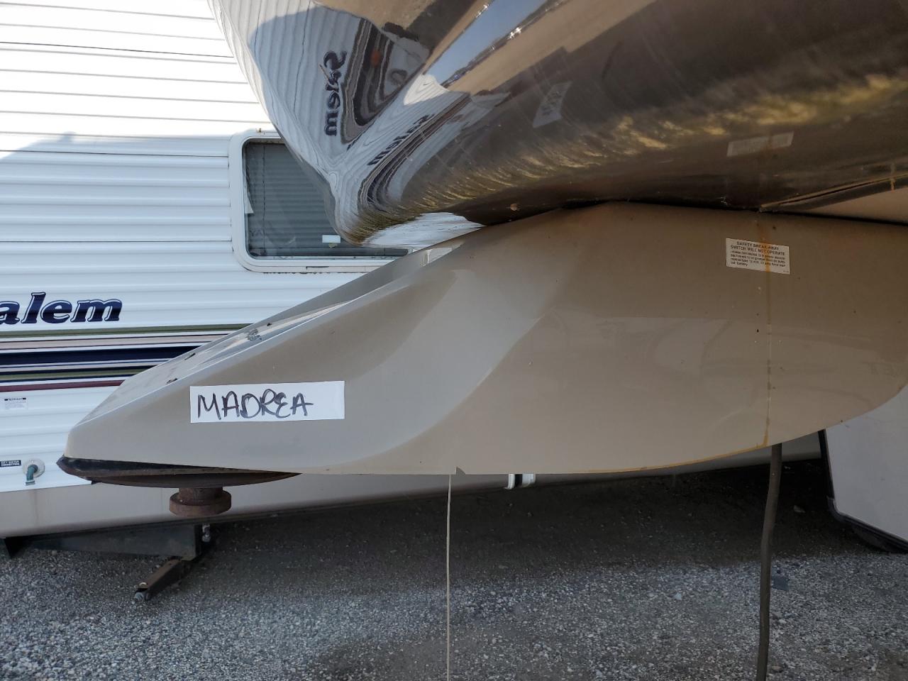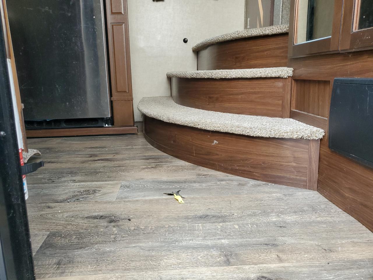 The RV exhibits damage to the side, with no immediate secondary damage noted. Interior appears to be in relatively good condition.