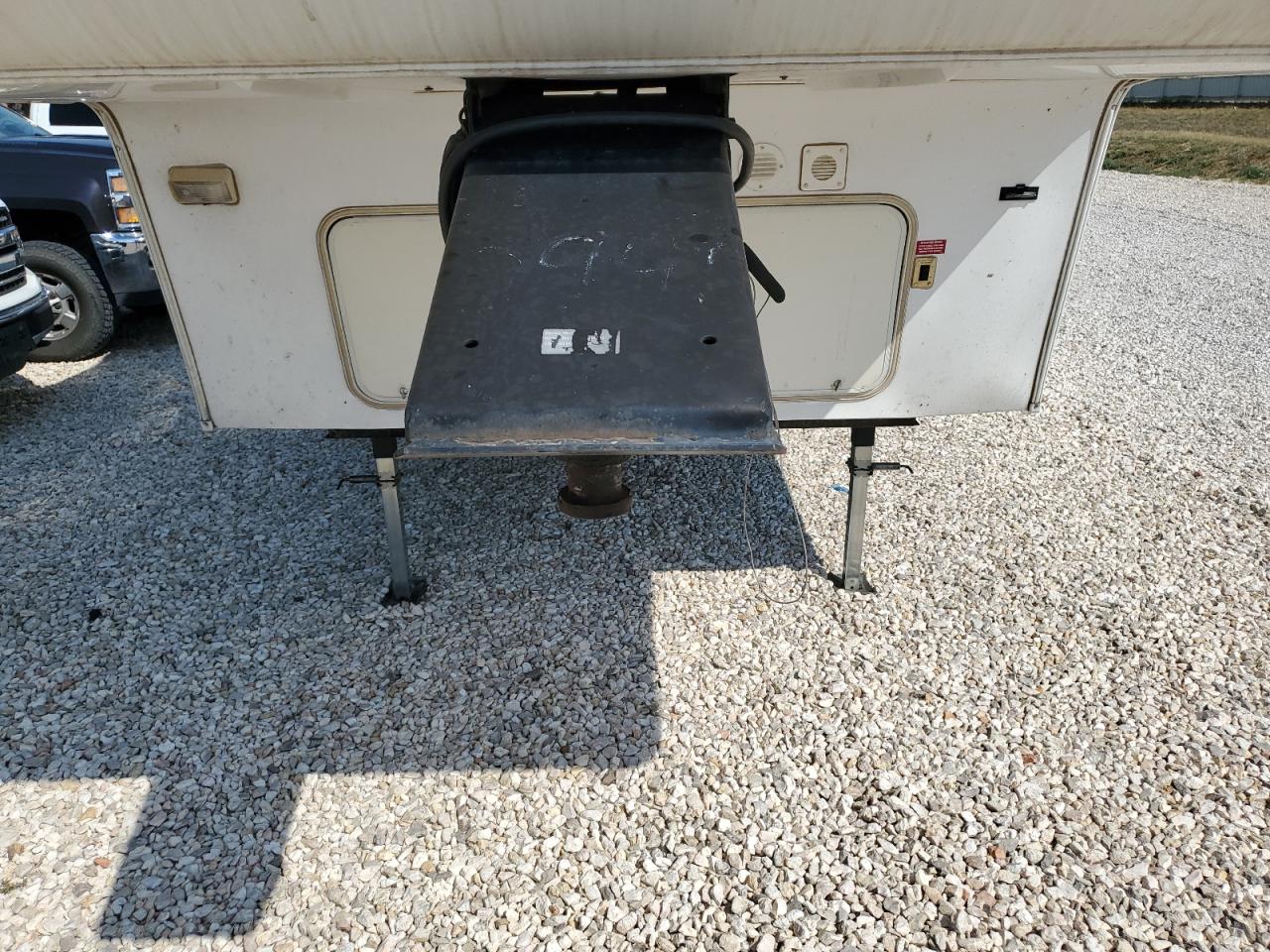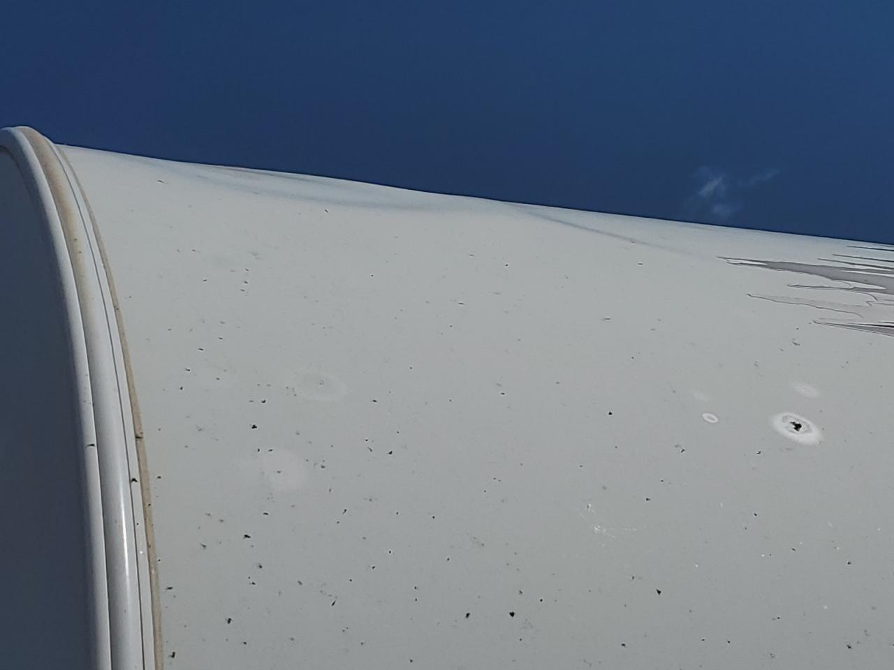 The RV shows signs of hail damage, especially visible on the roof. There is also damage to the side panels. The vehicle appears to be drivable, with moderate overall damage.