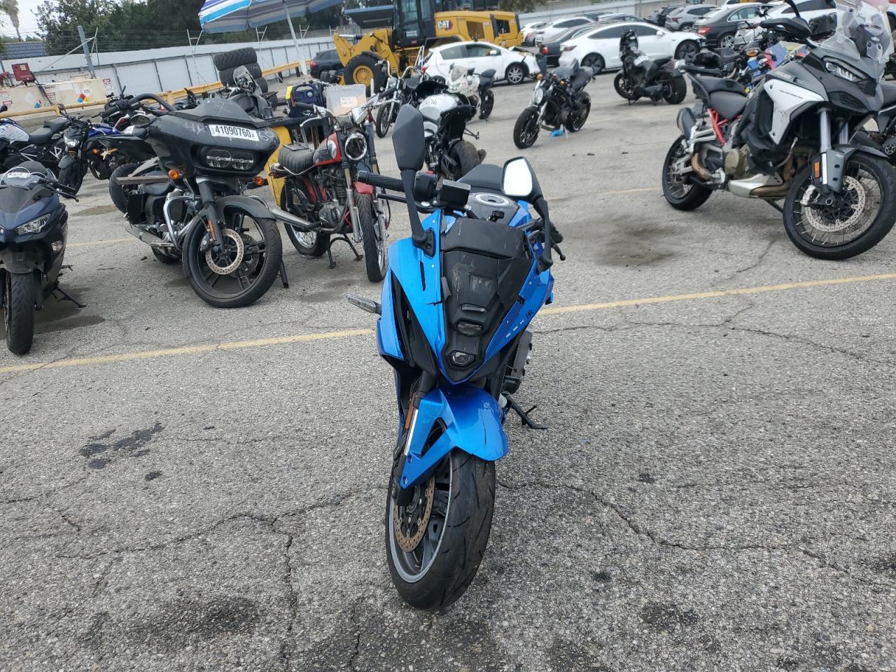 The motorcycle has front-end damage. The body panels show signs of damage. No apparent damage to the wheels. The lights and glasses may be affected as part of front end.