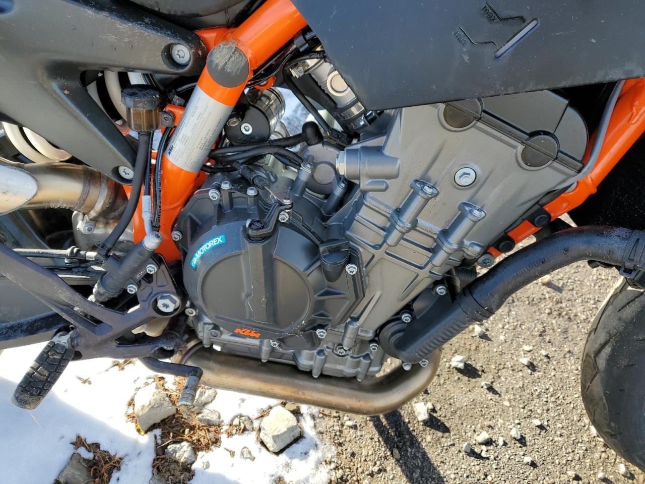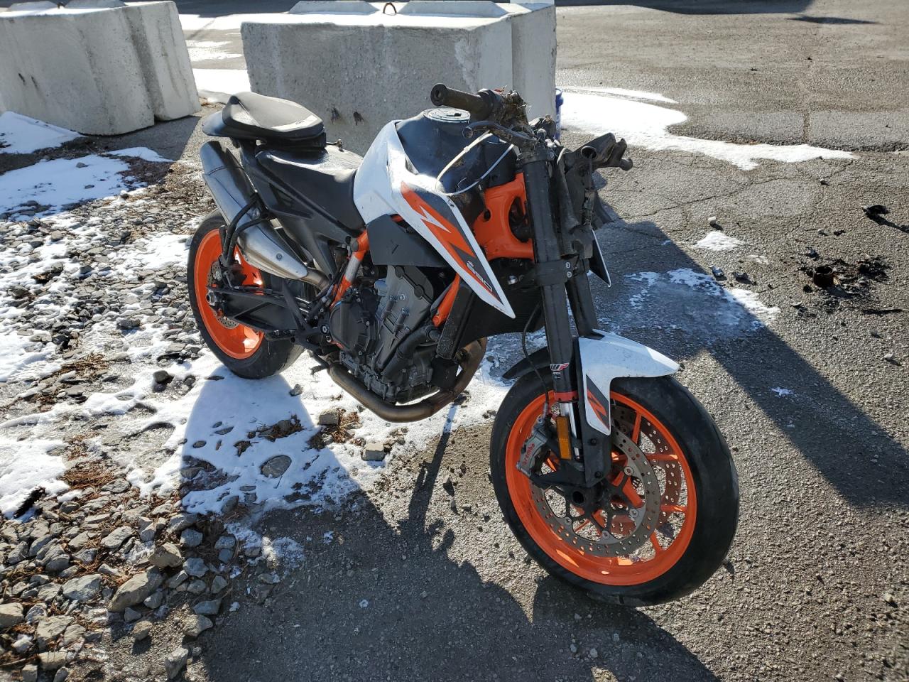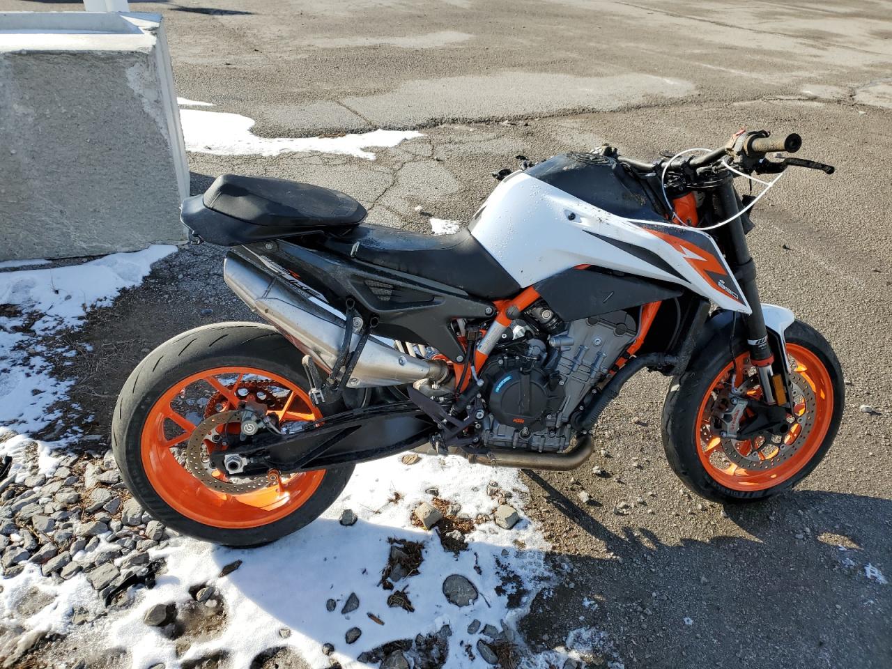 FairThe KTM 890 DUKE R 2020 in white has sustained significant damage consistent with a rollover. The body panels show moderate visible damage. The handlebar is severely damaged. There is visible damage to the front end, and overall the motorcycle requires considerable repair. The interior condition is Fair. Overall state of the motorcycle is Poor.