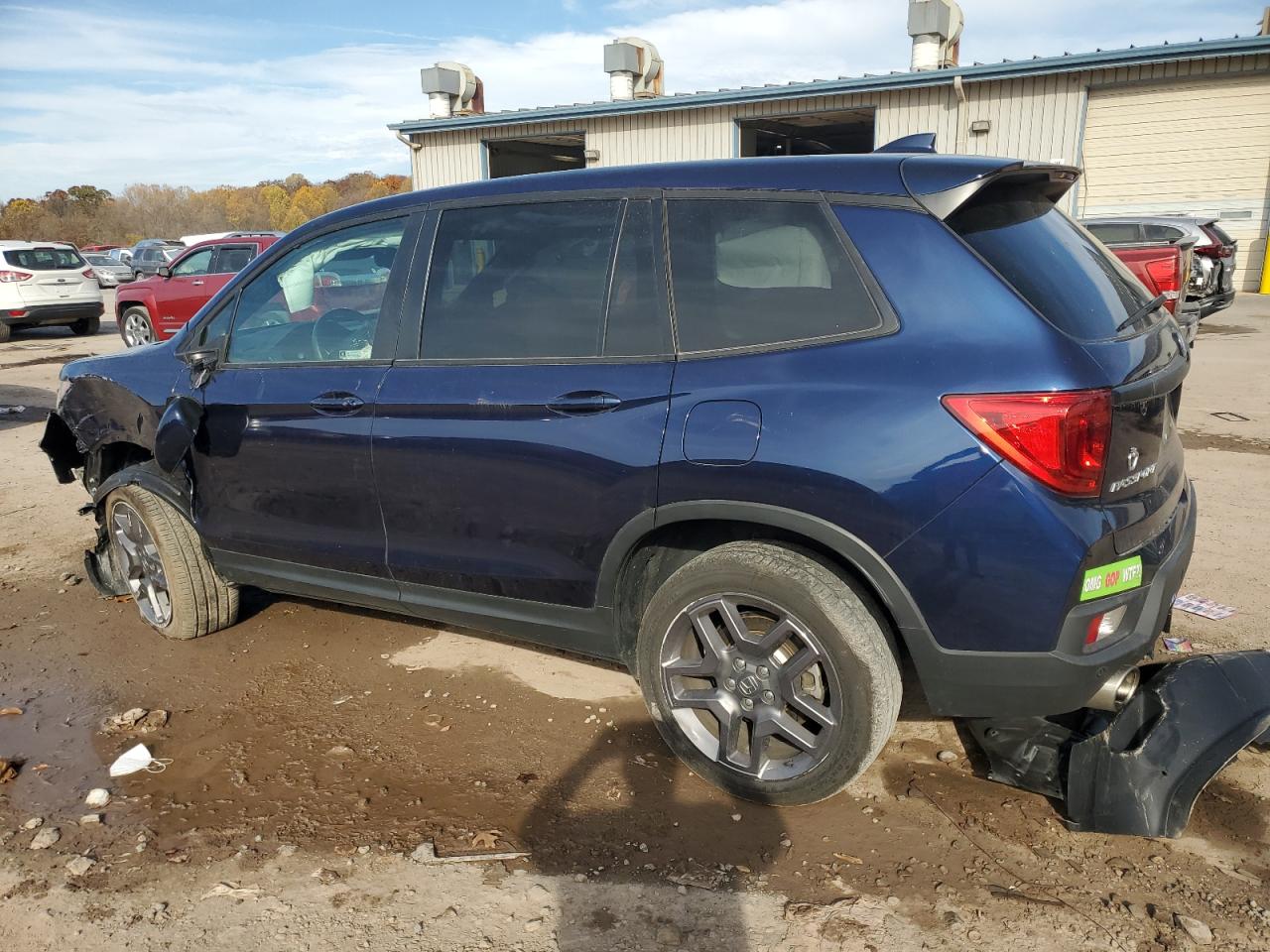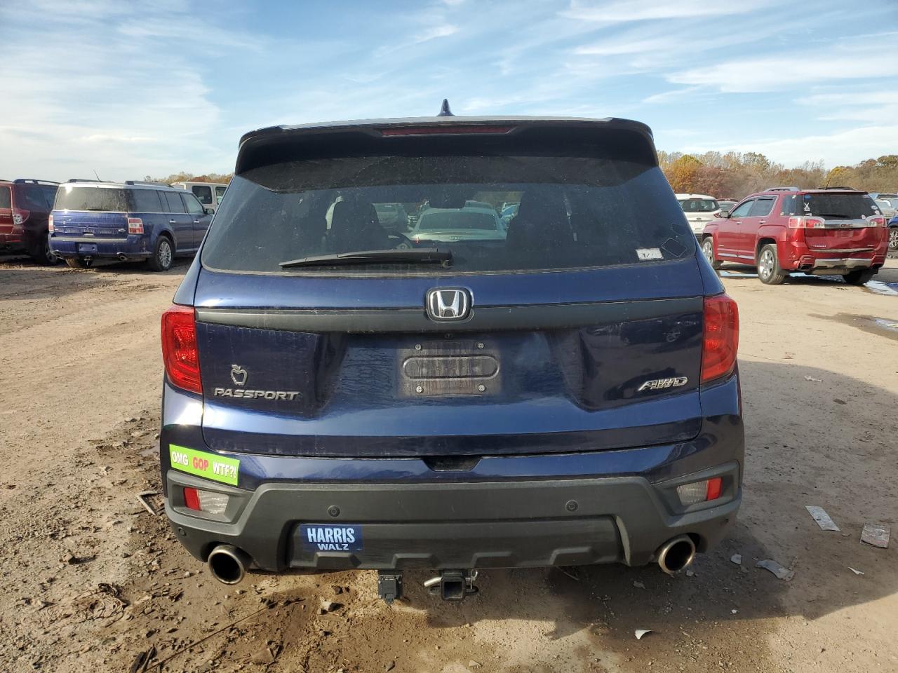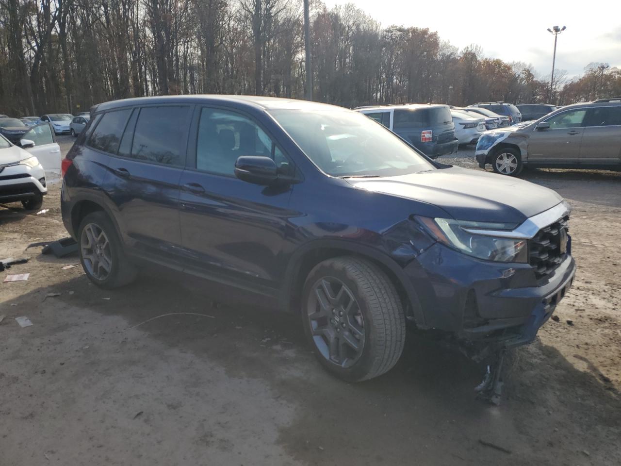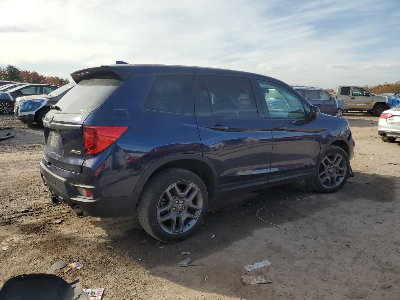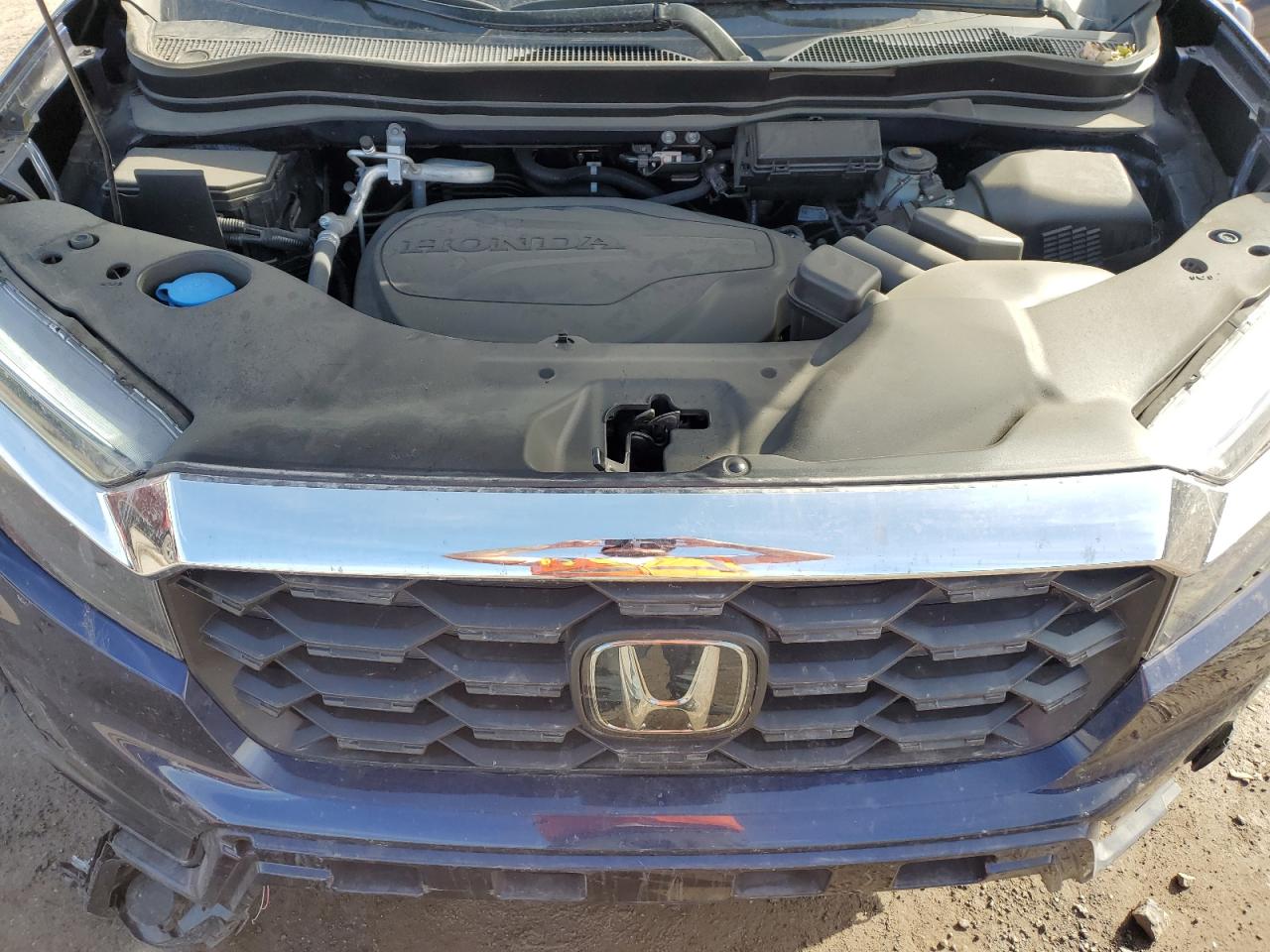 FairThis is a damaged 2023 Honda Passport. The primary damage is to the front end, with secondary minor dents and scratches. The car is blue and has a Run & Drive Verified status. The front end damage includes significant damage to the front bumper, fender, and likely the hood. The driver's side wheel is damaged. Interior images reveal deployed airbags. The car shows signs of damage to the front, rear and some other parts, but the overall condition is repairable.