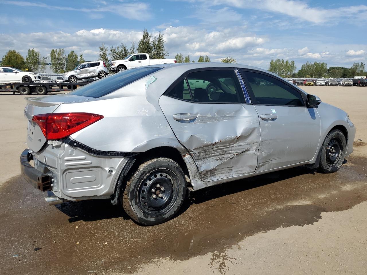 Fair2018 TOYOTA COROLLA L. Gray color. Run & Drive Verified. Primary damage: SIDE. Secondary damage: REAR END. The car has significant damage to the side and rear end. Wheels appear to be in good condition. Lights and glasses seem intact.