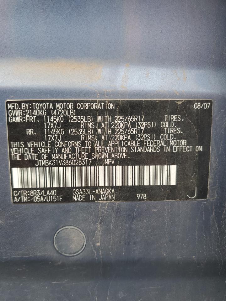 GoodThe 2008 Toyota RAV4 Limited is blue. The vehicle shows signs of normal wear and tear. The exterior has minor to moderate damage and would require some elements to be replaced. The interior has moderate visible damage. The wheels appear to be in good condition, and there is no mechanical damage. The car is drivable.
