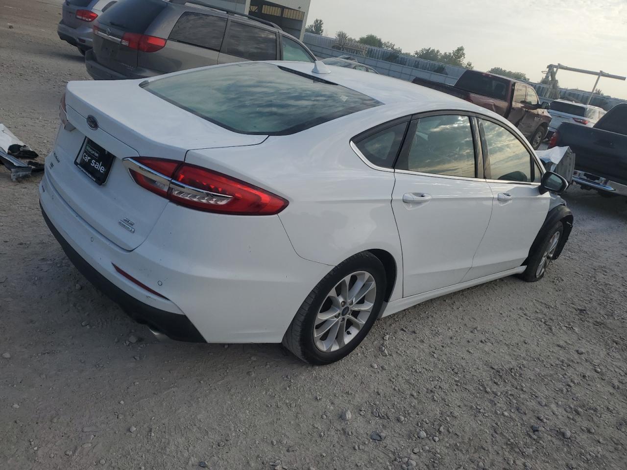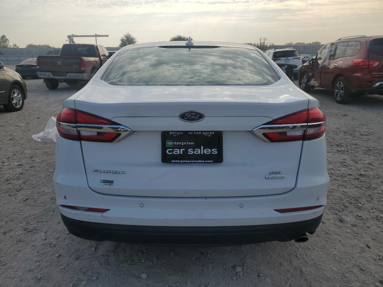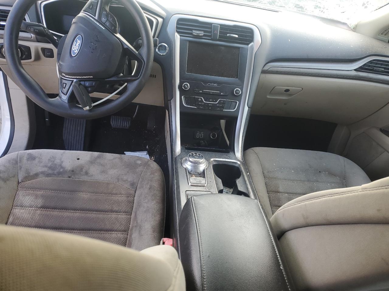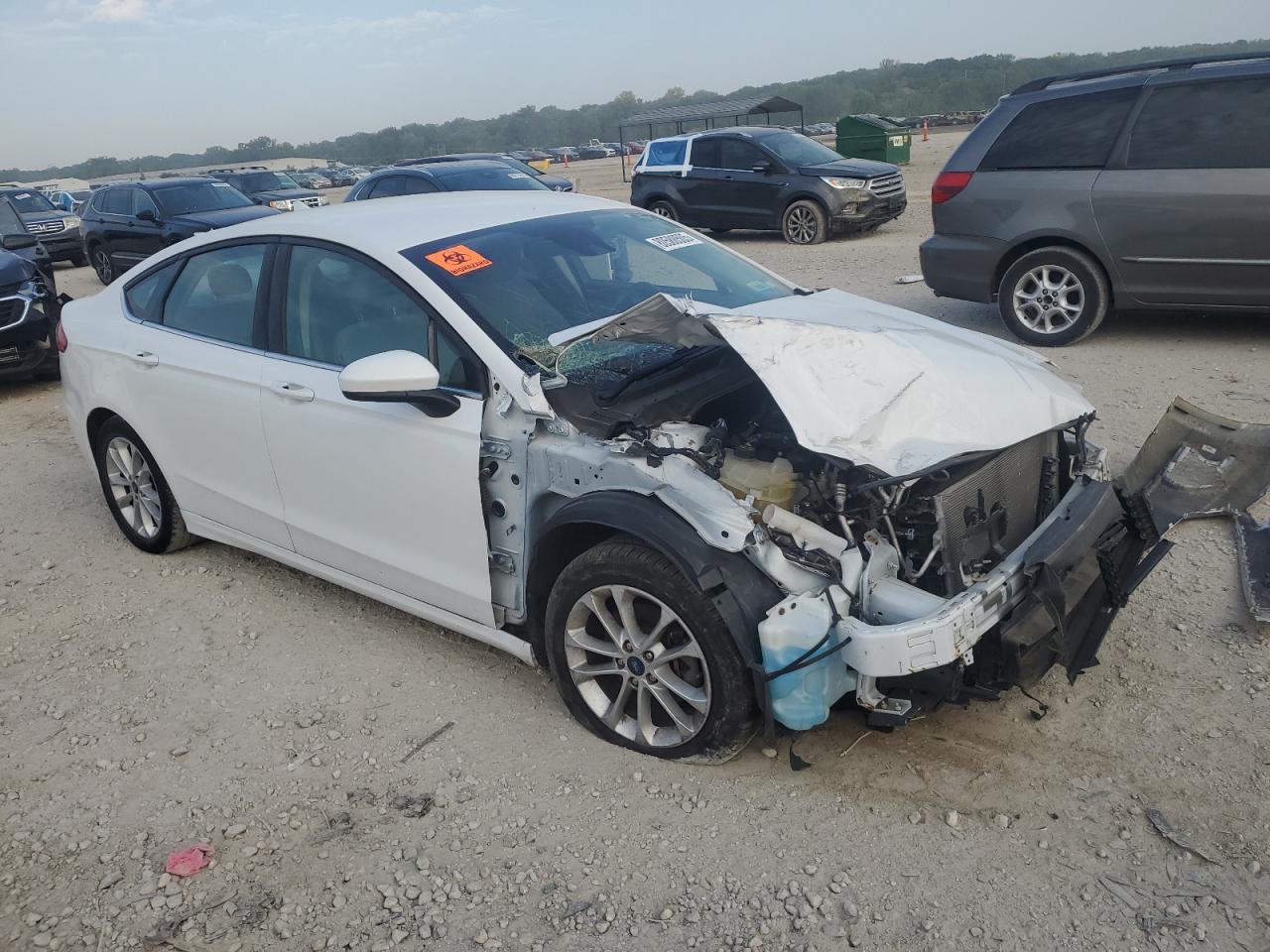 FairThis white 2020 Ford Fusion SE shows significant front-end damage, indicating a collision. The body panels are affected. The interior shows wear and tear. The car is a Run & Drive Verified vehicle. The damage might require considerable repair to be drivable.