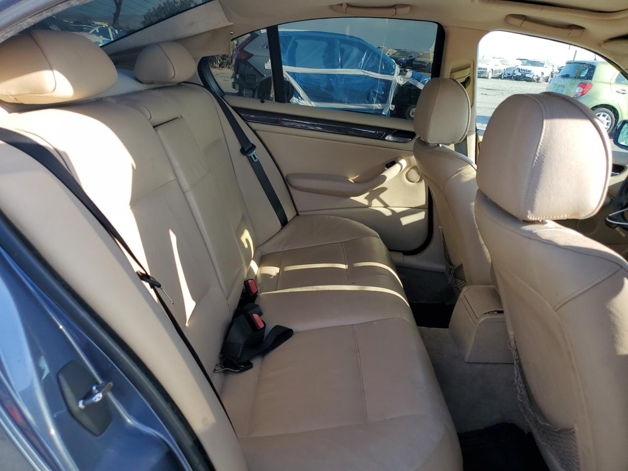 The primary damage is to the side of the vehicle, with no secondary damage indicated. The blue exterior has visible dents. The wheels, lights, and glasses appear to be intact, but the overall condition suggests that the car requires repairs. Interior shows wear and damages on the seat.