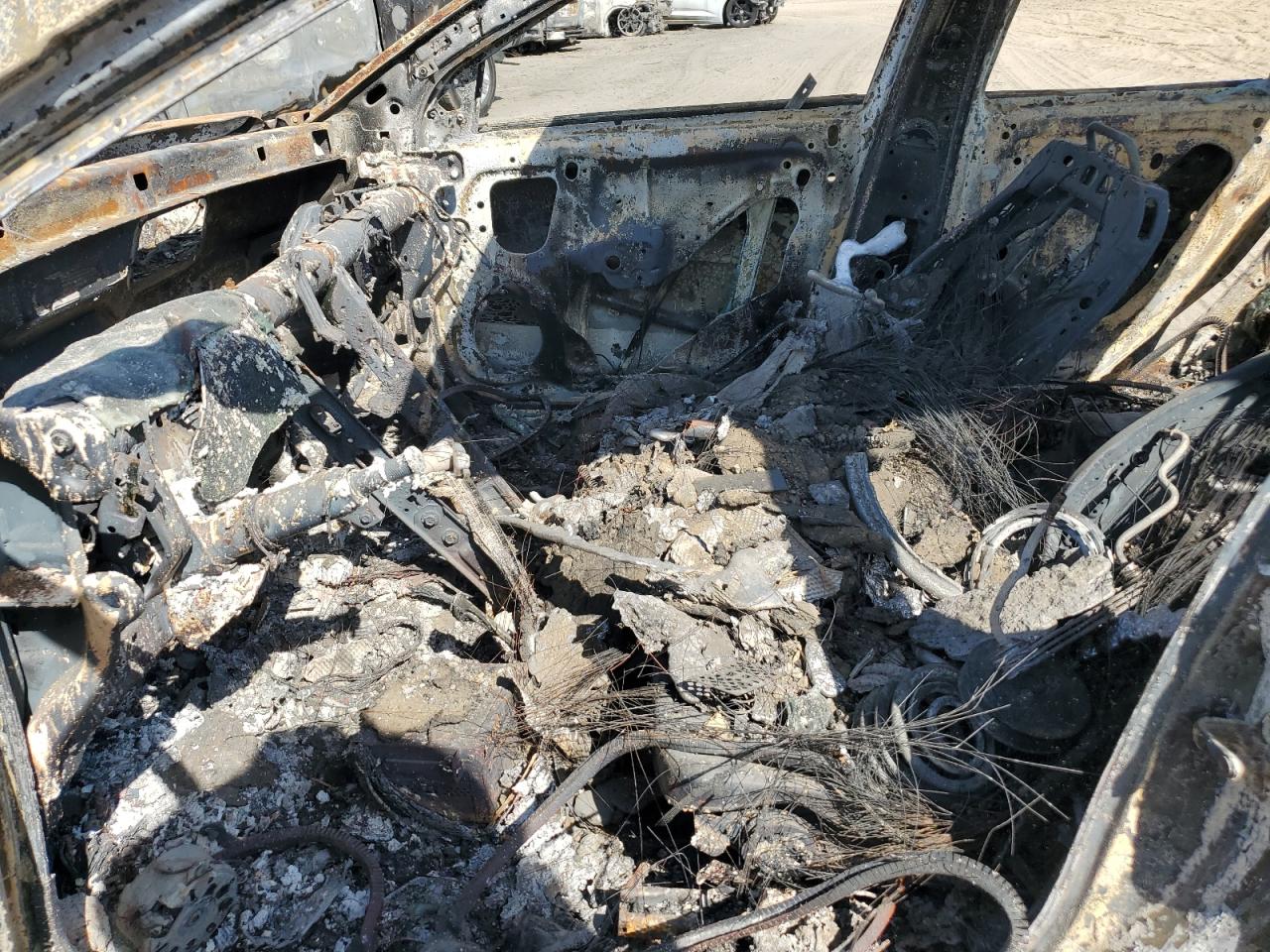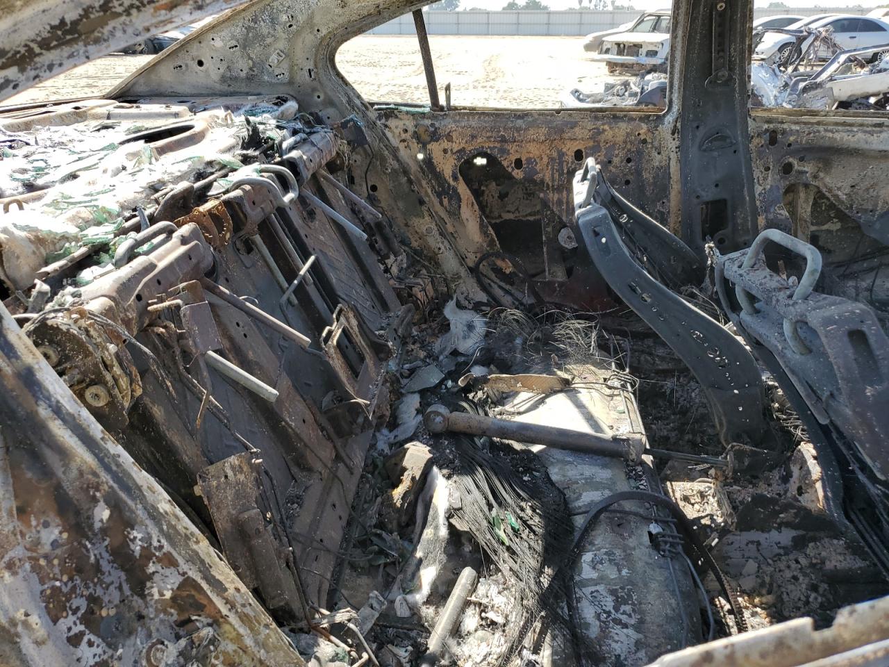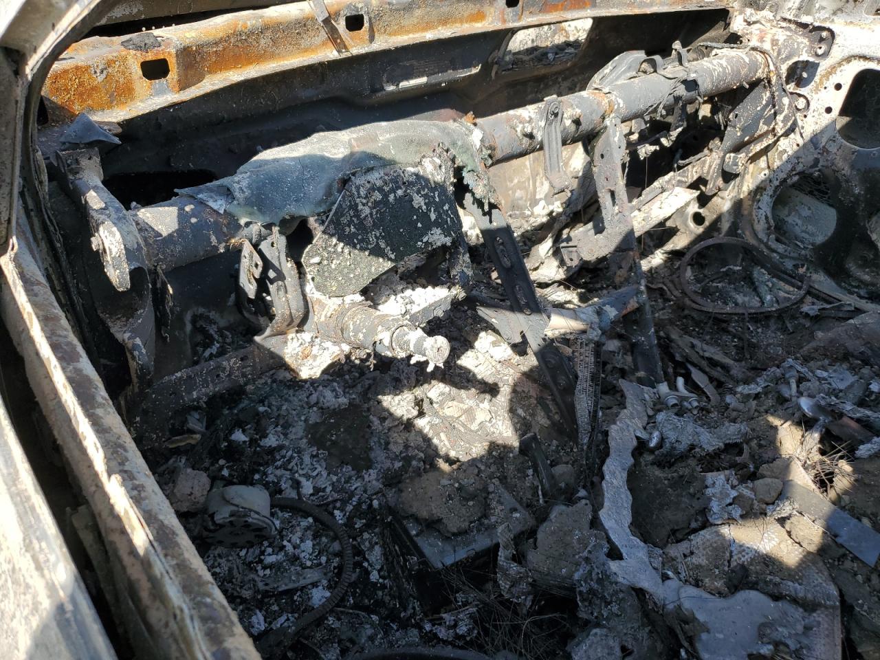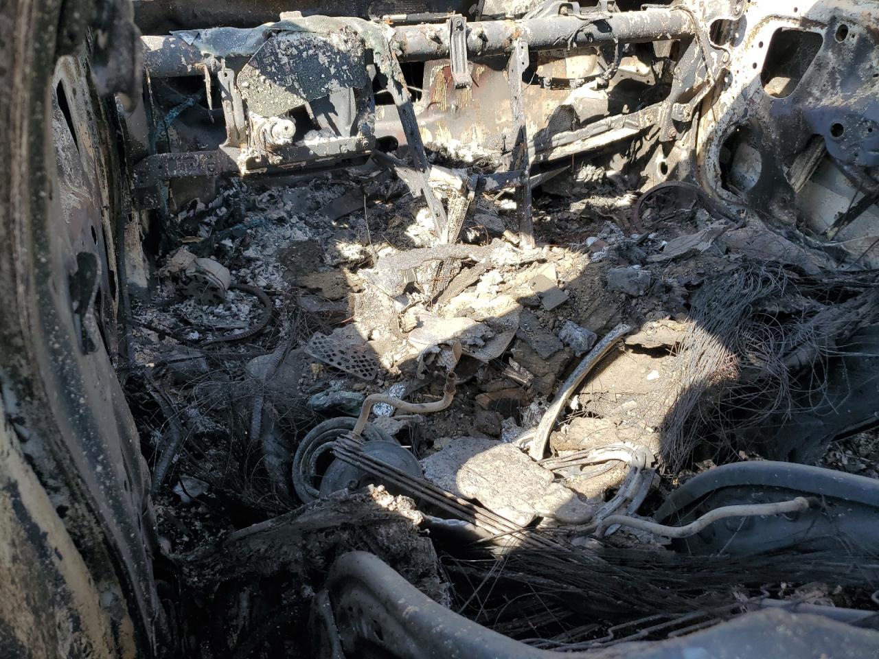 The vehicle exhibits severe burn damage across its body. The wheels, lights, and glass are significantly affected. The interior is completely destroyed, with visible damage to the dashboard, seats, and other components. The airbags, if present, are likely deployed or damaged.