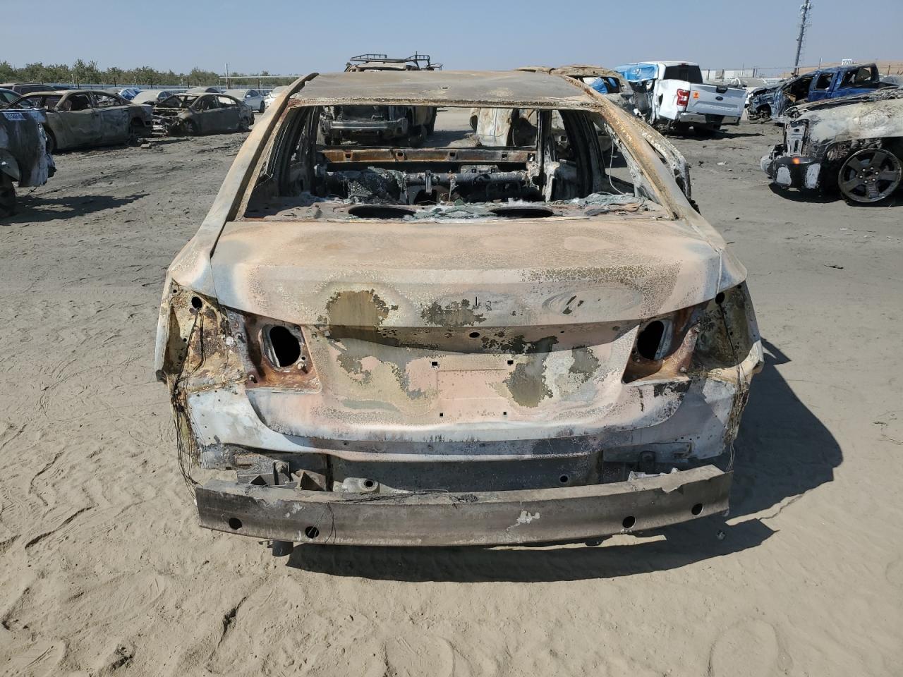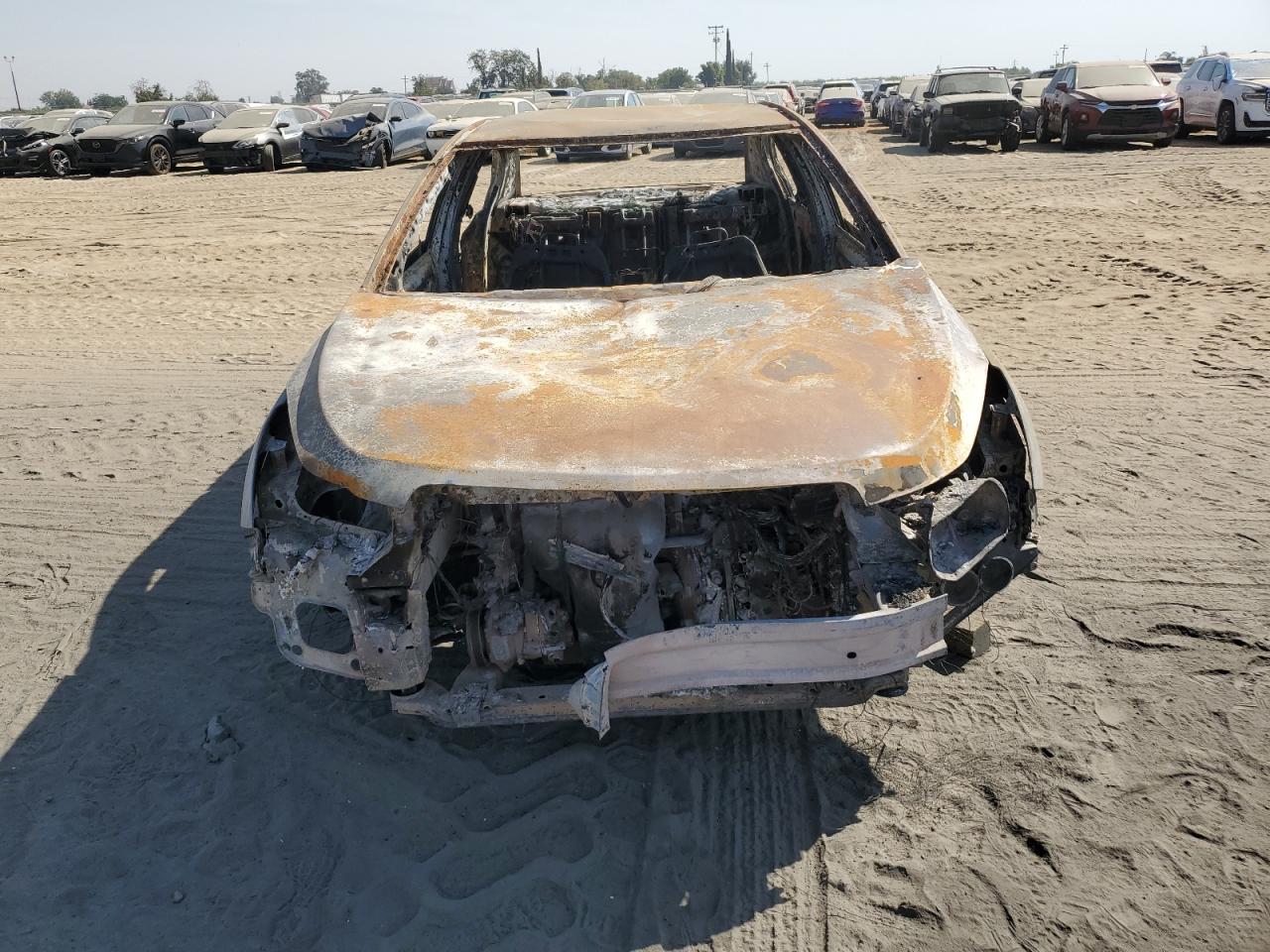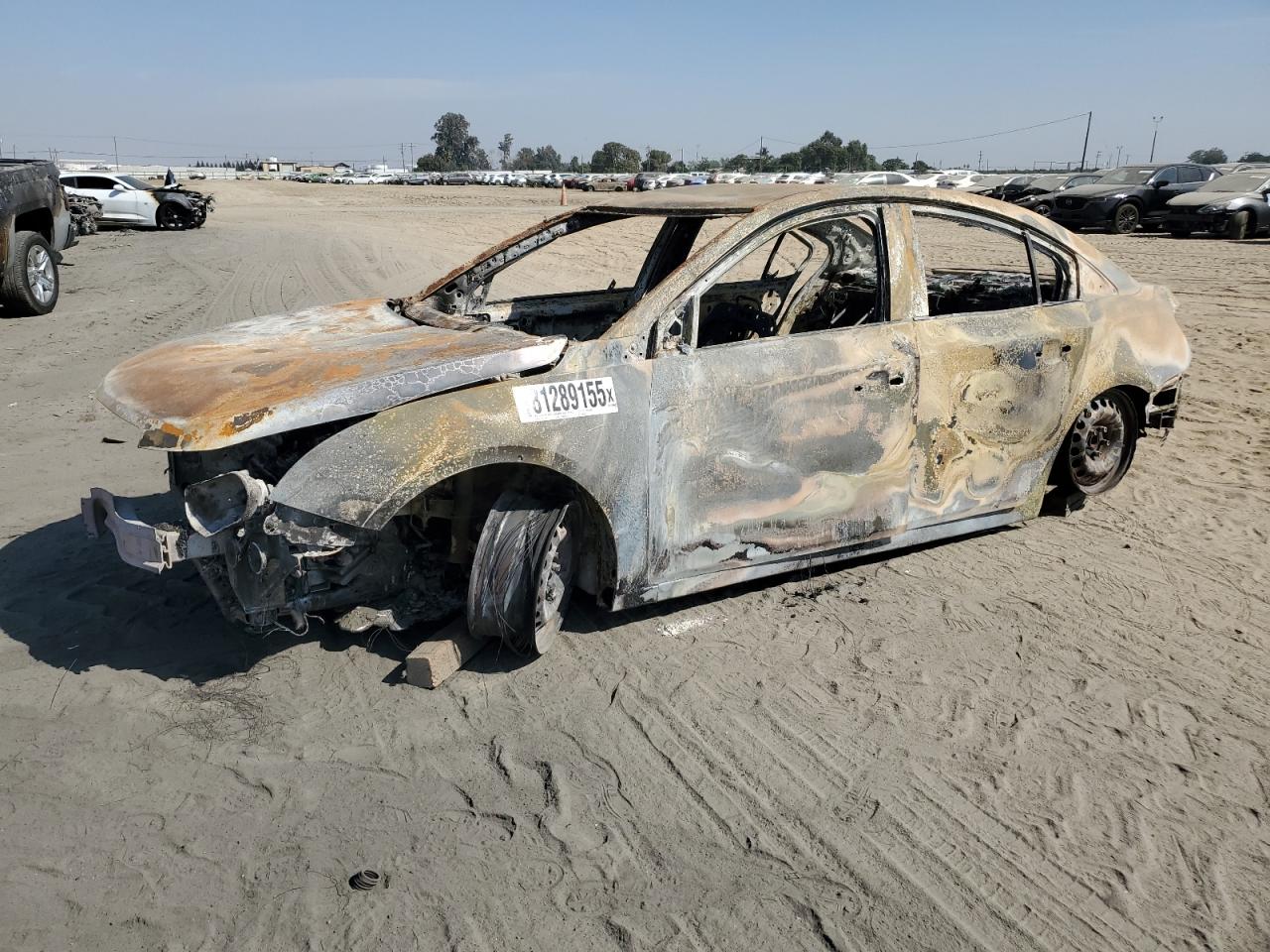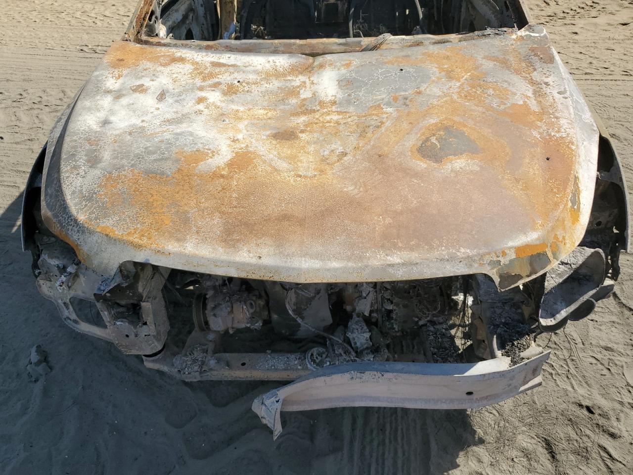 The vehicle exhibits severe burn damage across its body. The wheels, lights, and glass are significantly affected. The interior is completely destroyed, with visible damage to the dashboard, seats, and other components. The airbags, if present, are likely deployed or damaged.
