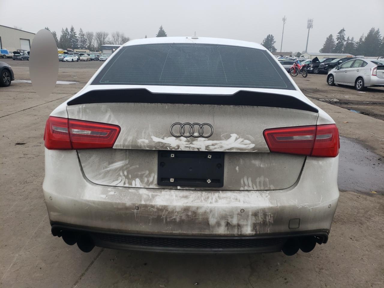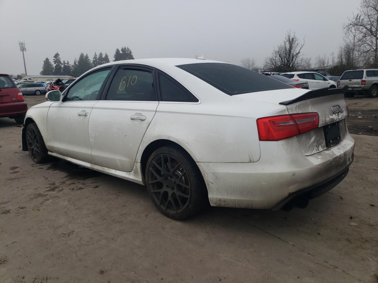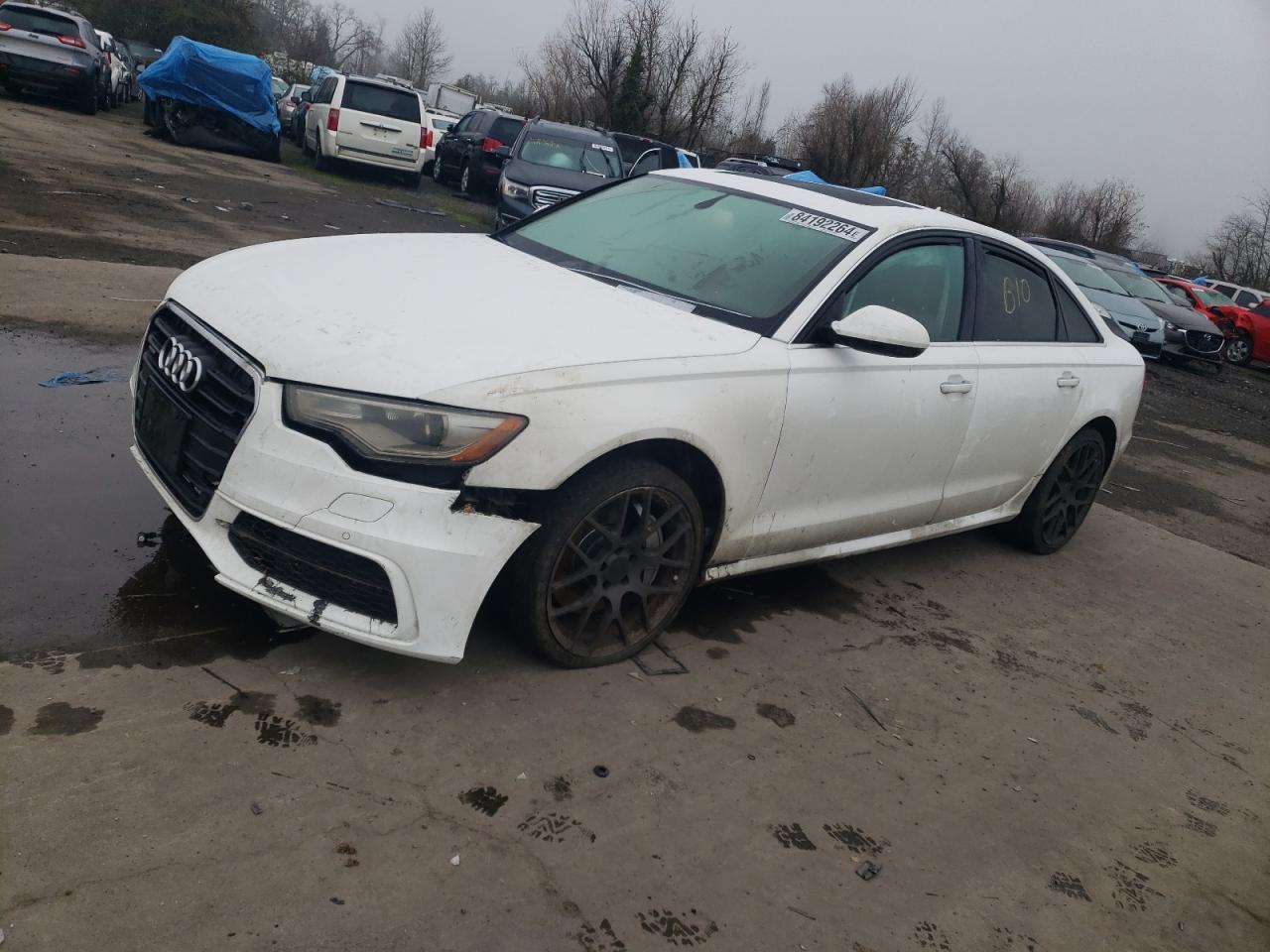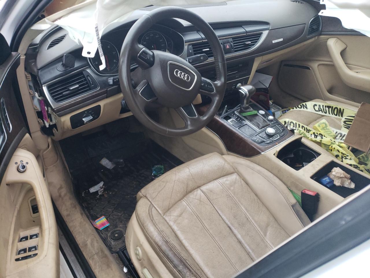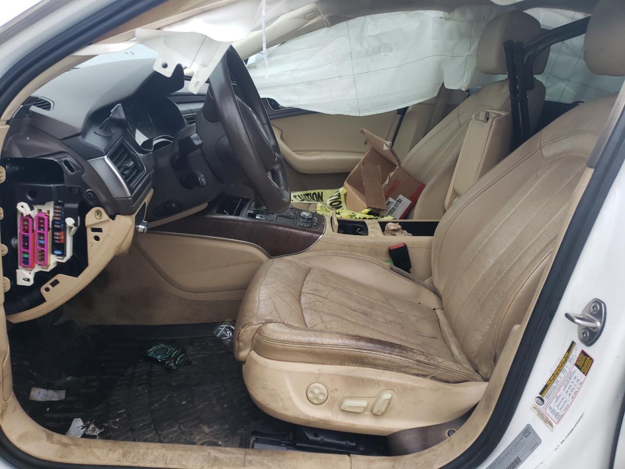 FairThe 2012 Audi A6 Prestige is white with visible damage. The primary damage is to the undercarriage, with secondary damage to the front end. The exterior shows significant damage, while the interior condition is poor, with possible airbag deployment.