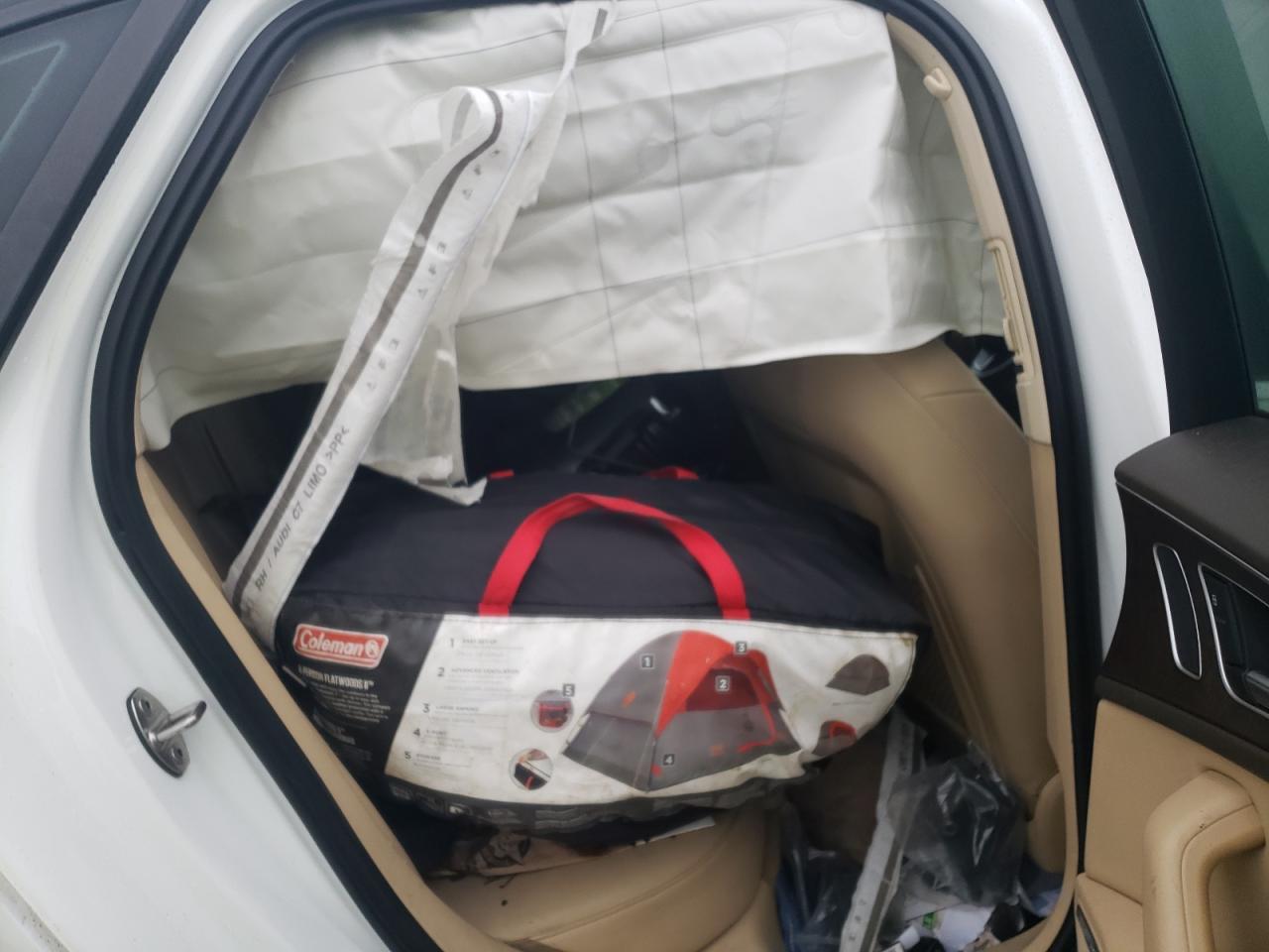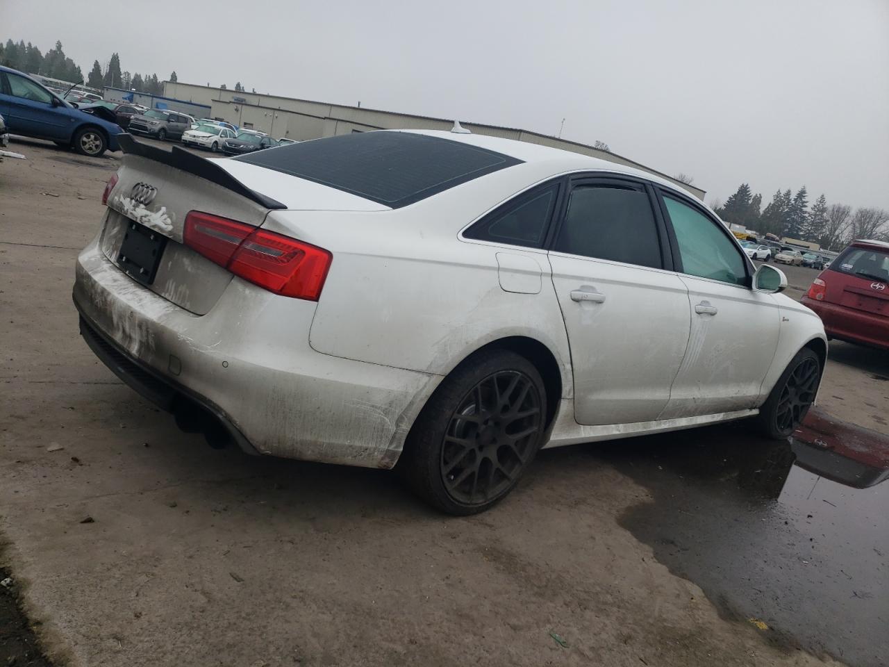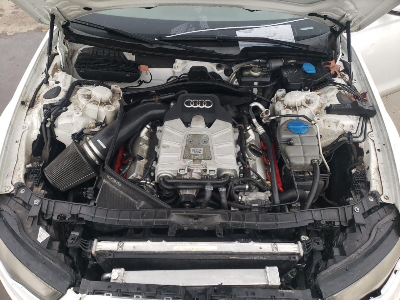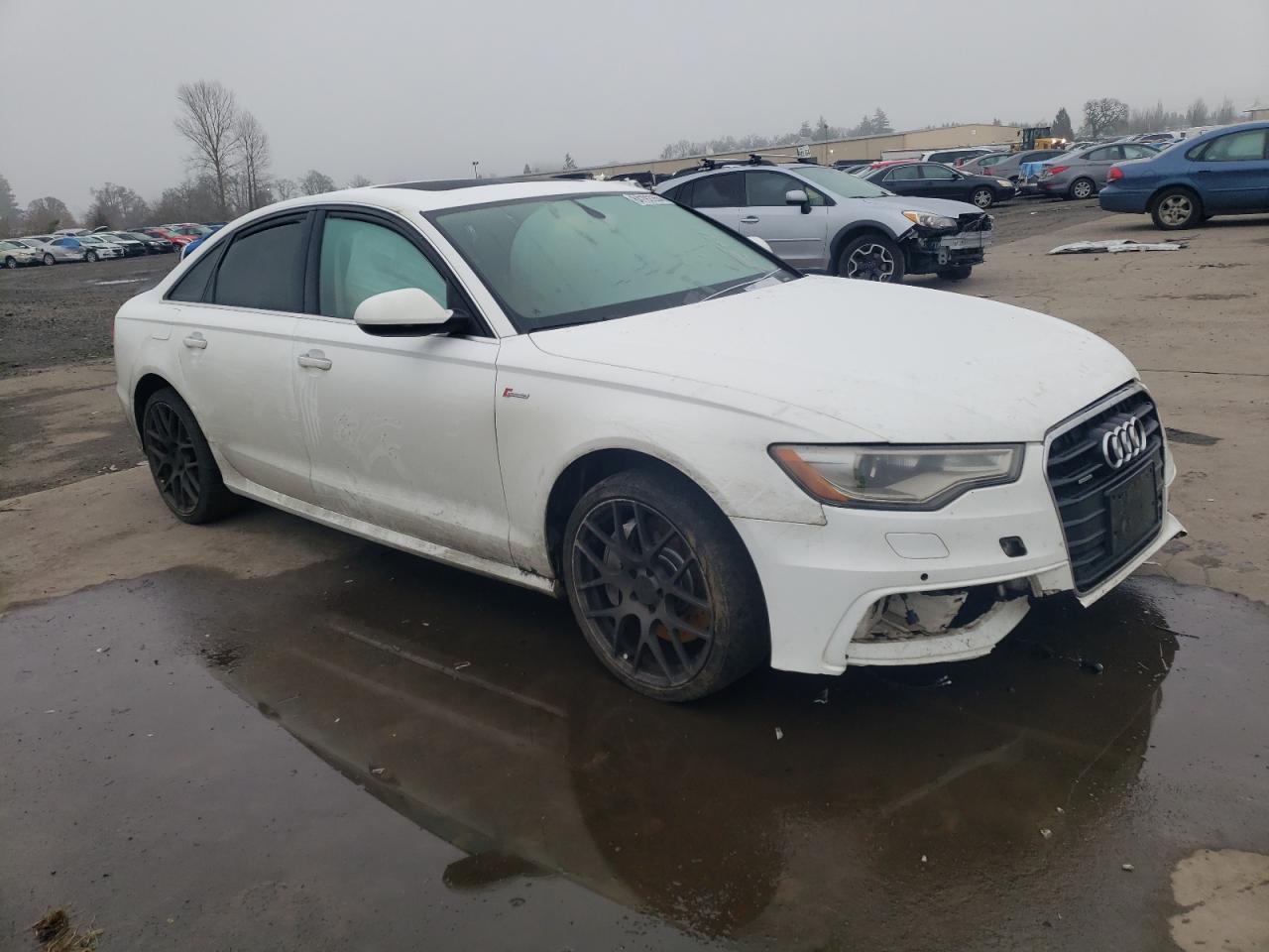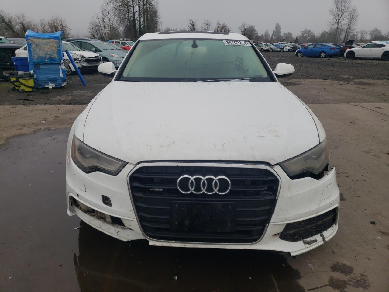 FairThe 2012 Audi A6 Prestige is white with visible damage. The primary damage is to the undercarriage, with secondary damage to the front end. The exterior shows significant damage, while the interior condition is poor, with possible airbag deployment.
