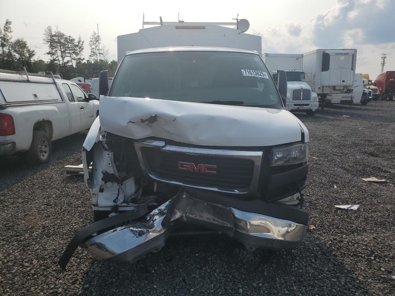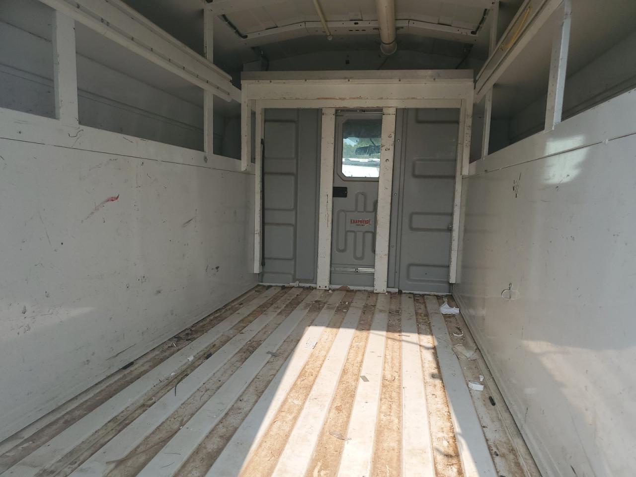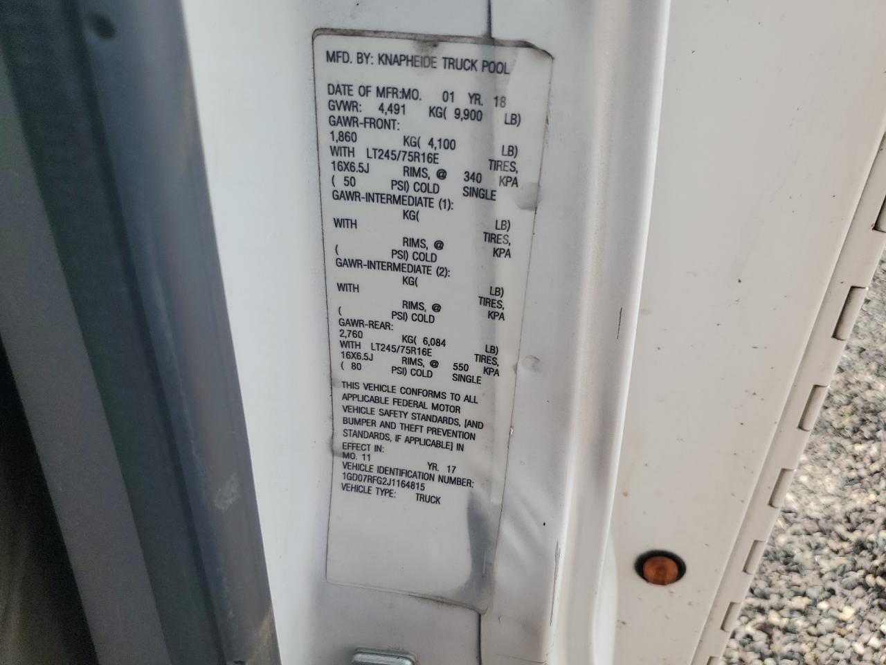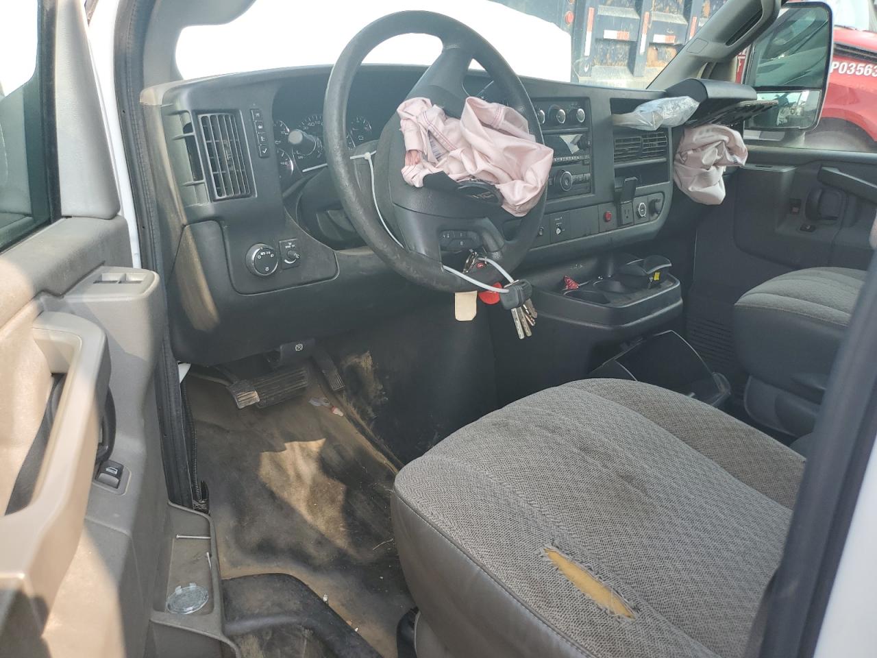 FairThis is a 2018 GMC Savana Cutaway, with visible front-end damage. The primary damage is at the front, with secondary minor dents and scratches across the body. The vehicle is white. The wheels appear to be intact. Lights and glasses show no apparent damage. The interior shows signs of wear. The airbags have deployed.
