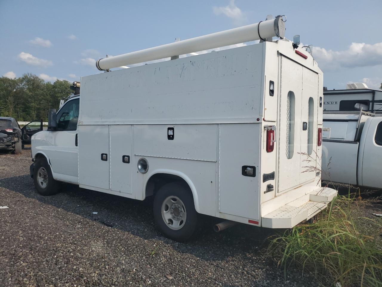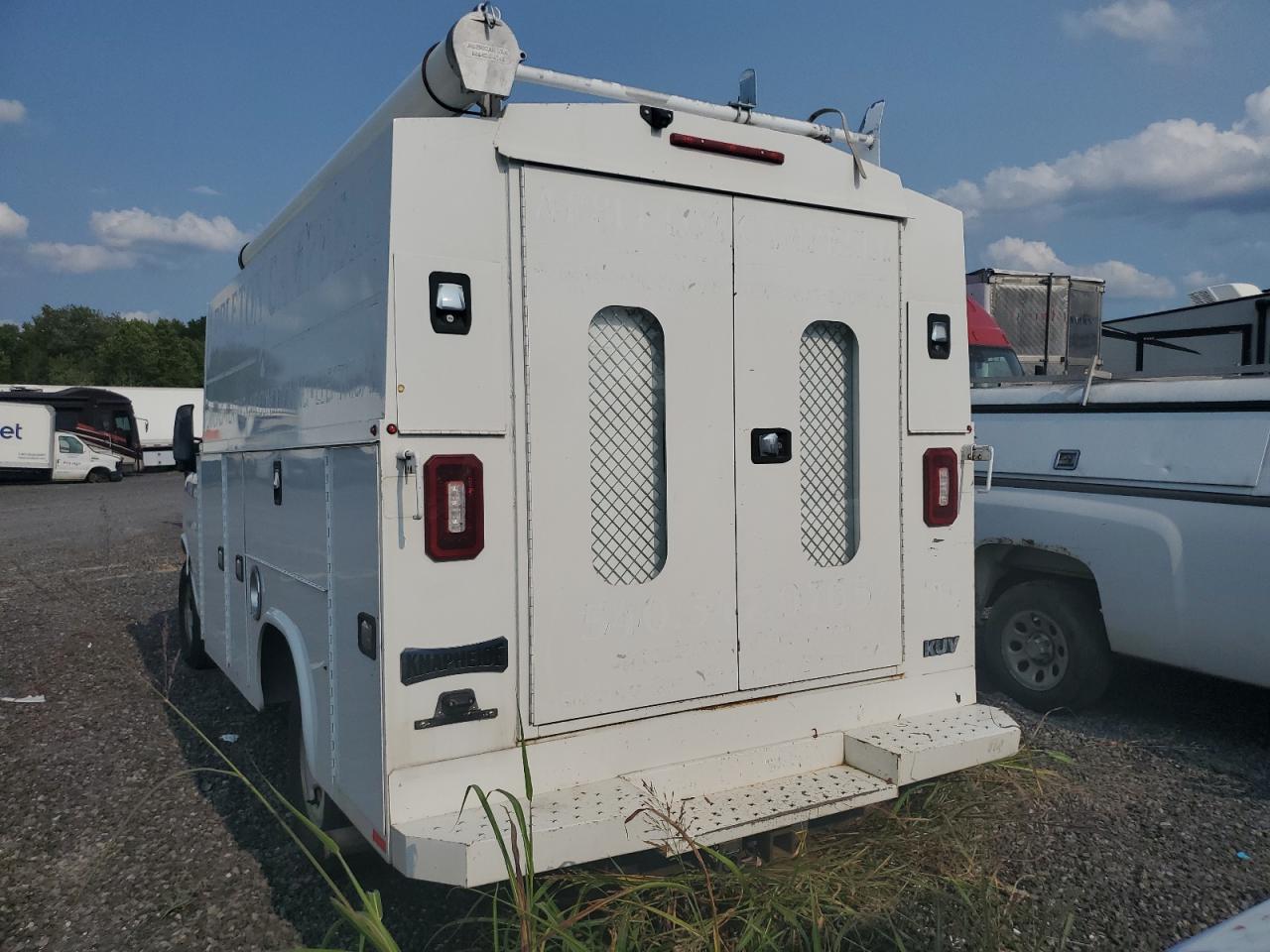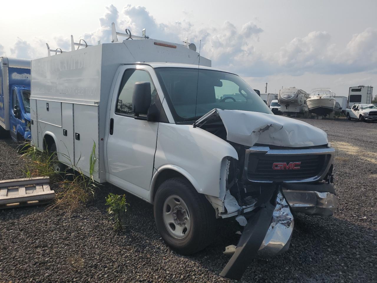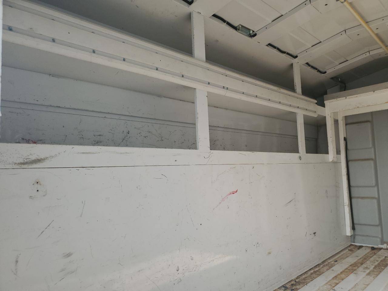 FairThis is a 2018 GMC Savana Cutaway, with visible front-end damage. The primary damage is at the front, with secondary minor dents and scratches across the body. The vehicle is white. The wheels appear to be intact. Lights and glasses show no apparent damage. The interior shows signs of wear. The airbags have deployed.