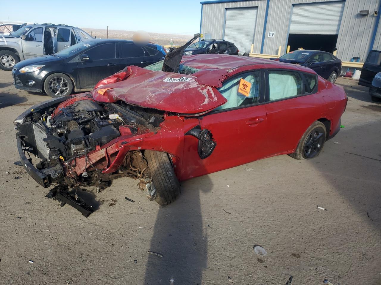 Severe rollover damage to a red 2025 KIA K4 LX. Extensive body damage, likely frame damage, and interior damage with deployed airbags. The vehicle is in poor condition.