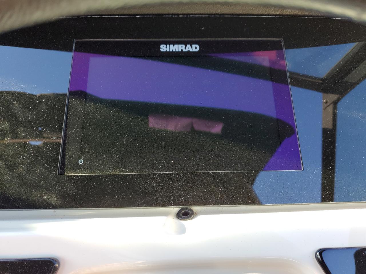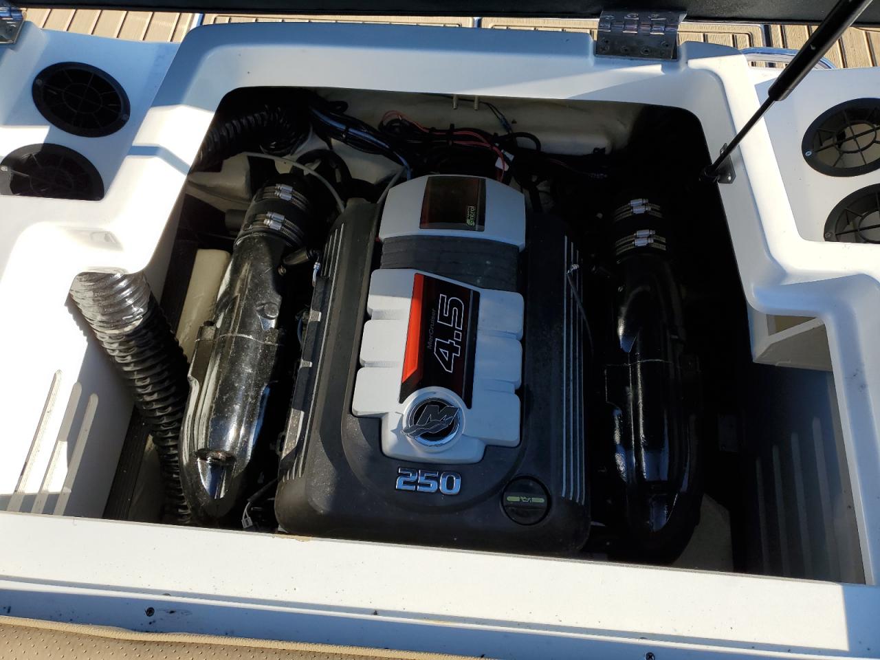 The boat has sustained water damage, affecting the interior and potentially the engine. The top/roof is also damaged. Exterior damage includes body panel issues. The interior has visible damage, possibly including upholstery and electronic components. The boat's condition suggests it has been significantly affected by the flood.