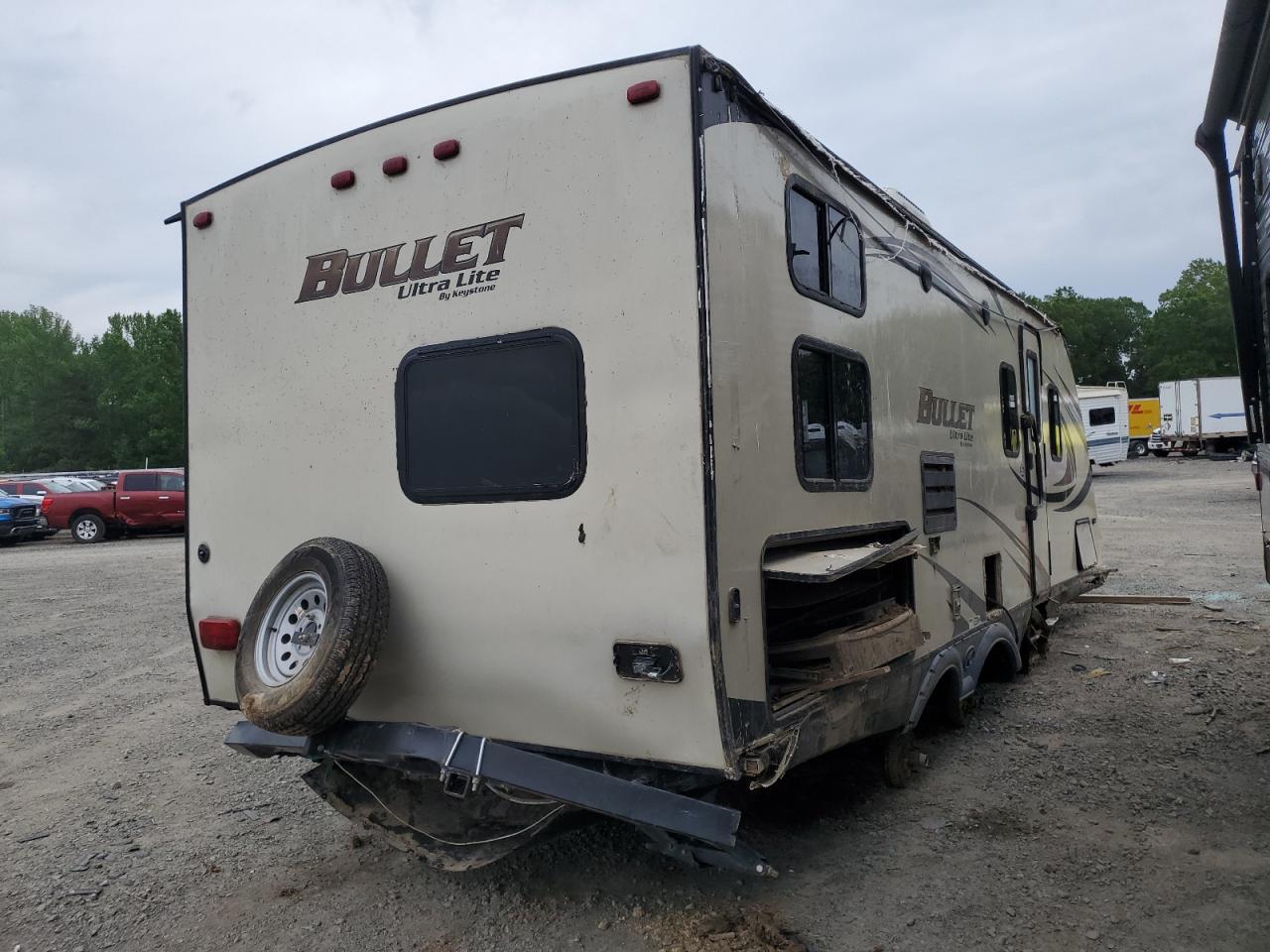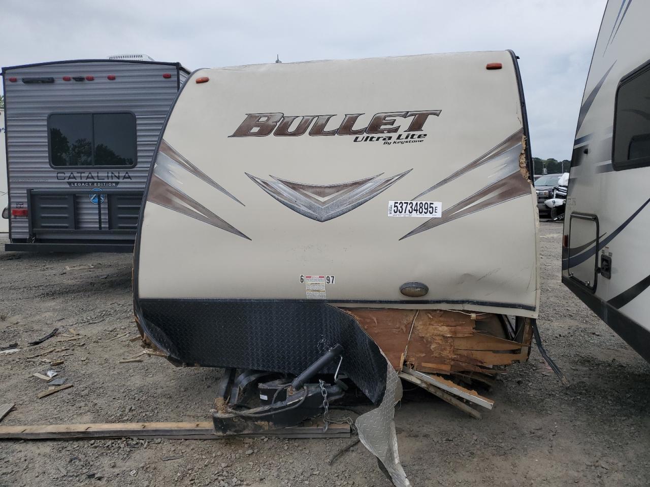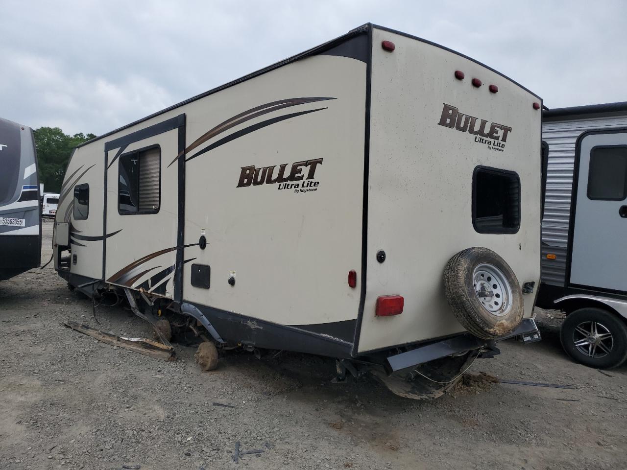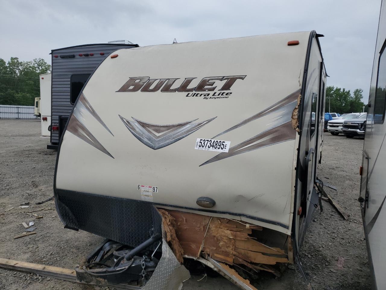 The KEYSTONE BULLET RV exhibits extensive damage. The front and rear portions of the body have suffered severe impact damage, including significant structural deformation. The exterior panels show signs of impact and water damage, indicating it has been subjected to flooding. The interior also has water damage.
