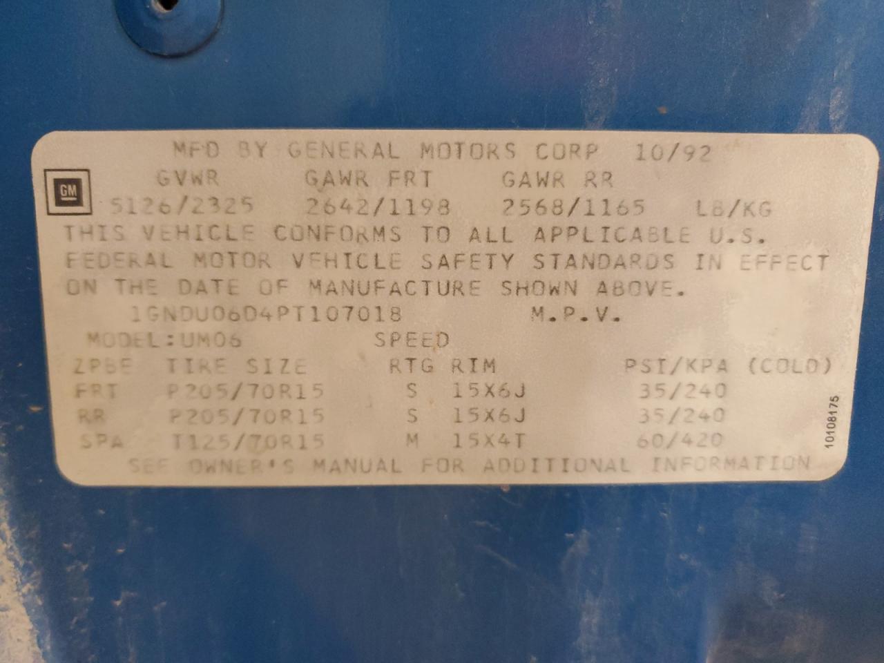FairThe 1993 CHEVROLET LUMINA APV is presented with significant damage. The primary damage is to the REAR END, with secondary damage to the SIDE. The vehicle's exterior is blue. The car starts and runs, and is verified as drivable. The vehicle shows considerable body damage, particularly at the rear, with noticeable dents and potential structural issues. The side panels also show signs of damage. All wheels appear to be deflated or damaged. Glass appears to be intact. The interior shows moderate wear and tear with no visible damages or the airbag.