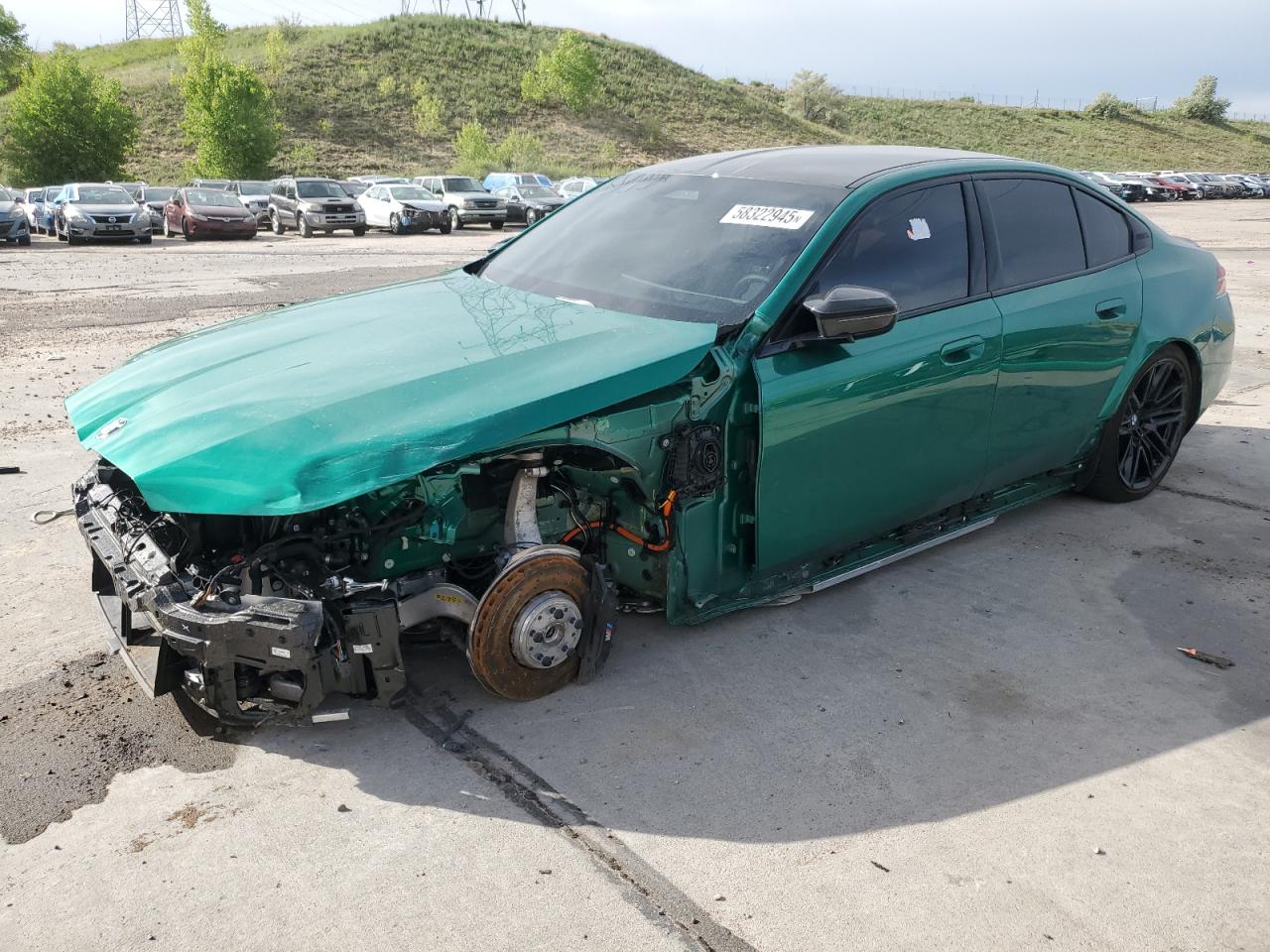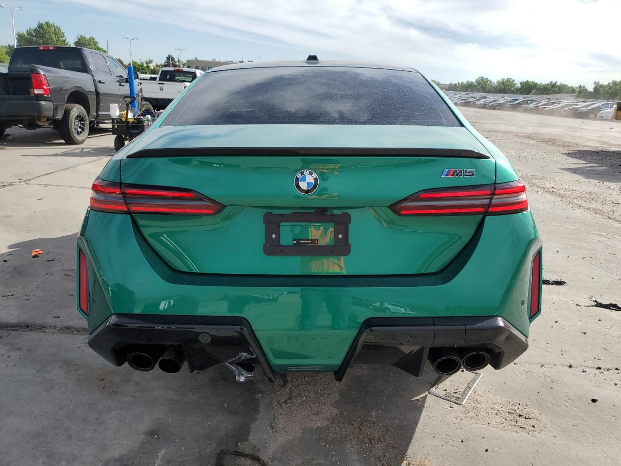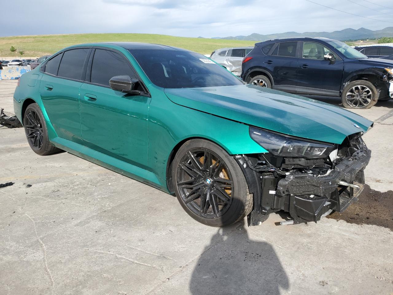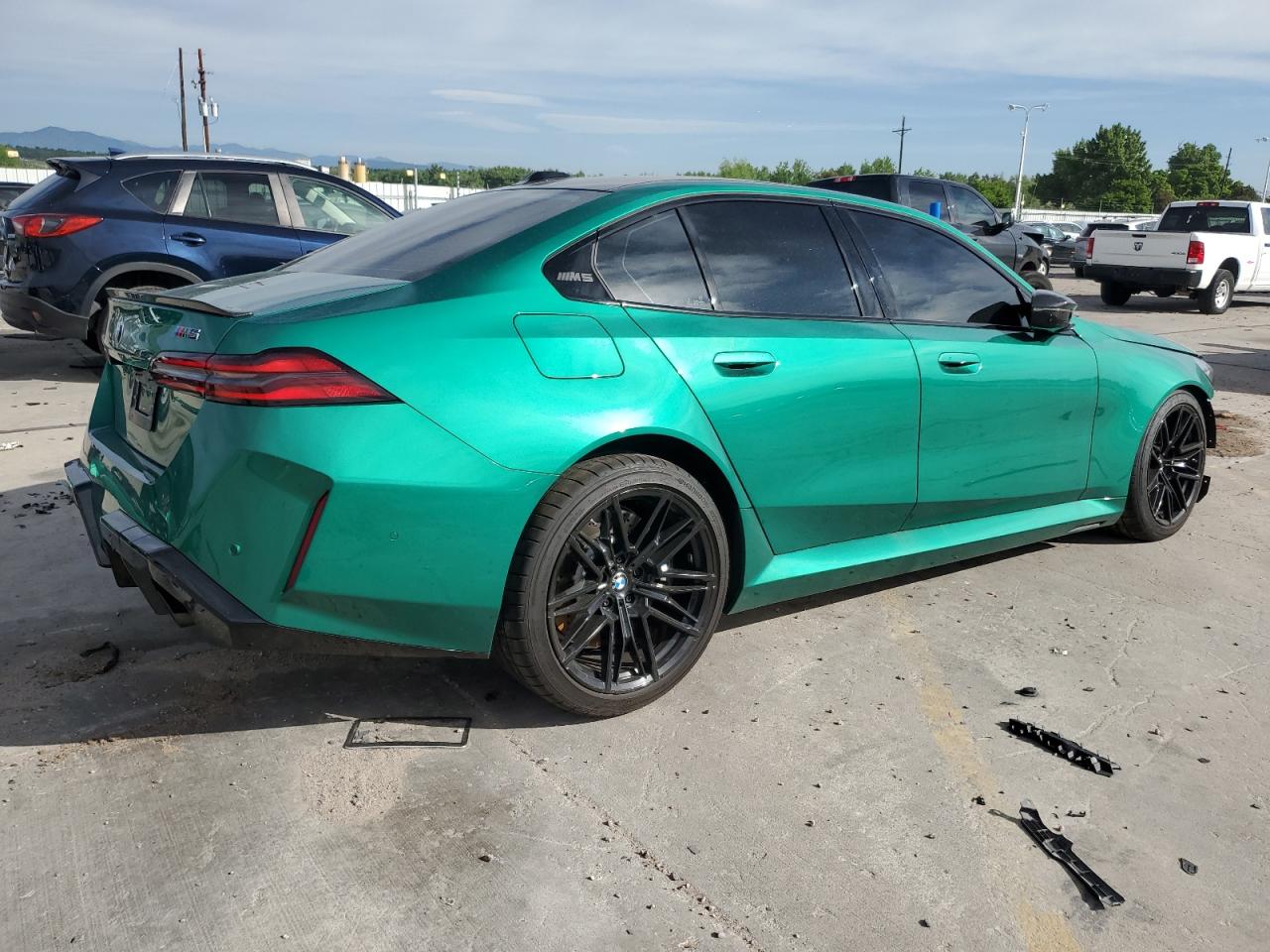 FairThis is a 2025 BMW M5 with significant front-end damage, appearing green in color. The vehicle's Run & Drive status is verified. The car has sustained extensive frontal impact. The front end is severely damaged, with components missing. The wheels appear intact, but the front lights and glasses may be compromised due to the crash. The interior shows signs of use with orange seats, suggesting it's in good condition.