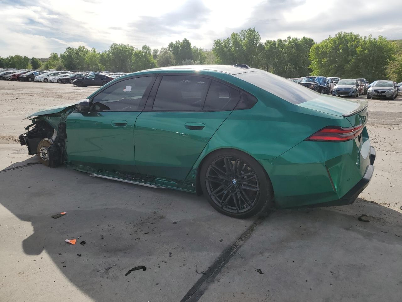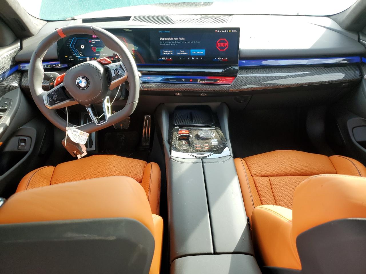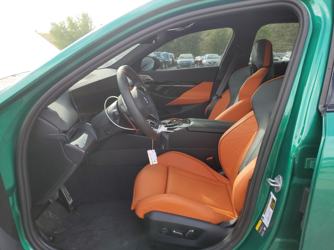 FairThis is a 2025 BMW M5 with significant front-end damage, appearing green in color. The vehicle's Run & Drive status is verified. The car has sustained extensive frontal impact. The front end is severely damaged, with components missing. The wheels appear intact, but the front lights and glasses may be compromised due to the crash. The interior shows signs of use with orange seats, suggesting it's in good condition.