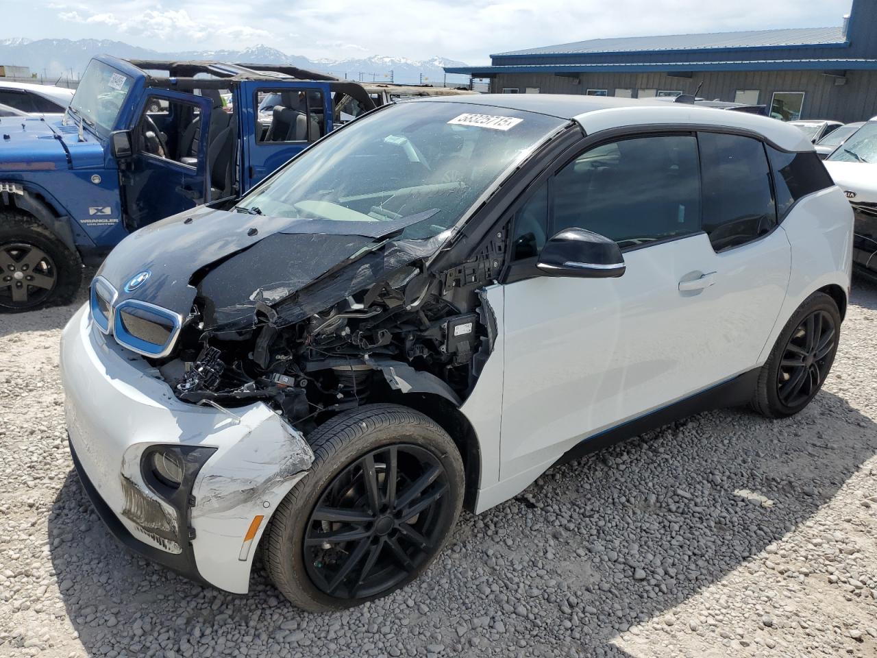 The BMW i3 REx has sustained considerable damage. The front end has a crumpled appearance, with the hood and bumper significantly impacted. The side panels show damage as well. The wheels and glass appear intact. The interior has normal wear, the airbags are not deployed.
