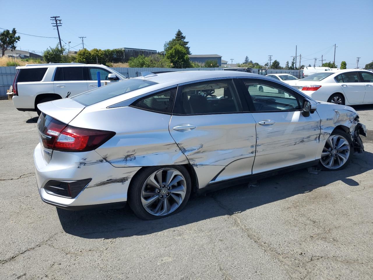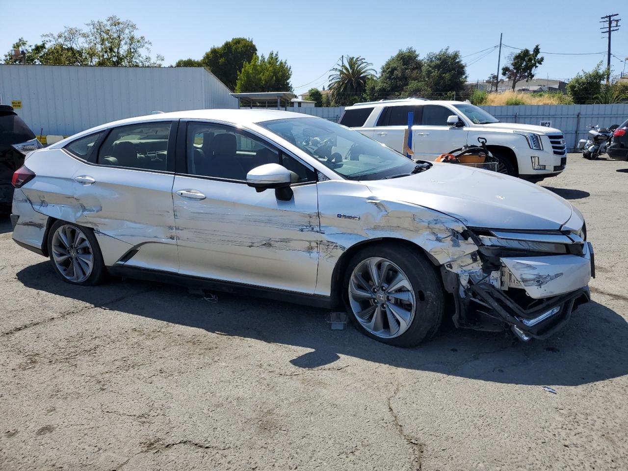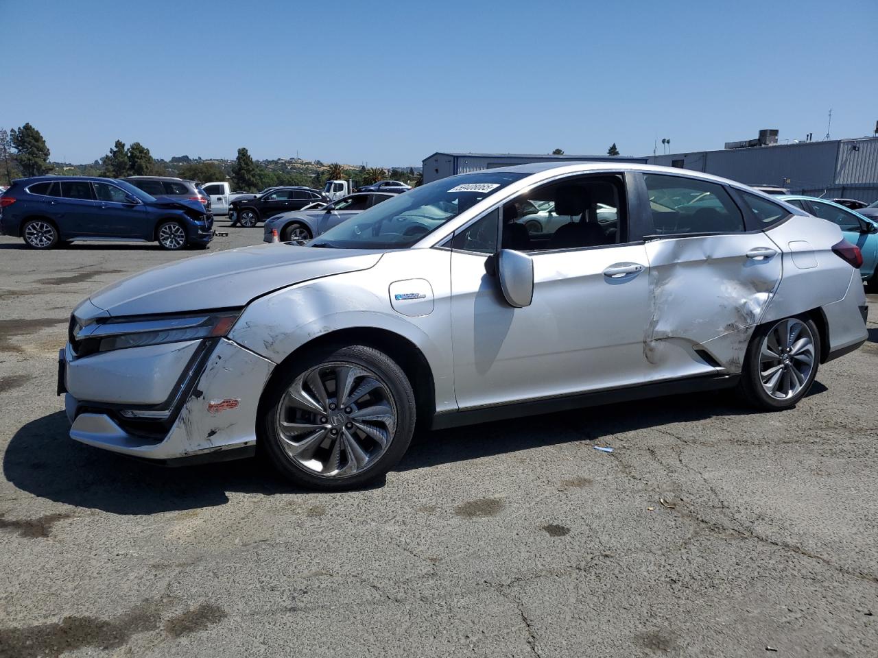 The Honda Clarity has extensive body damage, dents along the side and front end. The interior condition is in a good state with no airbag deployment visible. The wheels are intact, and glass components appear undamaged.