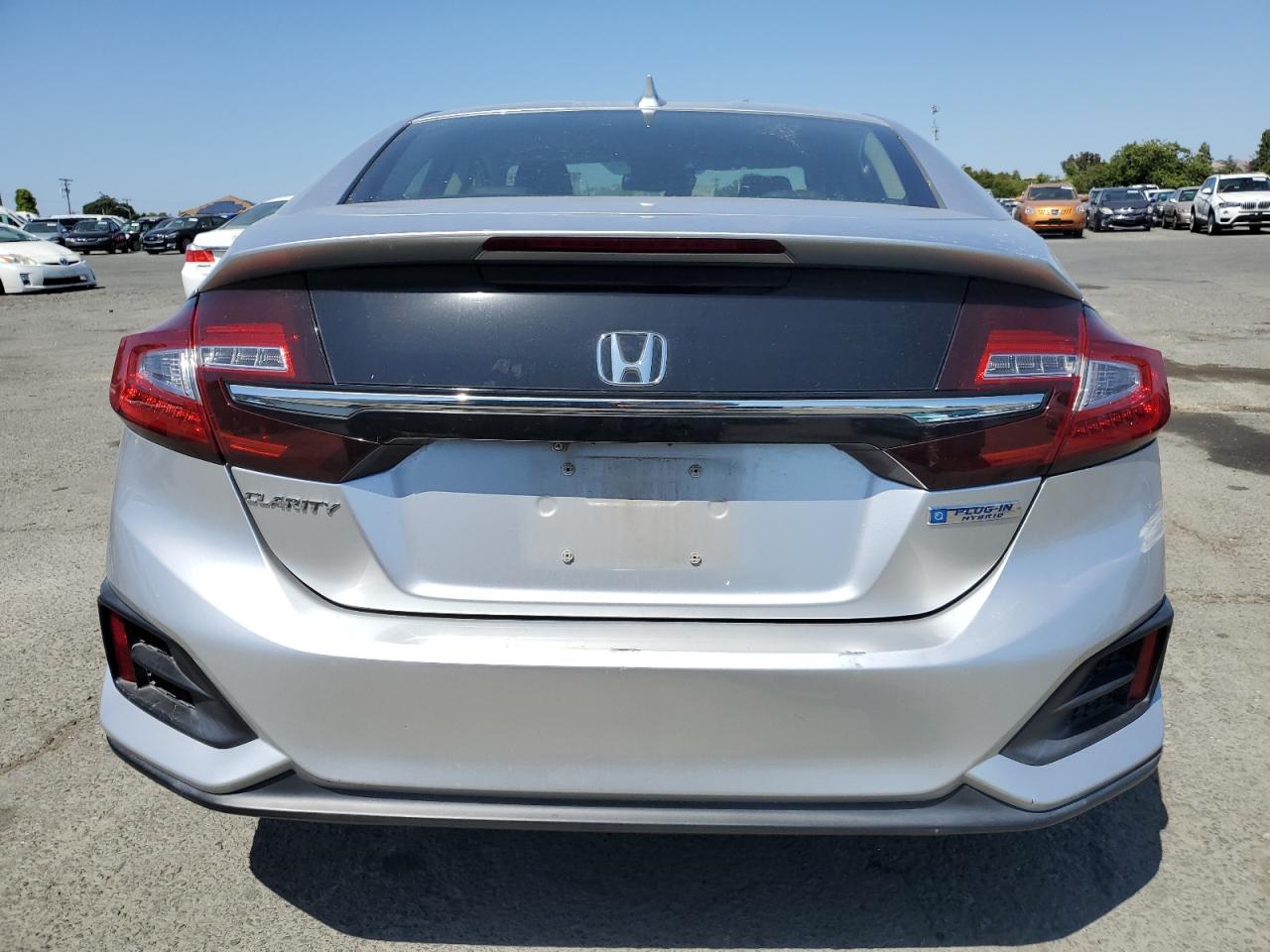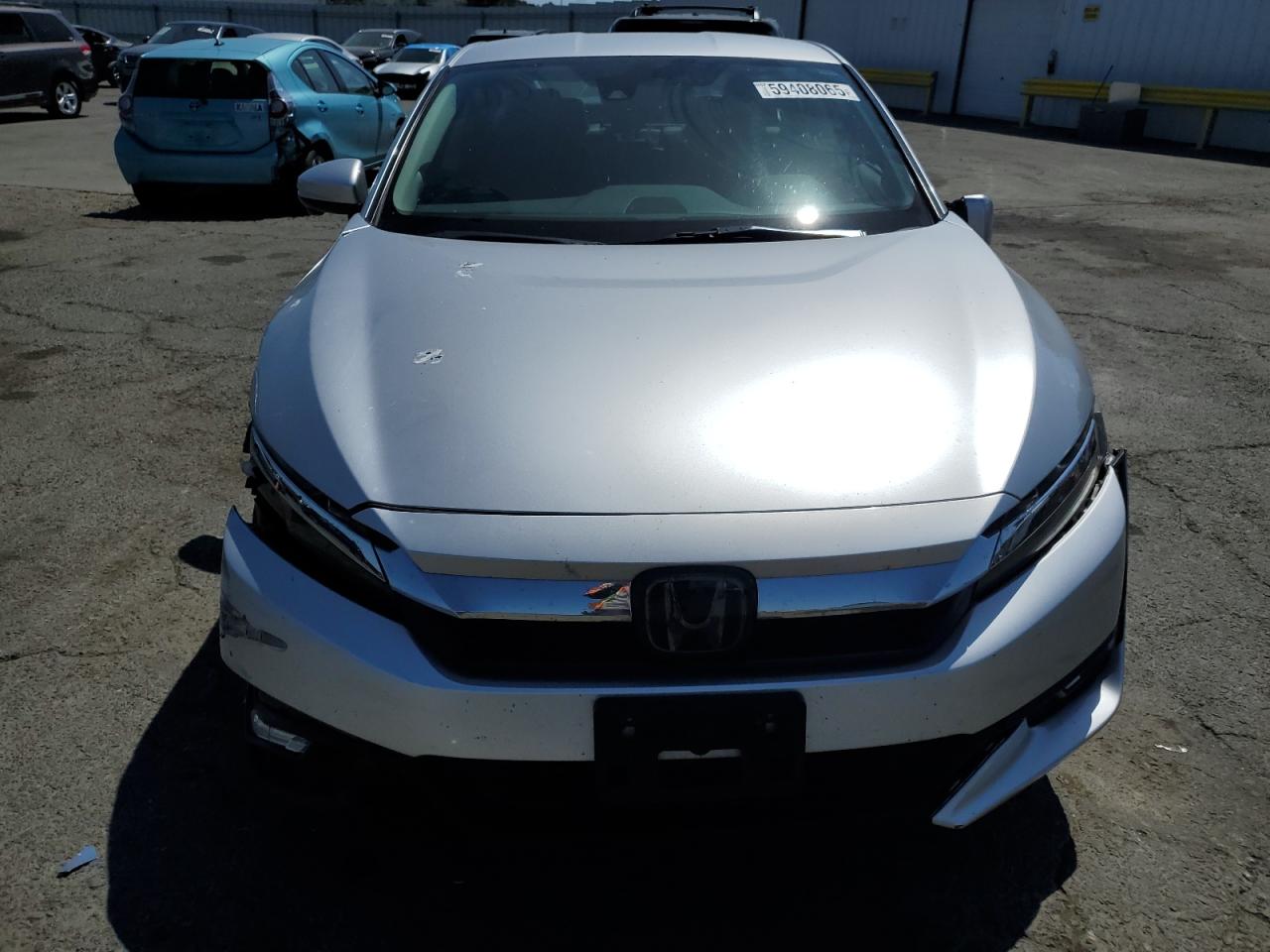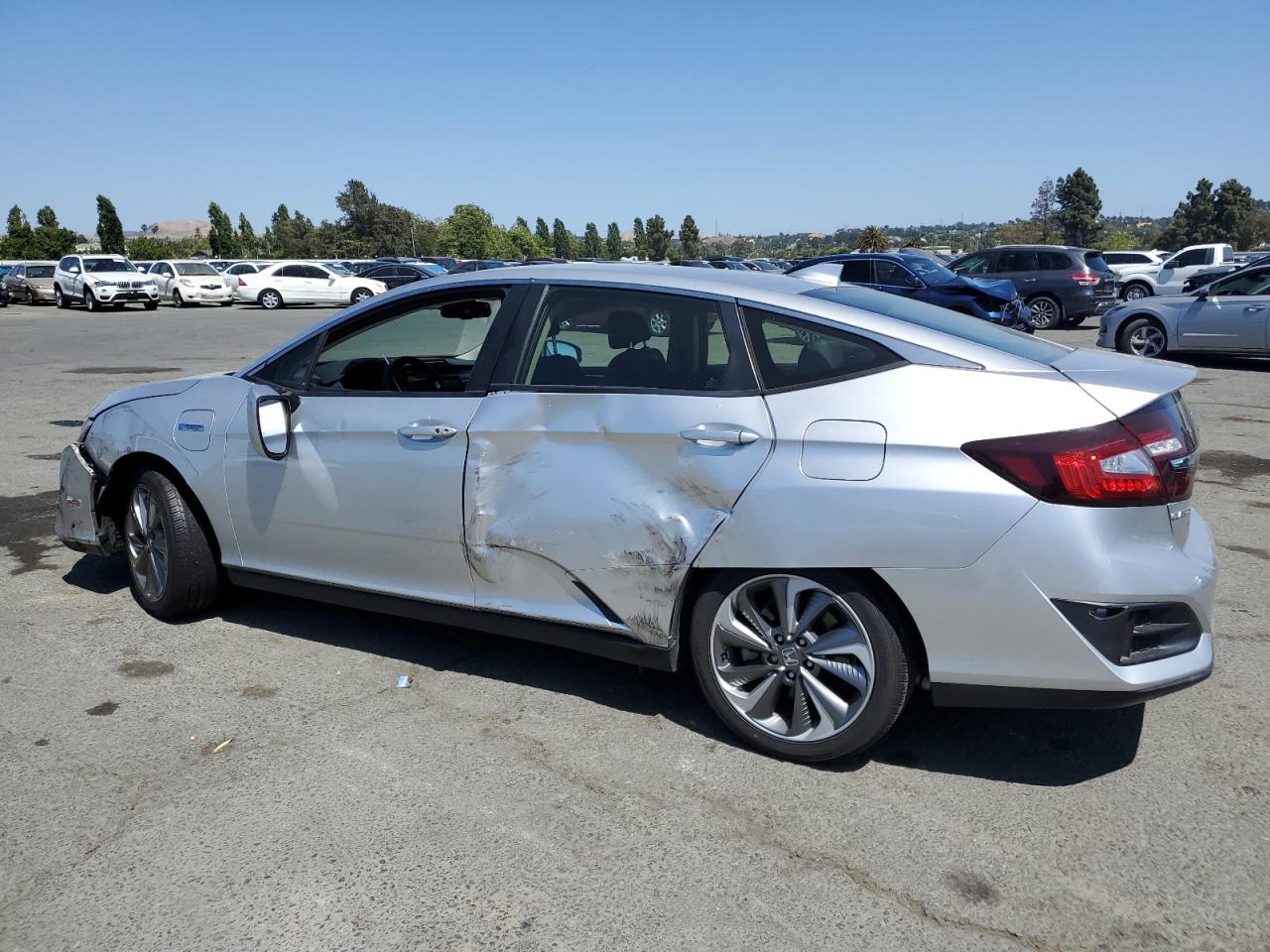 The Honda Clarity has extensive body damage, dents along the side and front end. The interior condition is in a good state with no airbag deployment visible. The wheels are intact, and glass components appear undamaged.