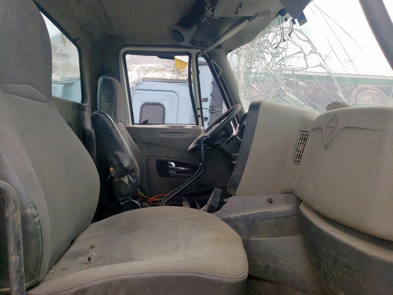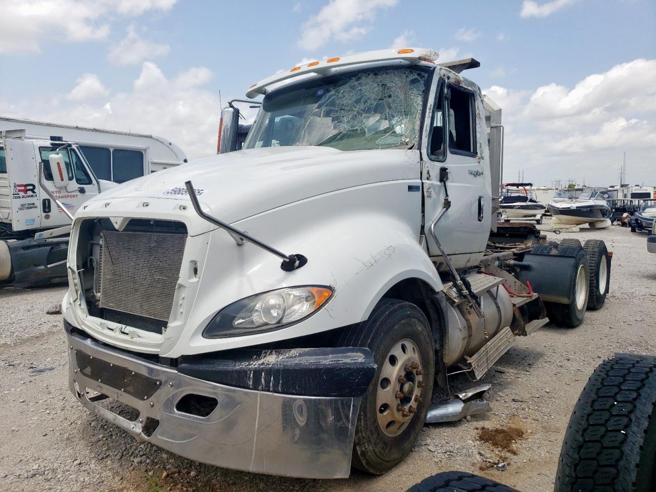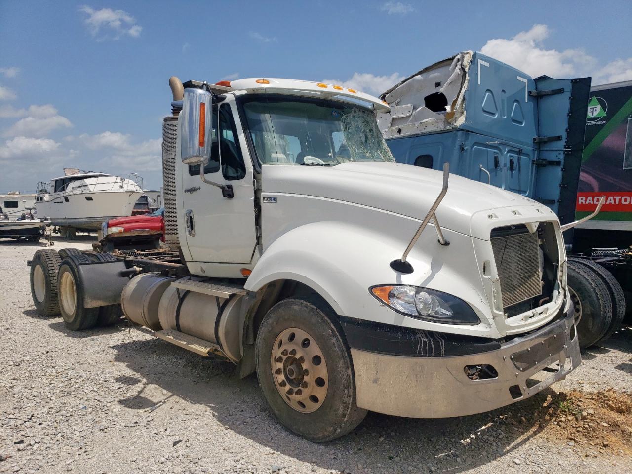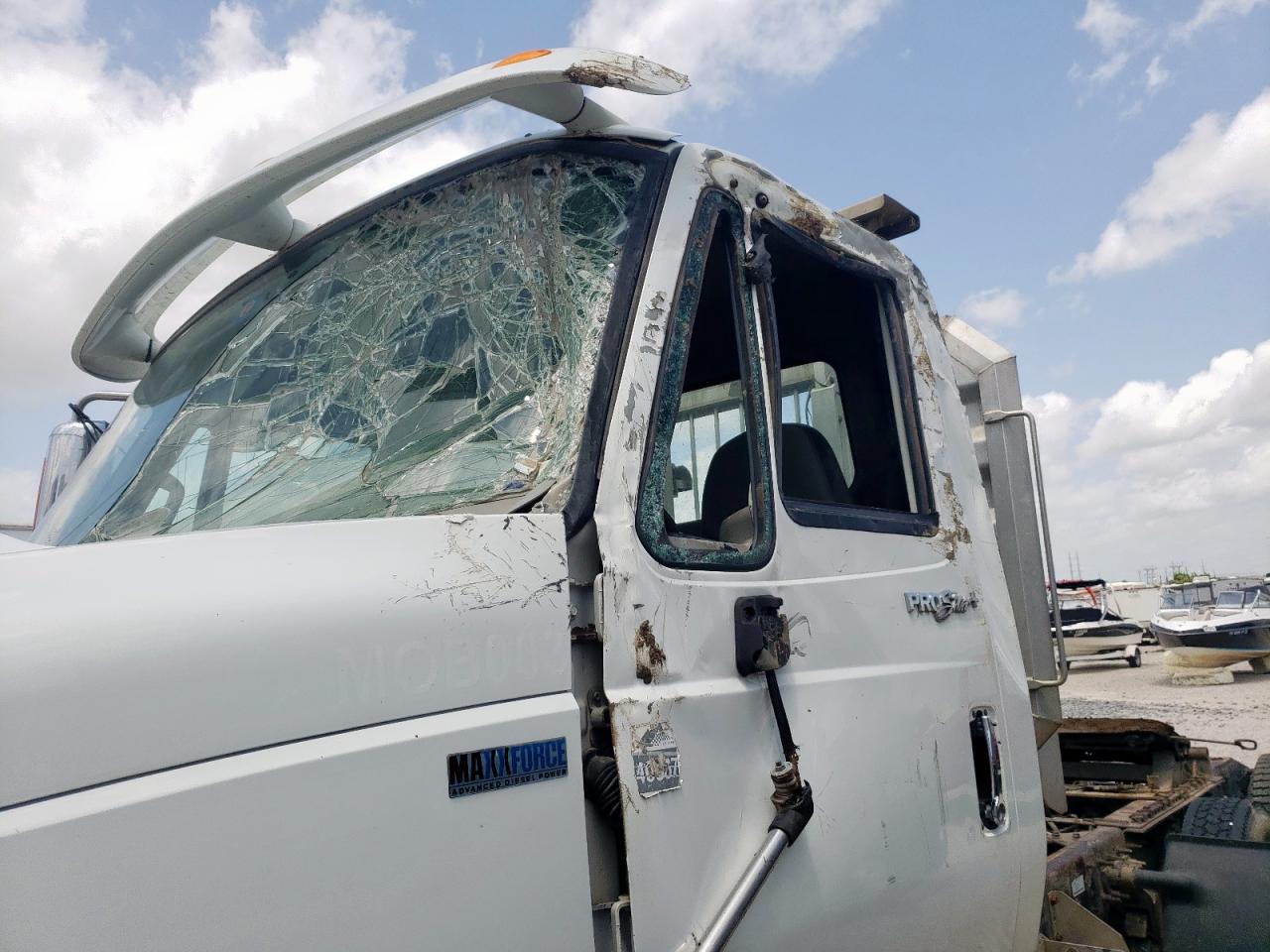 FairThe INTERNATIONAL PROSTAR 2013, white in color, shows significant damage. The primary damage is to the front end, with secondary damage on the side. The windshield is severely cracked, and the front grille is missing. The interior appears dirty and damaged. This vehicle requires considerable repair.