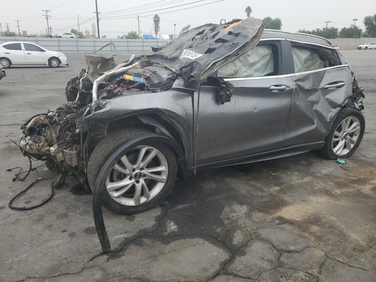 PoorThe INFINITI QX30 BASE 2017, is a compact luxury SUV. The vehicle has sustained severe damage from a rollover accident. The primary damage is classified as a rollover, with the roof and body panels extensively crushed. The car's gray paint is visible, but the structure is significantly compromised. Wheels are present but may be damaged. The lights and glasses are heavily damaged and likely shattered. Interior damage is also extensive. Airbags have deployed, and the cabin shows signs of severe impact. Based on the visible damage, the car is likely not drivable and requires considerable repair.