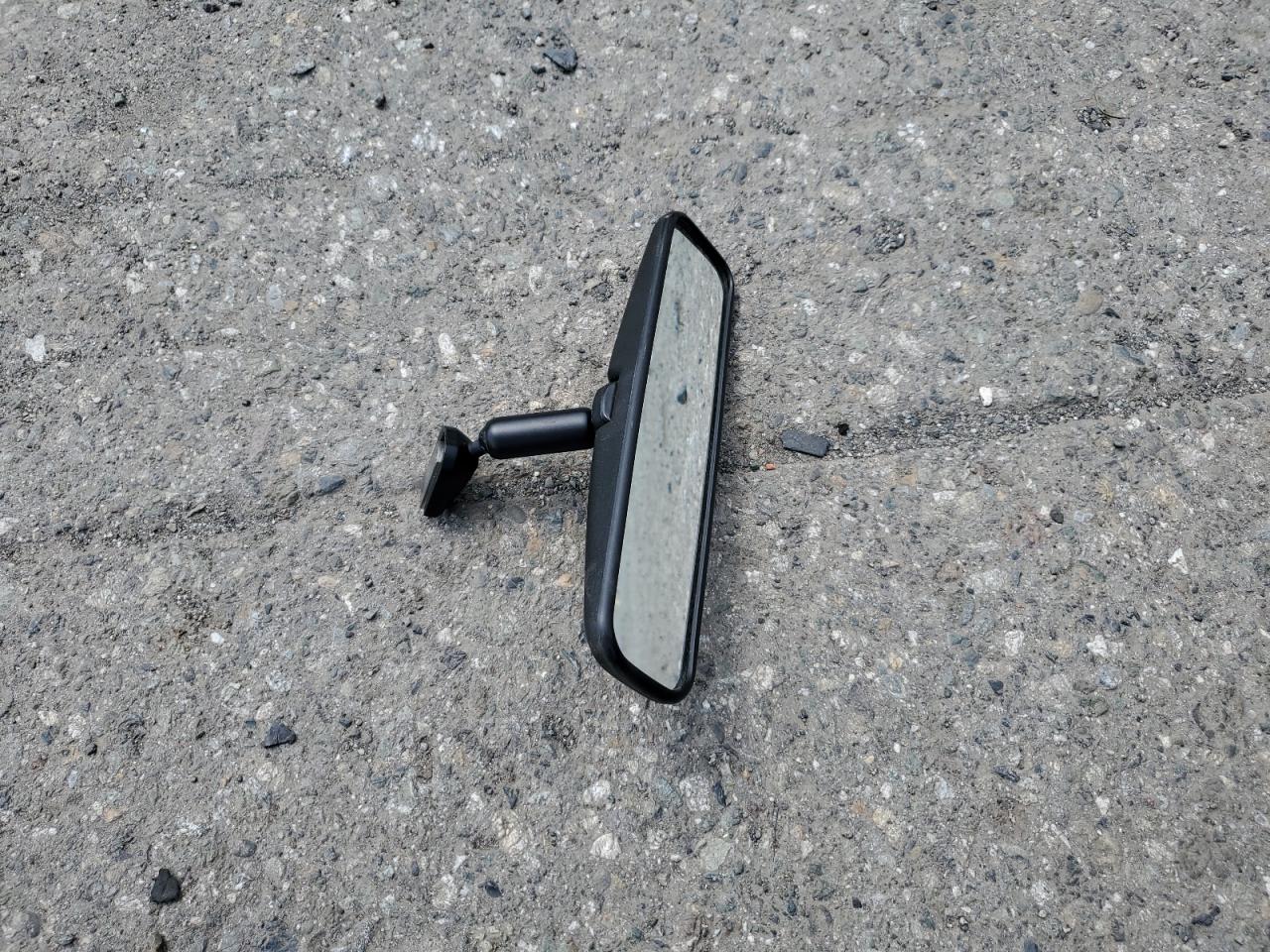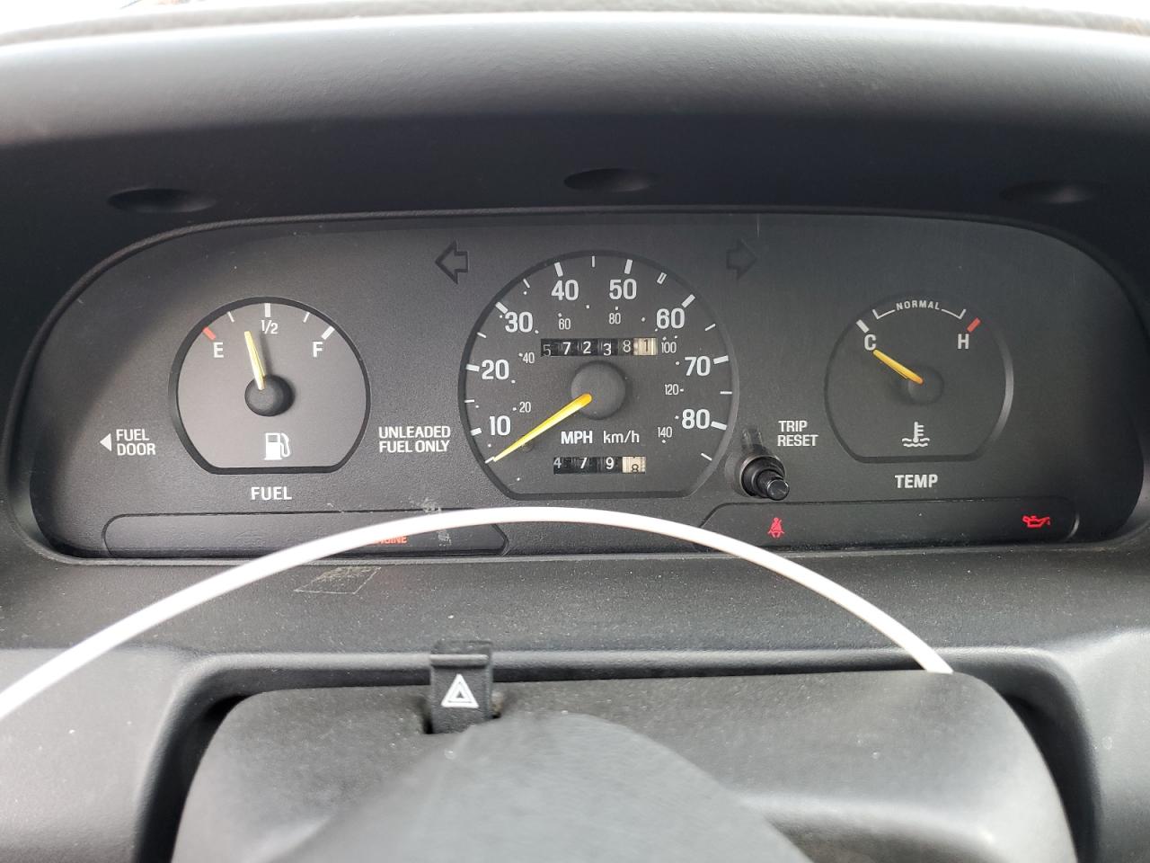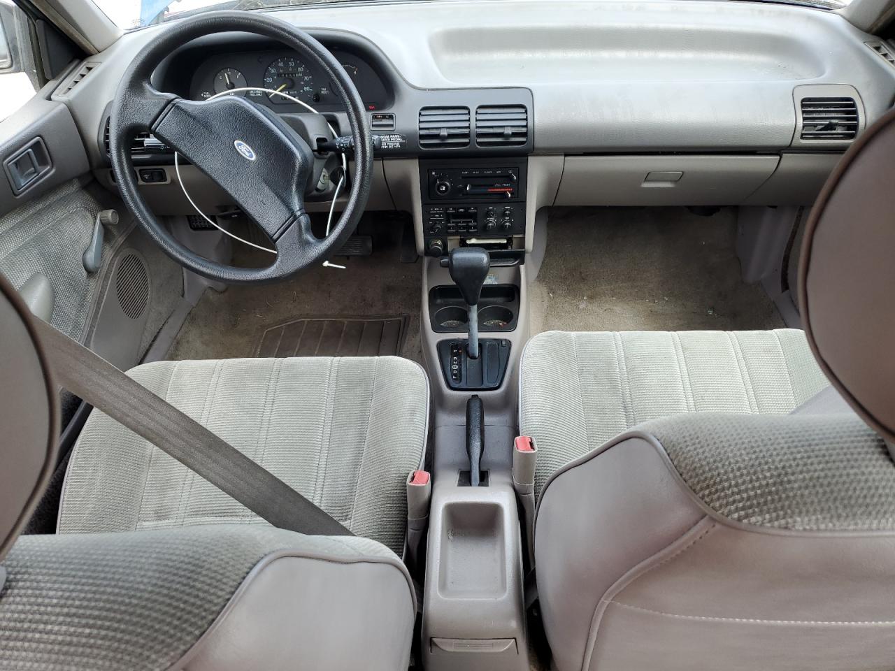 The Ford Escort LX exhibits front-end damage, impacting the body panels. The undercarriage also has damage. The rear window is missing. The interior shows visible wear.