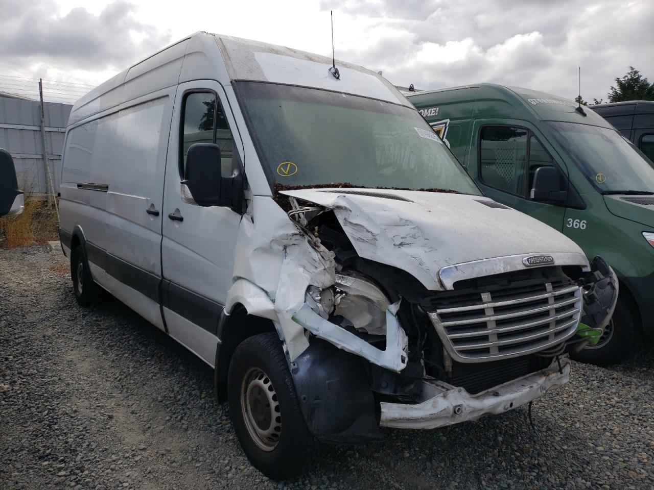 The FREIGHTLINER SPRINTER 2 2013 shows significant front-end impact damage, with body panel damage and signs of wear inside the vehicle. There are potential issues with the headlights and front glass, as well as interior wear and tear.