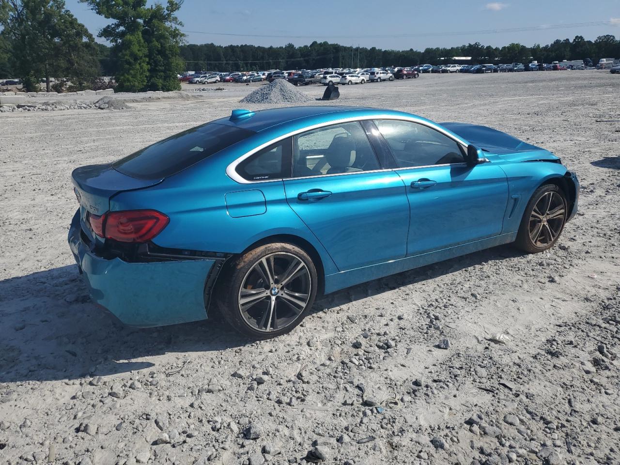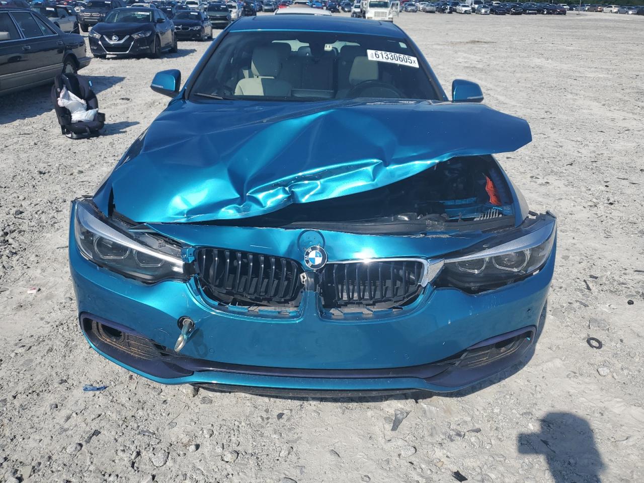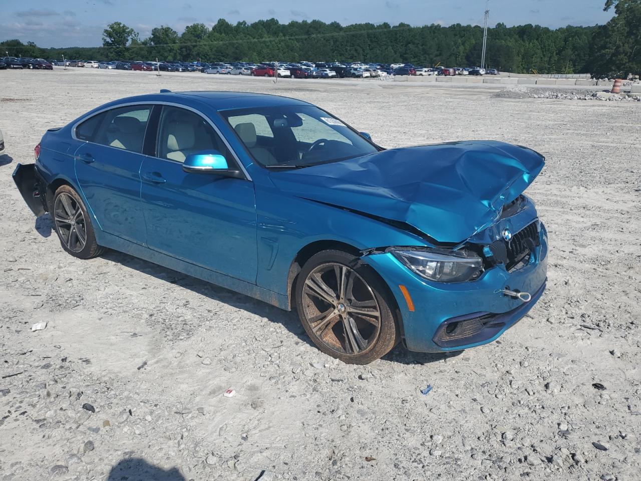 FairThe 2019 BMW 430i xDrive Gran Coupe is a blue-colored vehicle with significant damage primarily to the front and rear ends. The front end exhibits extensive damage, with visible impact and potential structural issues. The rear end also shows damage. The interior appears to be in good condition with minimal wear and tear. The wheels and lights are present but the body has visible damage. There is potential airbag deployment. The car is likely drivable but requires significant repairs.
