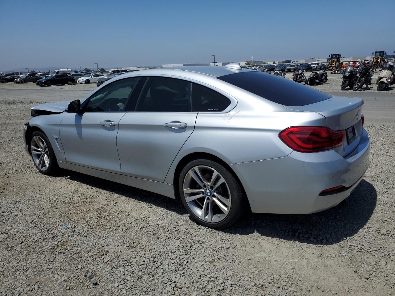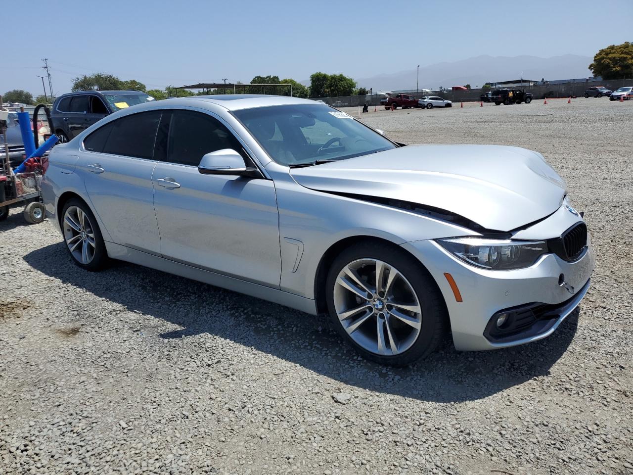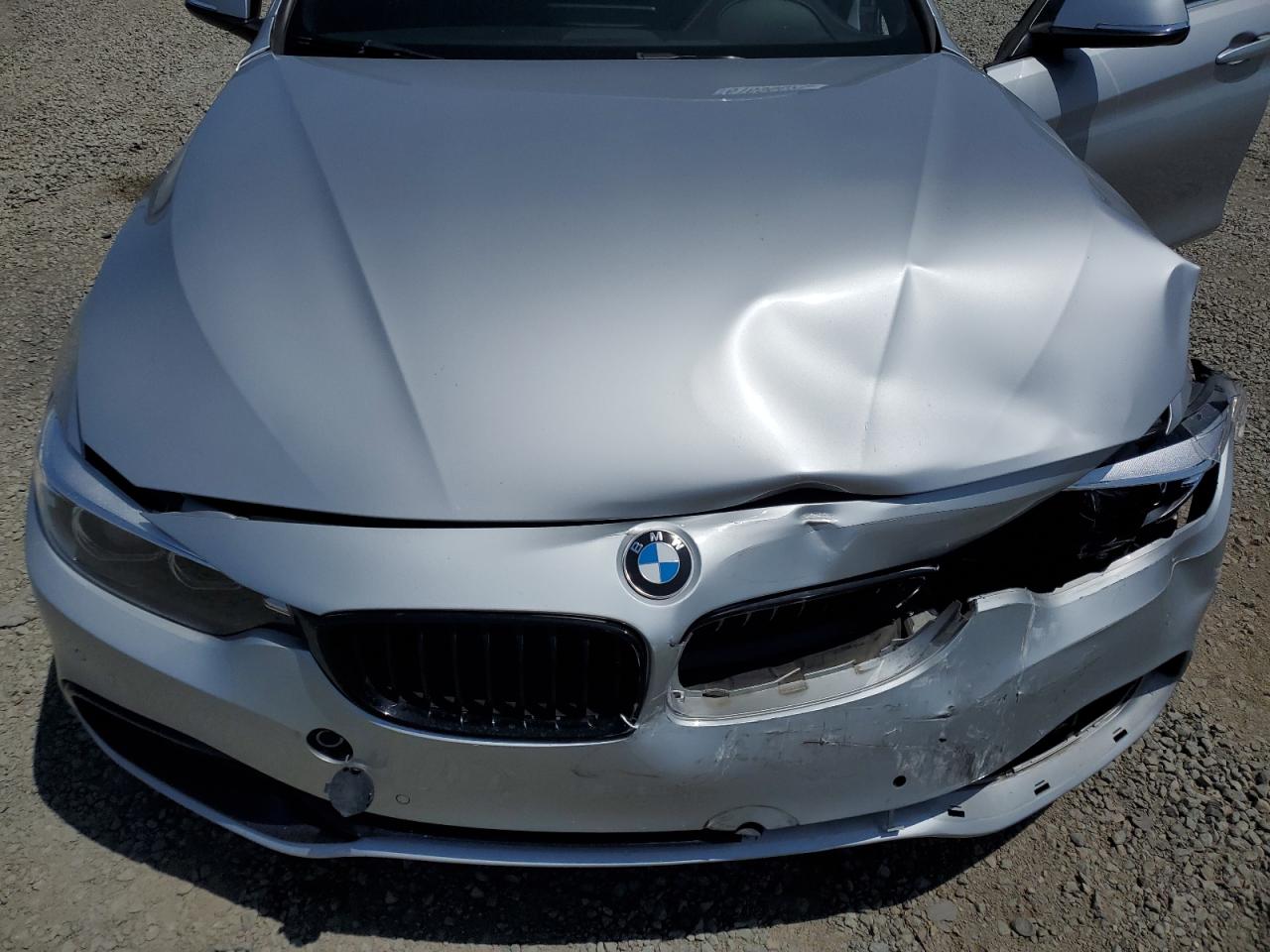 FairThe 2018 BMW 430i Gran Coupe is silver. The front end shows significant damage. The car's body panels are impacted. The interior appears to have airbag deployment. The wheels and lights appear intact. The glass is in good condition.