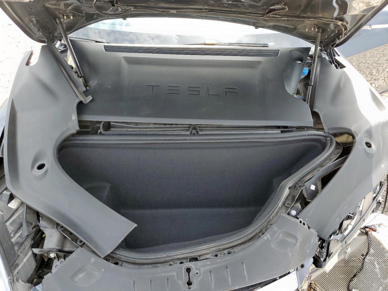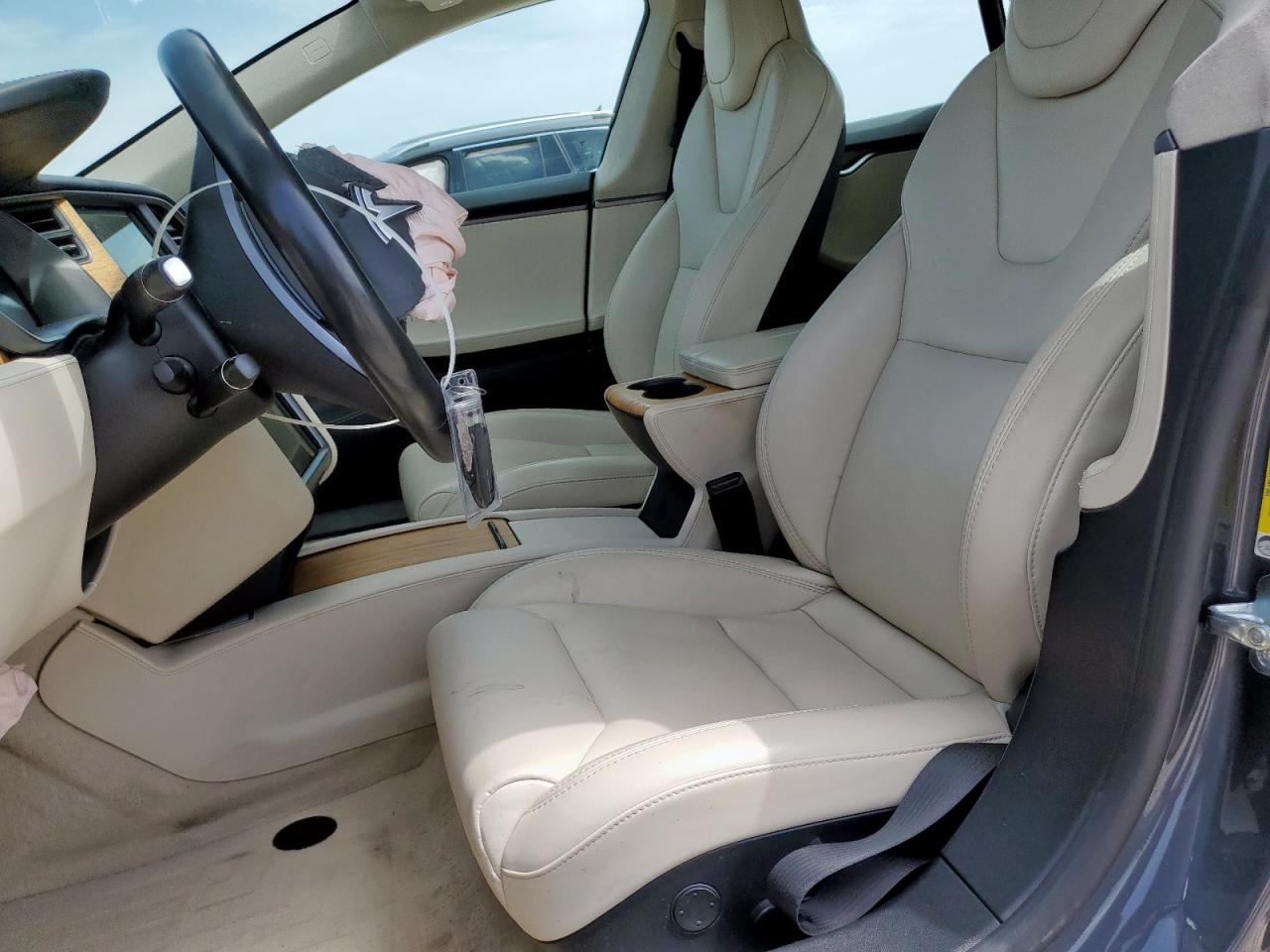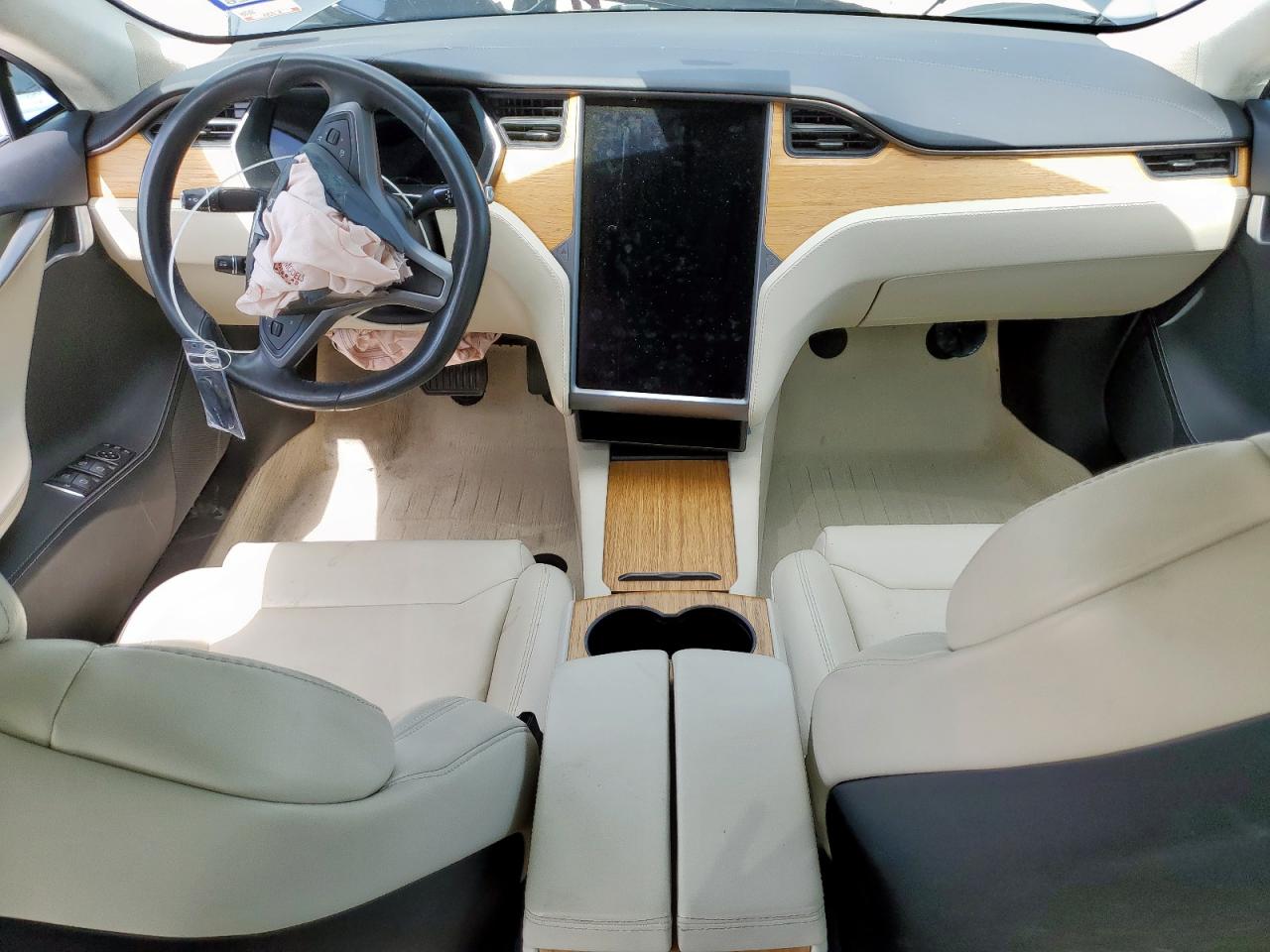 The Tesla Model S has sustained significant damage to the front end and side. The front end has severe damage, the side body panel damage. The airbags deployed, indicating an impact. The interior damage is also visible.