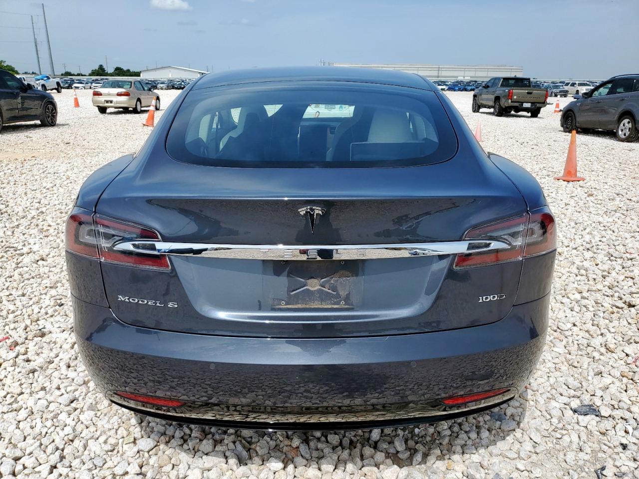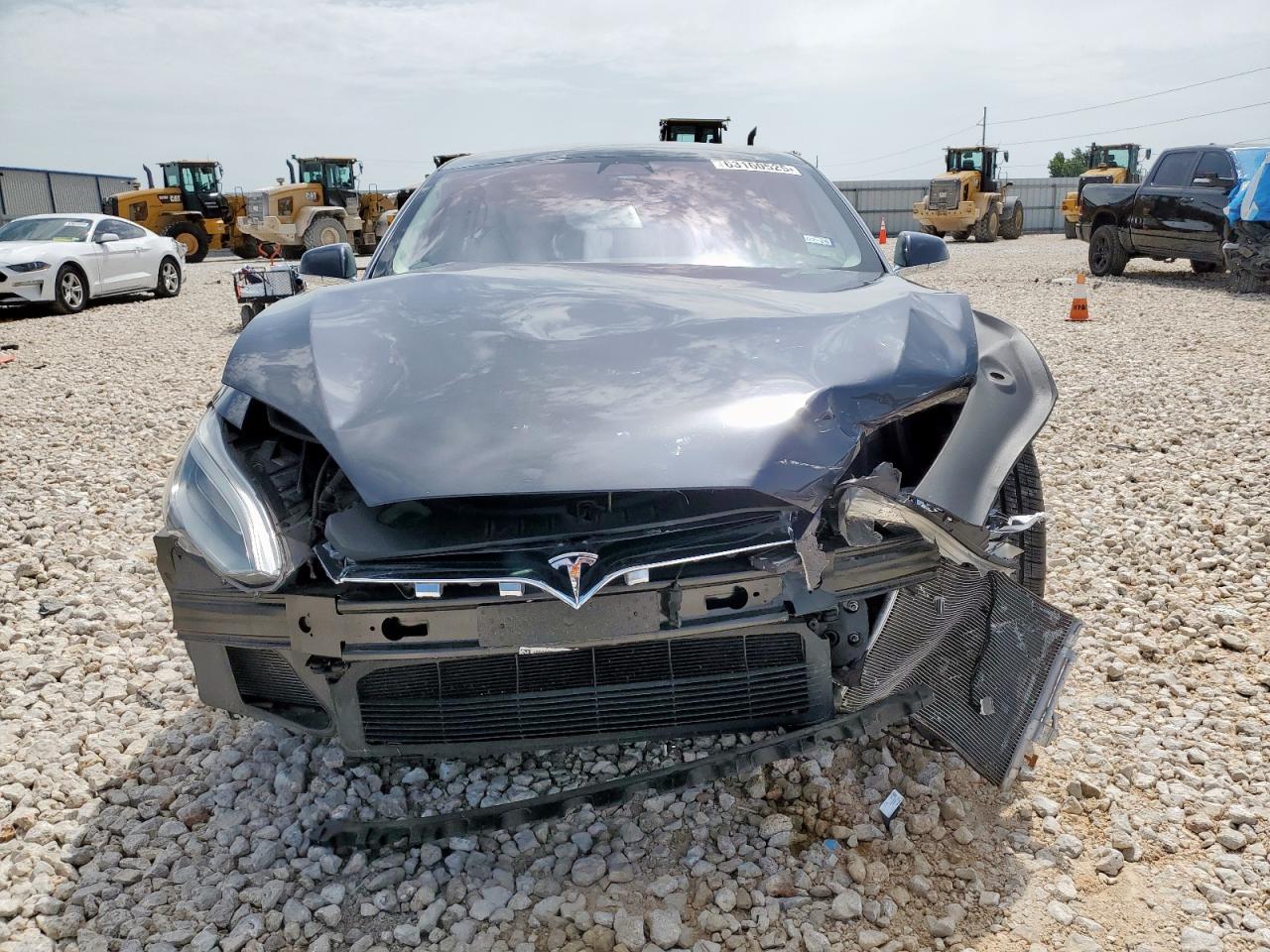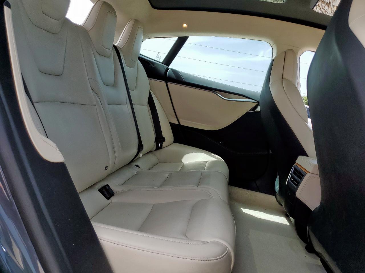 The Tesla Model S has sustained significant damage to the front end and side. The front end has severe damage, the side body panel damage. The airbags deployed, indicating an impact. The interior damage is also visible.