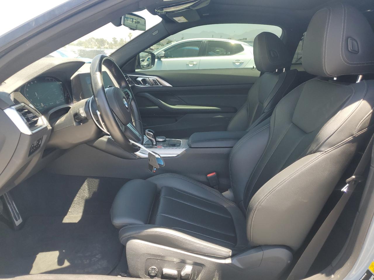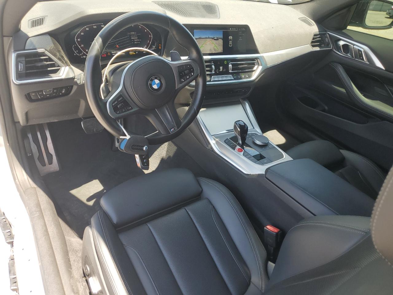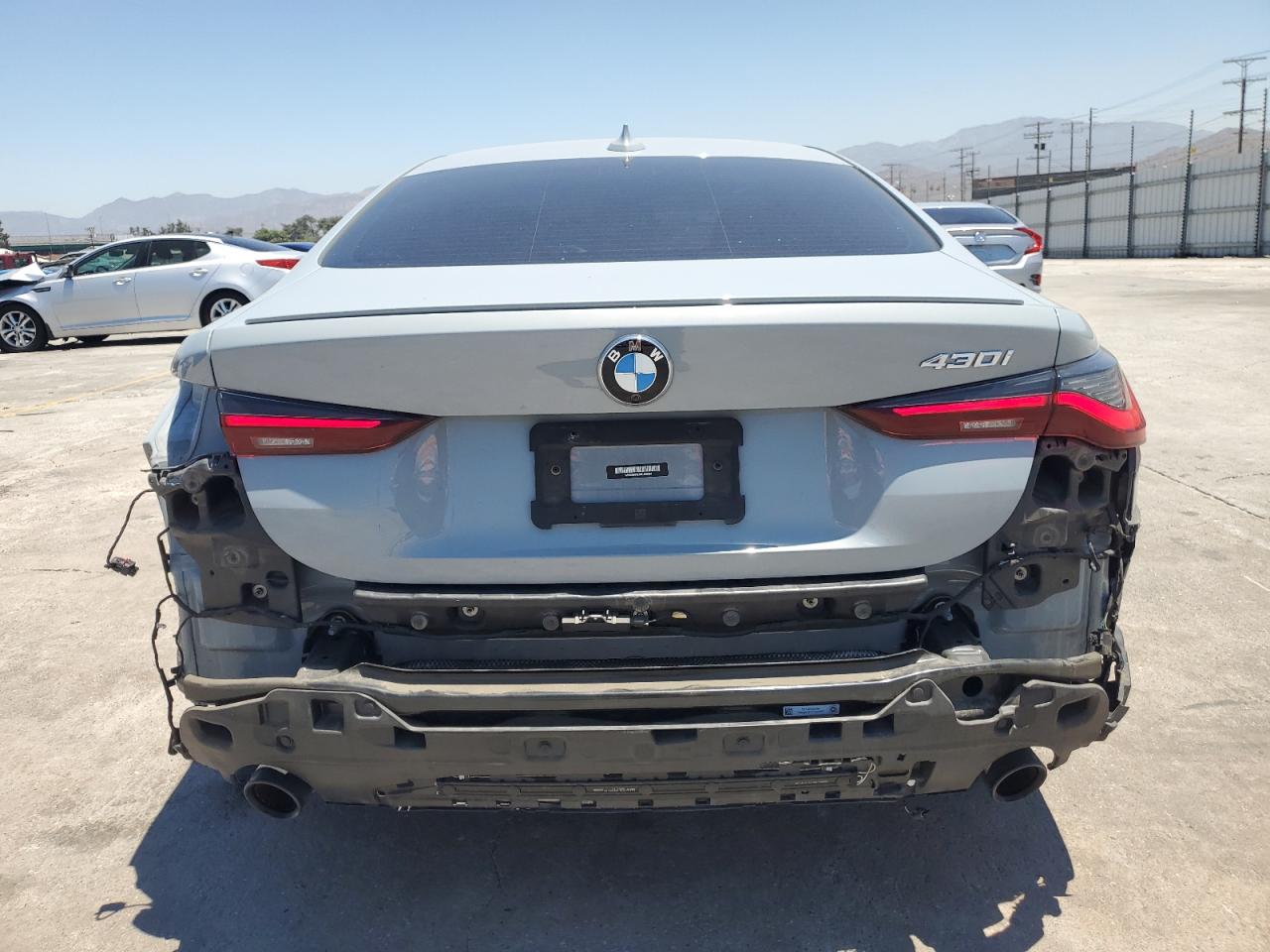 The BMW 430i has widespread body damage, including missing body panels at the front and rear. The vehicle's overall condition is fair, with an interior that is well-preserved. The car is drivable despite the body damage.