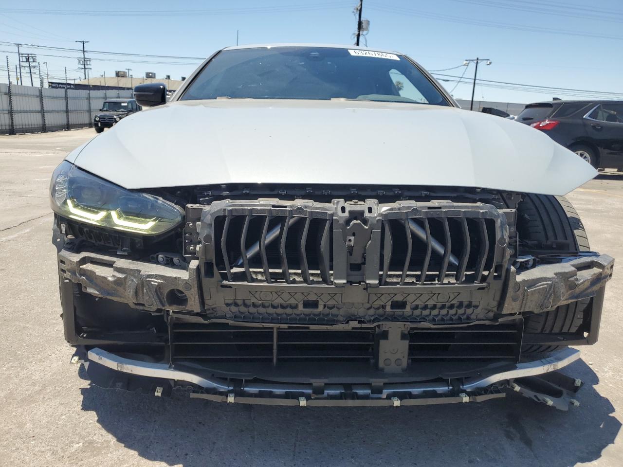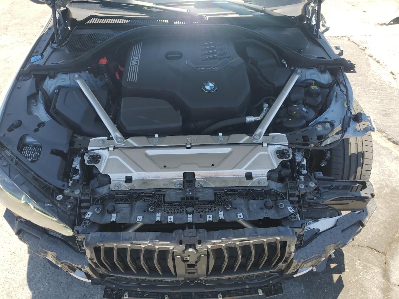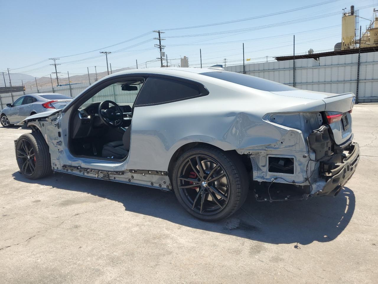 The BMW 430i has widespread body damage, including missing body panels at the front and rear. The vehicle's overall condition is fair, with an interior that is well-preserved. The car is drivable despite the body damage.