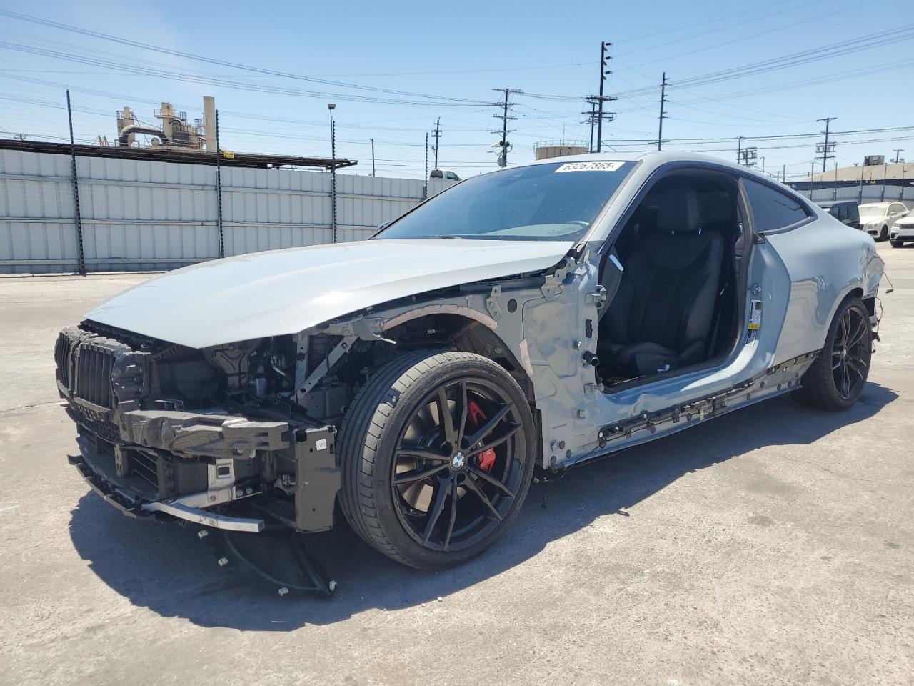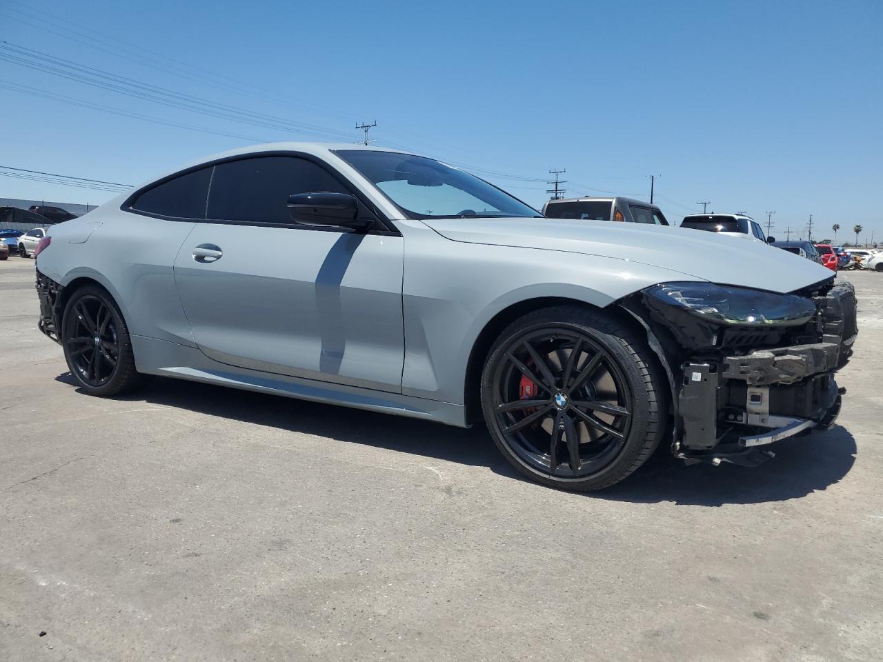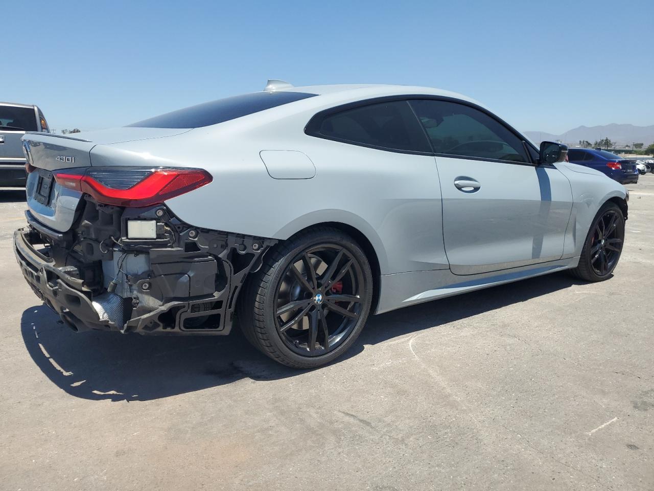 Fair2022 BMW 430i - Gray color. This car showcases body damage, specifically to the exterior panels, but remains drivable. The interior appears to be in very good condition. The vehicle is a 'Run & Drive Verified' start.
