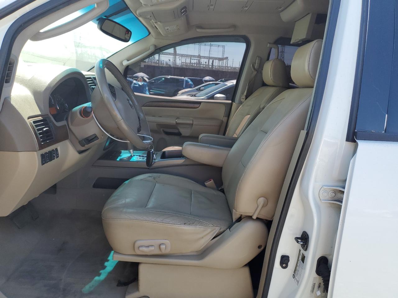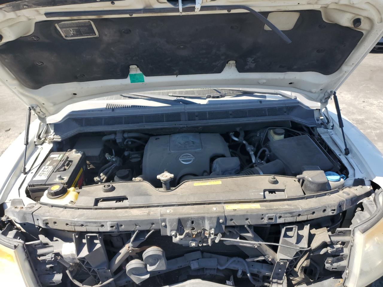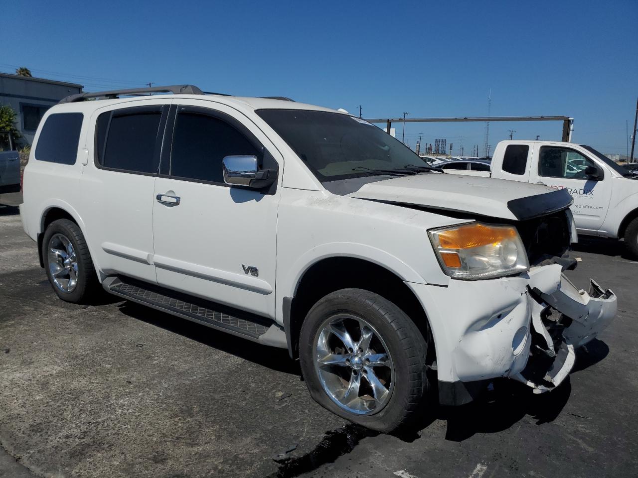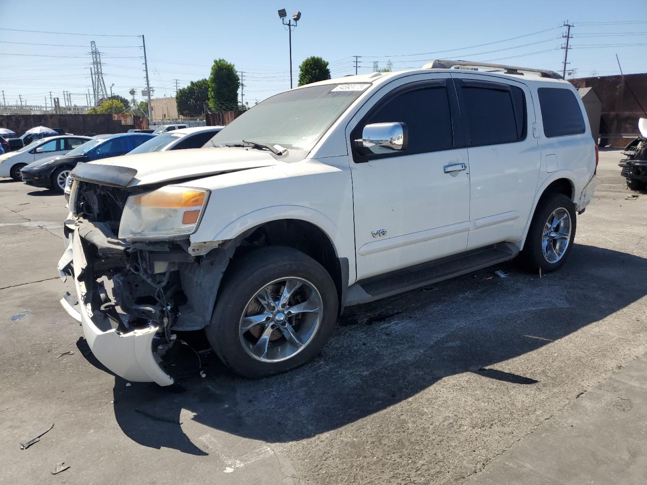 FairThis is a white 2008 NISSAN ARMADA SE. The primary damage is to the front end, with no secondary damage reported. The vehicle's condition is "Run & Drive Verified". The car shows damage to the front bumper, likely affecting the lights and front panels. The wheels appear to be intact. The interior shows wear, but overall is in decent shape.