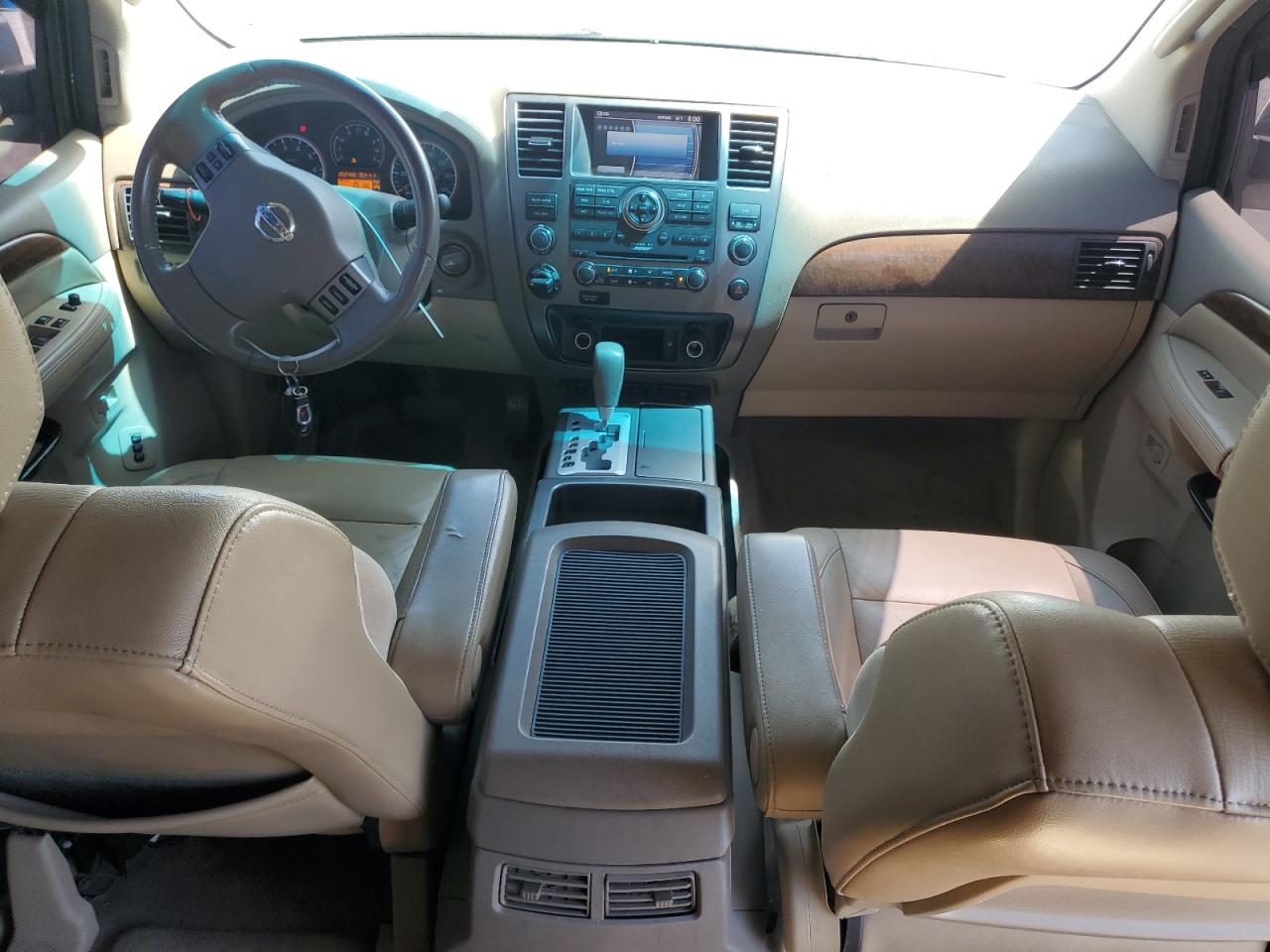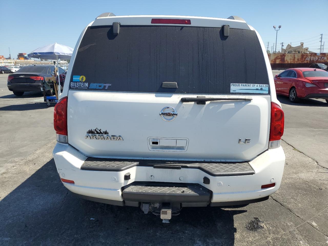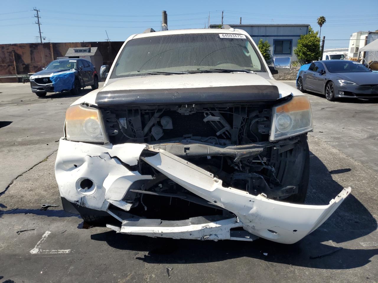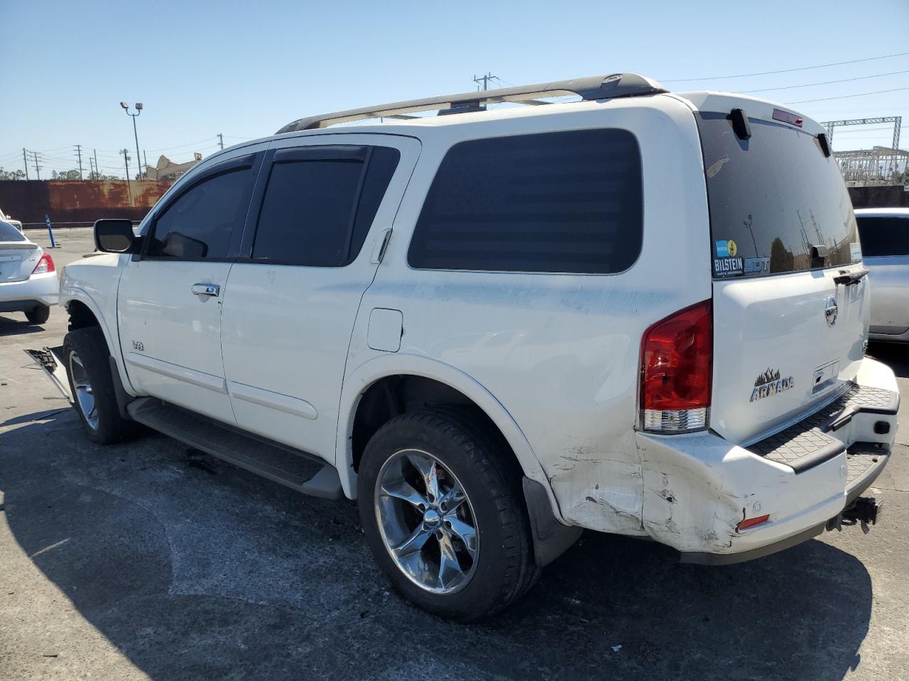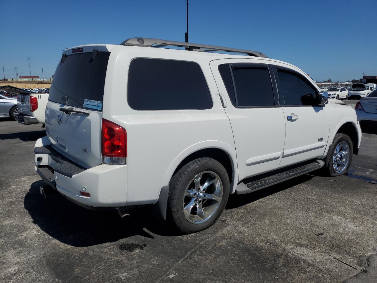 FairThis is a white 2008 NISSAN ARMADA SE. The primary damage is to the front end, with no secondary damage reported. The vehicle's condition is "Run & Drive Verified". The car shows damage to the front bumper, likely affecting the lights and front panels. The wheels appear to be intact. The interior shows wear, but overall is in decent shape.