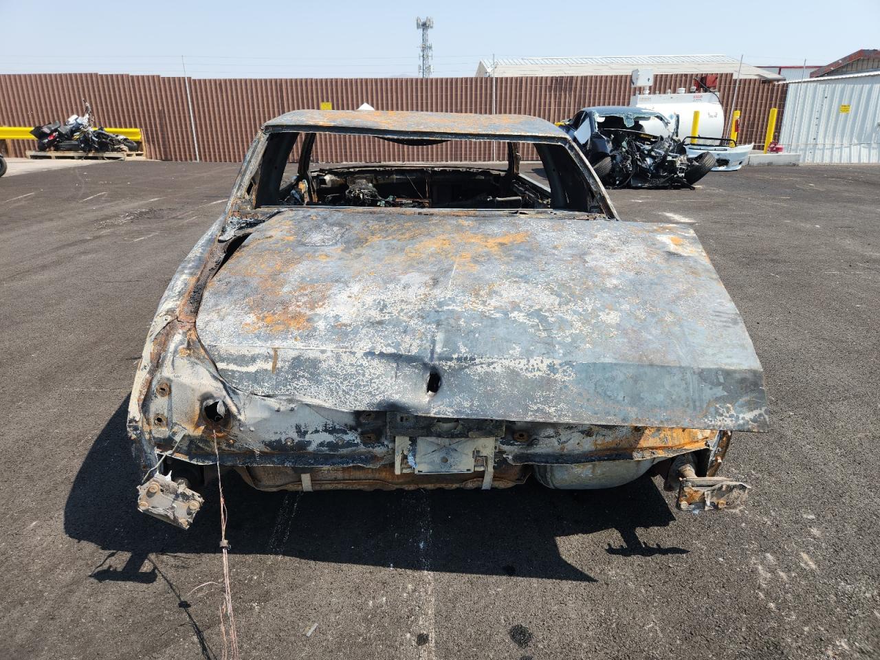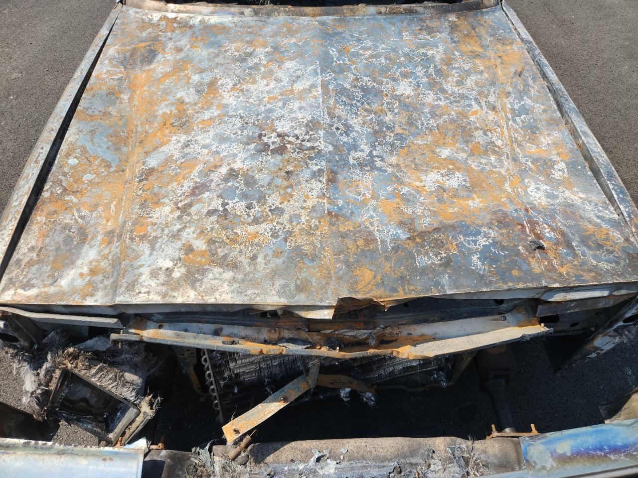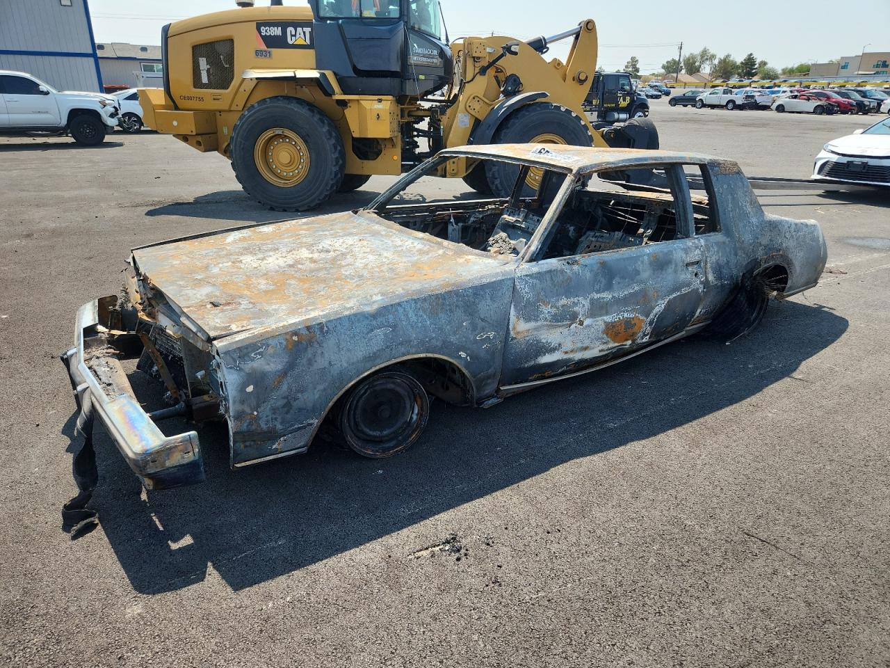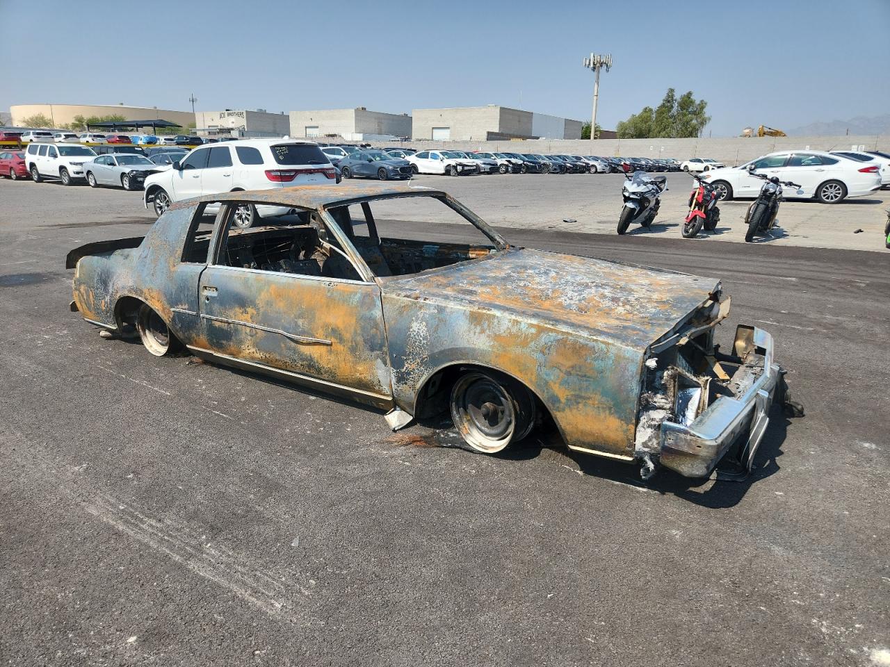 PoorThe 1979 Buick Regal has sustained extensive fire damage. The exterior displays severe burns, affecting the body panels, with significant charring and structural damage. The wheels are visibly damaged due to the intense heat. The lights and glasses are completely destroyed. Inside, the interior is heavily burned, with no salvageable components. The airbags are likely deployed or destroyed due to the fire. The vehicle is not drivable and requires extensive repair or is beyond repair. The overall condition is very poor and vehicle damage category is body.