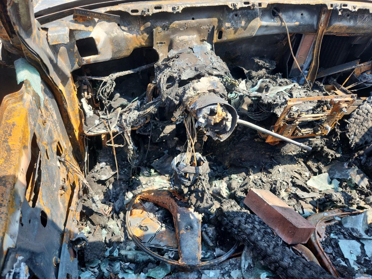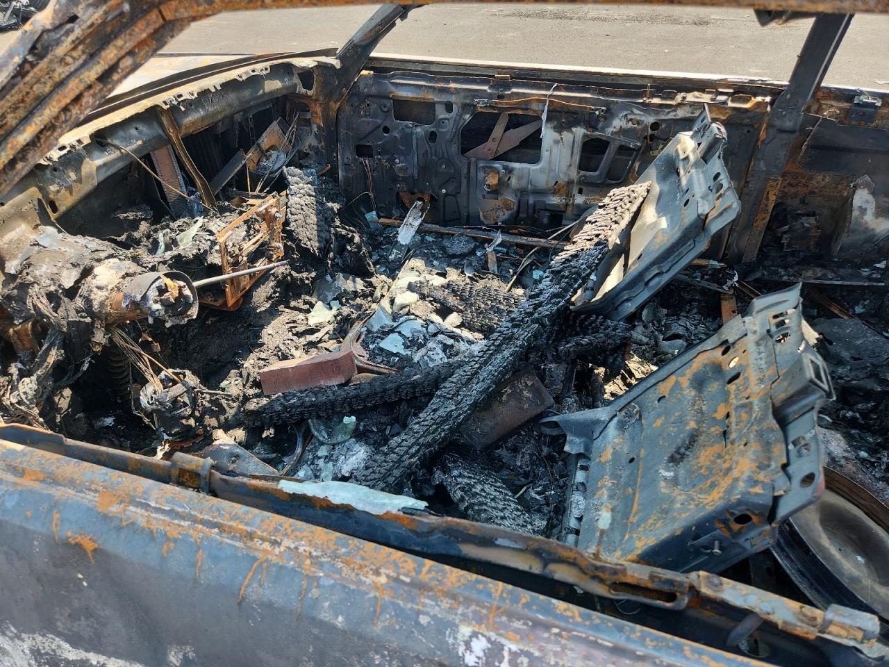 Severe fire damage throughout, charring, and structural failure.