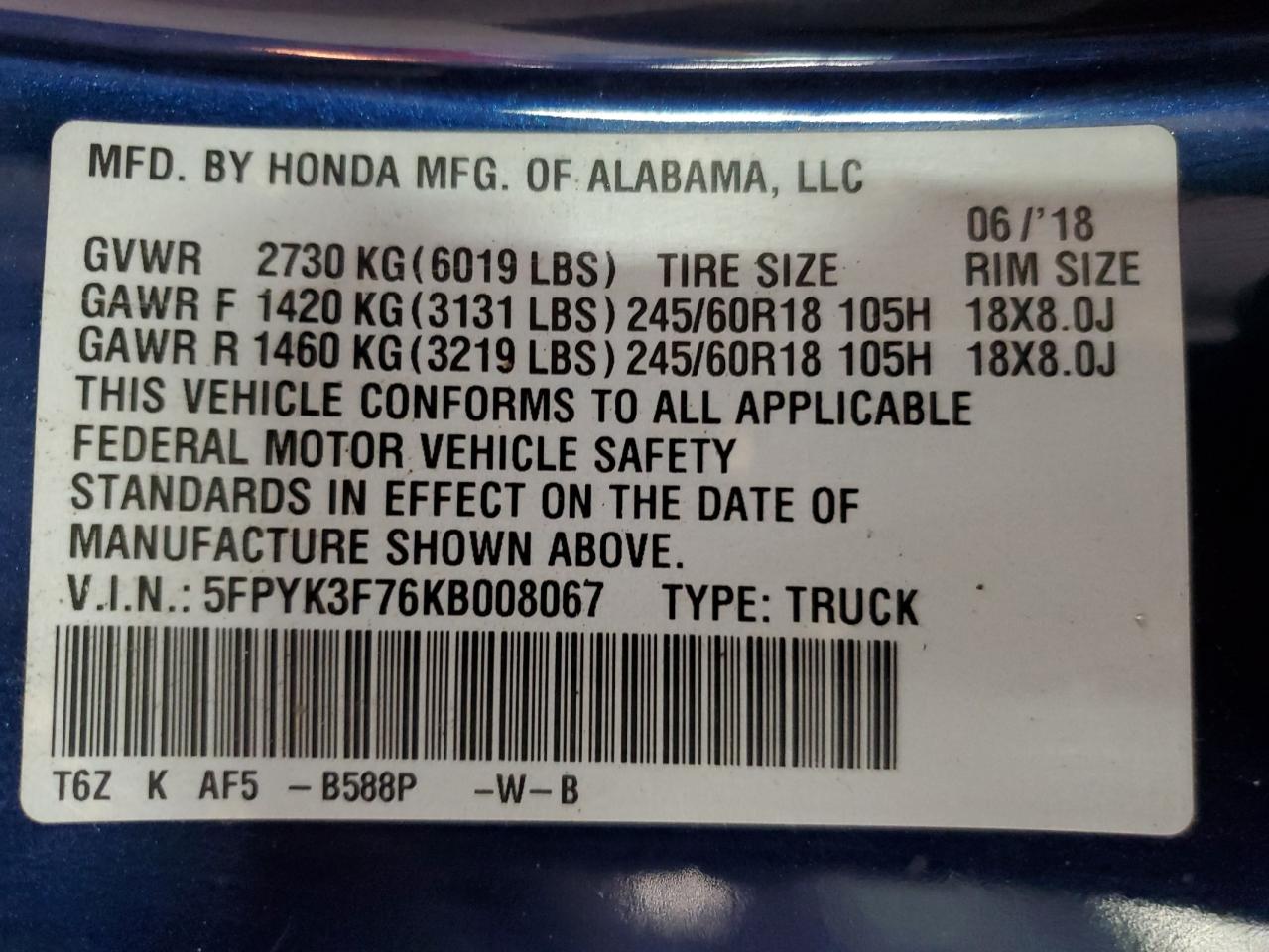 GoodThe 2019 Honda Ridgeline is a blue pickup truck. The vehicle's start code is "Run & Drive Verified". It has some minor dents and scratches, indicating cosmetic damage. The interior appears to be in relatively good condition. The wheels and lights are intact. There are no obvious signs of significant damage to the glass.
