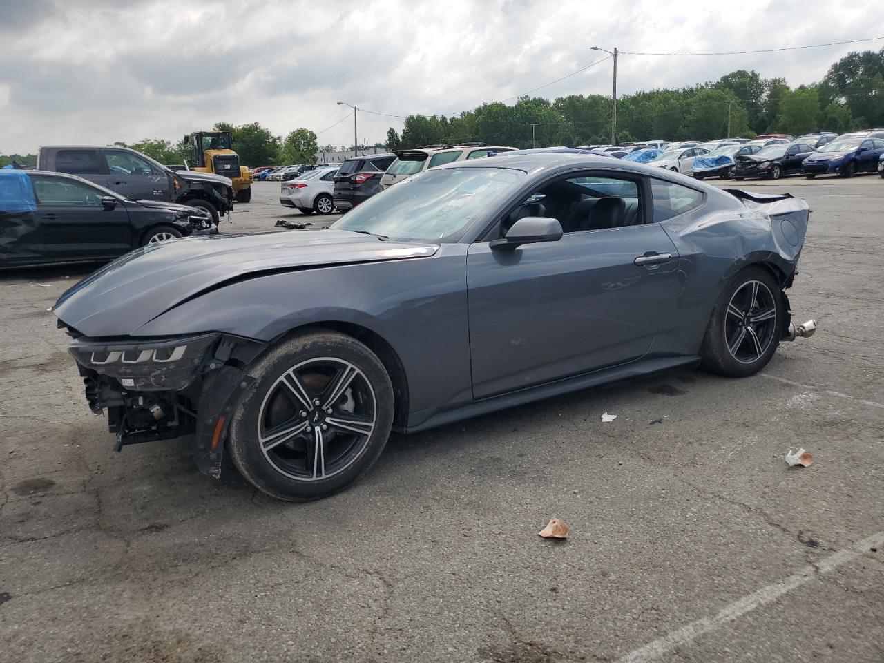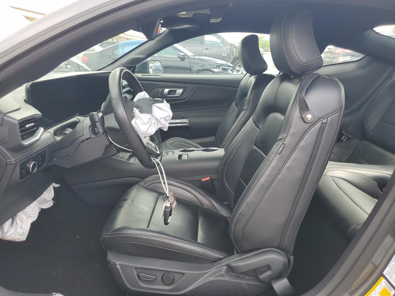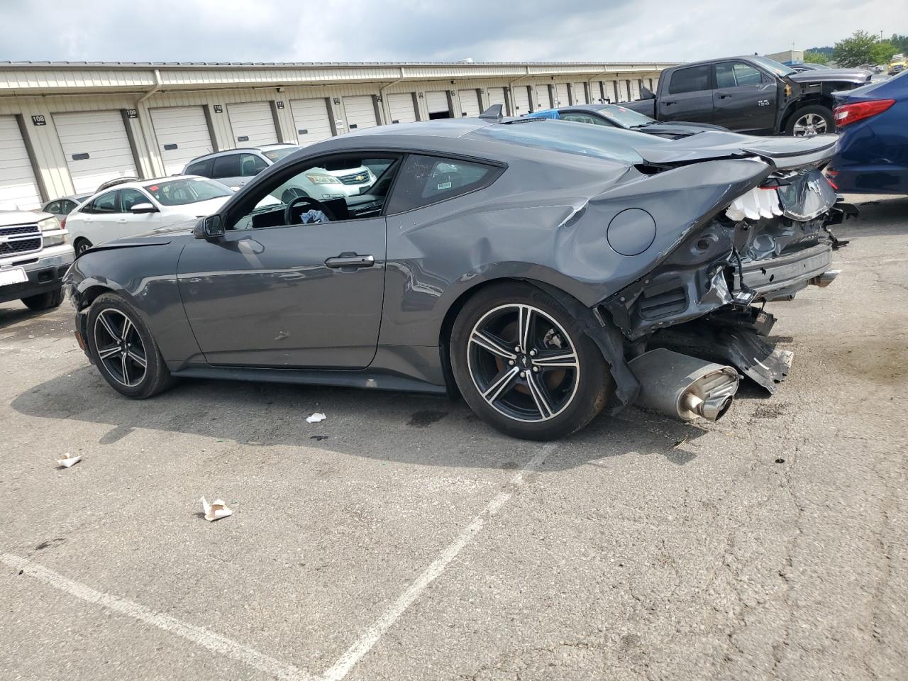 FairThe gray 2024 Ford Mustang has sustained significant damage. The front end shows severe impact damage, with the bumper and front components compromised. The rear end is also heavily damaged. The interior shows signs of airbag deployment. The vehicle is likely drivable but requires substantial repairs. The vehicle’s lights and glasses seem to be intact.