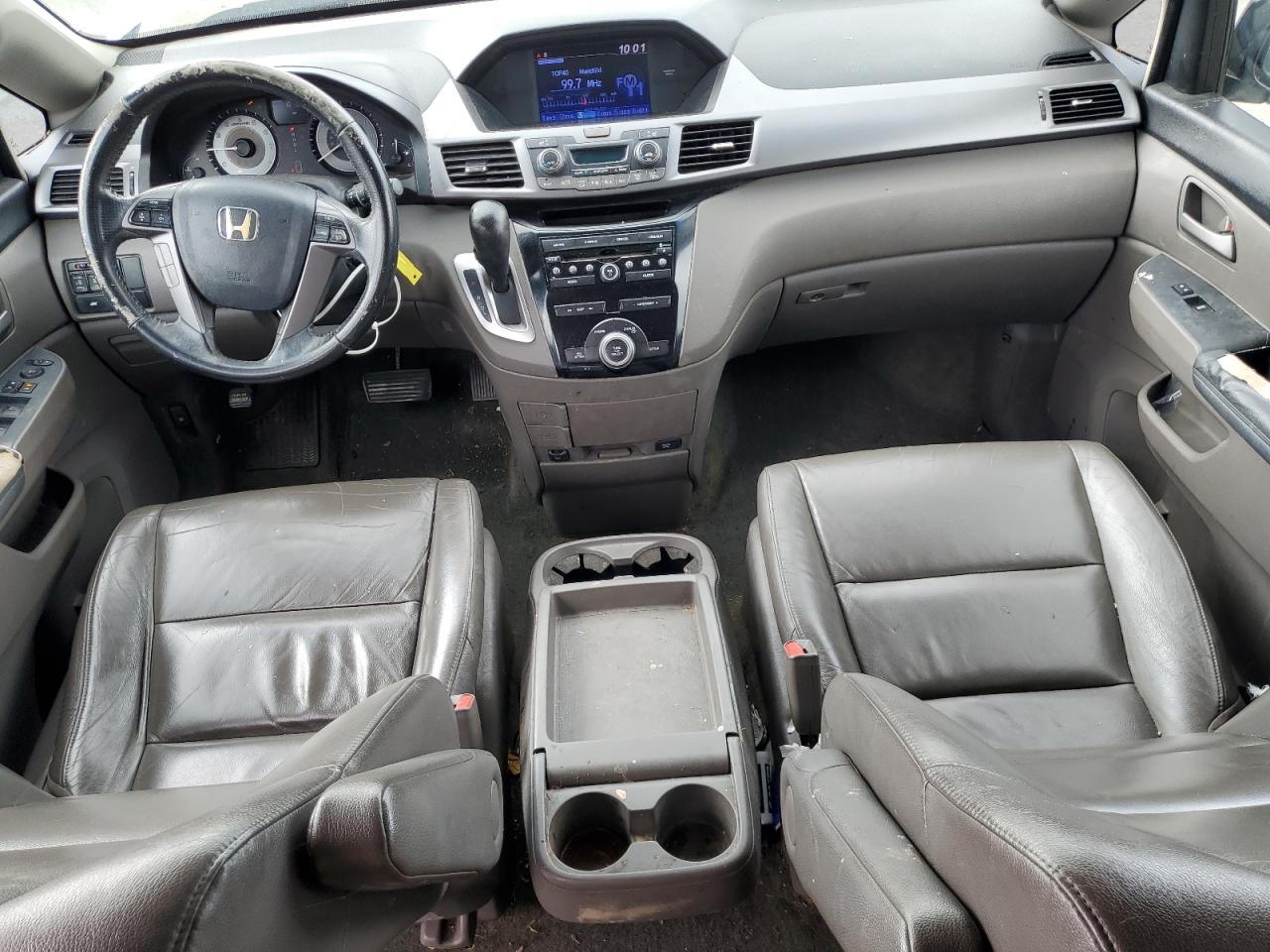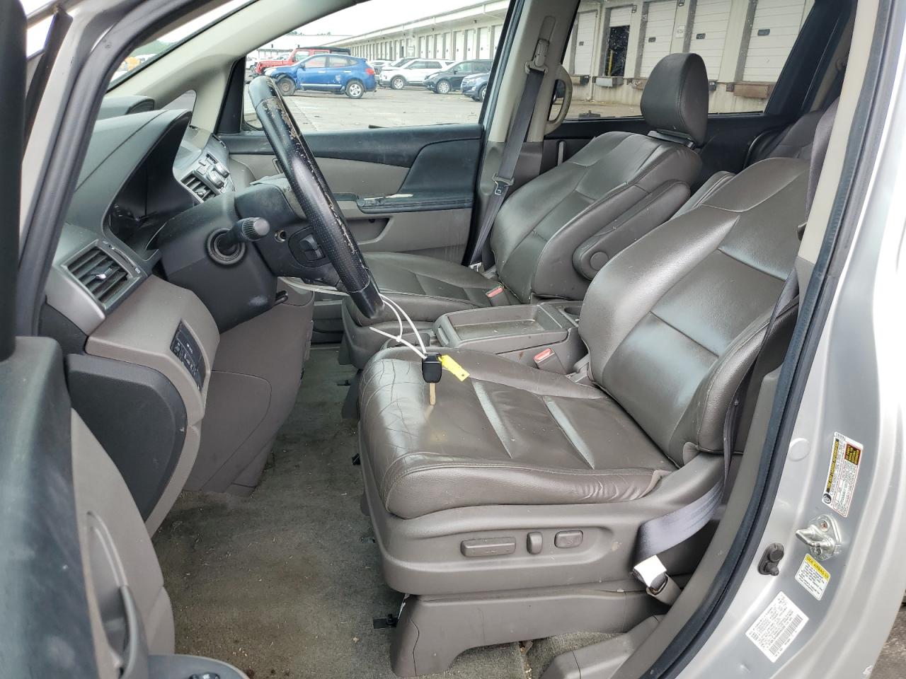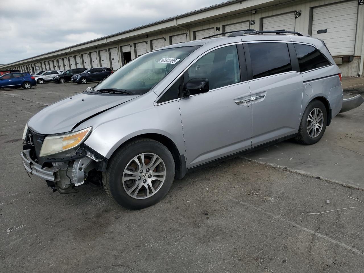 The Honda Odyssey shows significant front-end damage including a damaged bumper, and missing front components. The body panels show visible damage, indicating a need for repairs. Interior appears to be in good condition with minimal damage. The wheels are fine and the lights are in good condition.