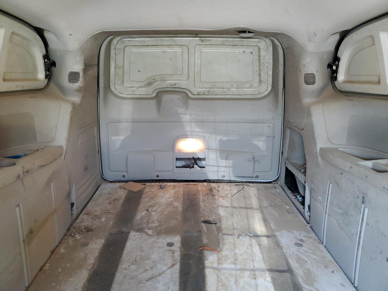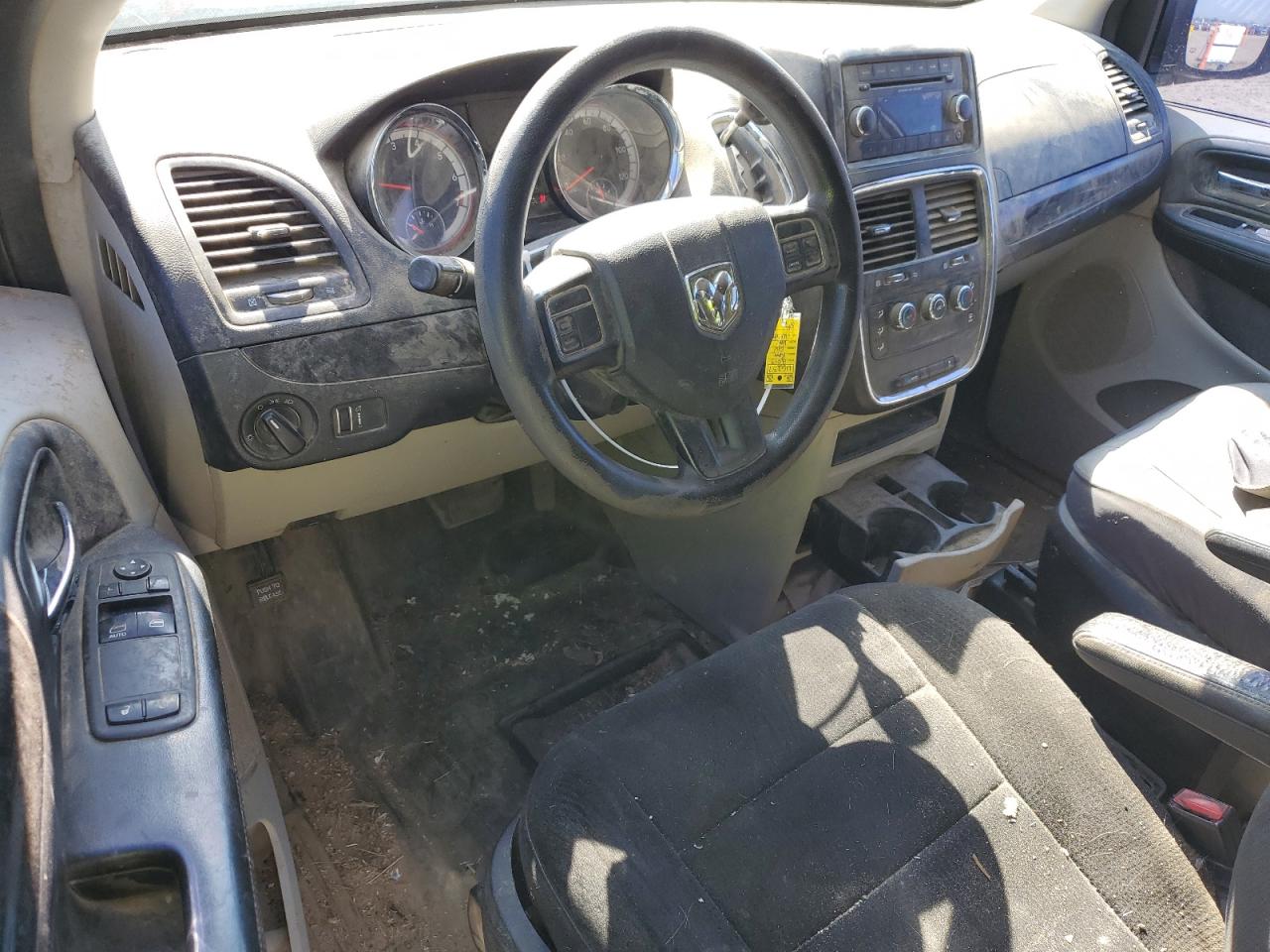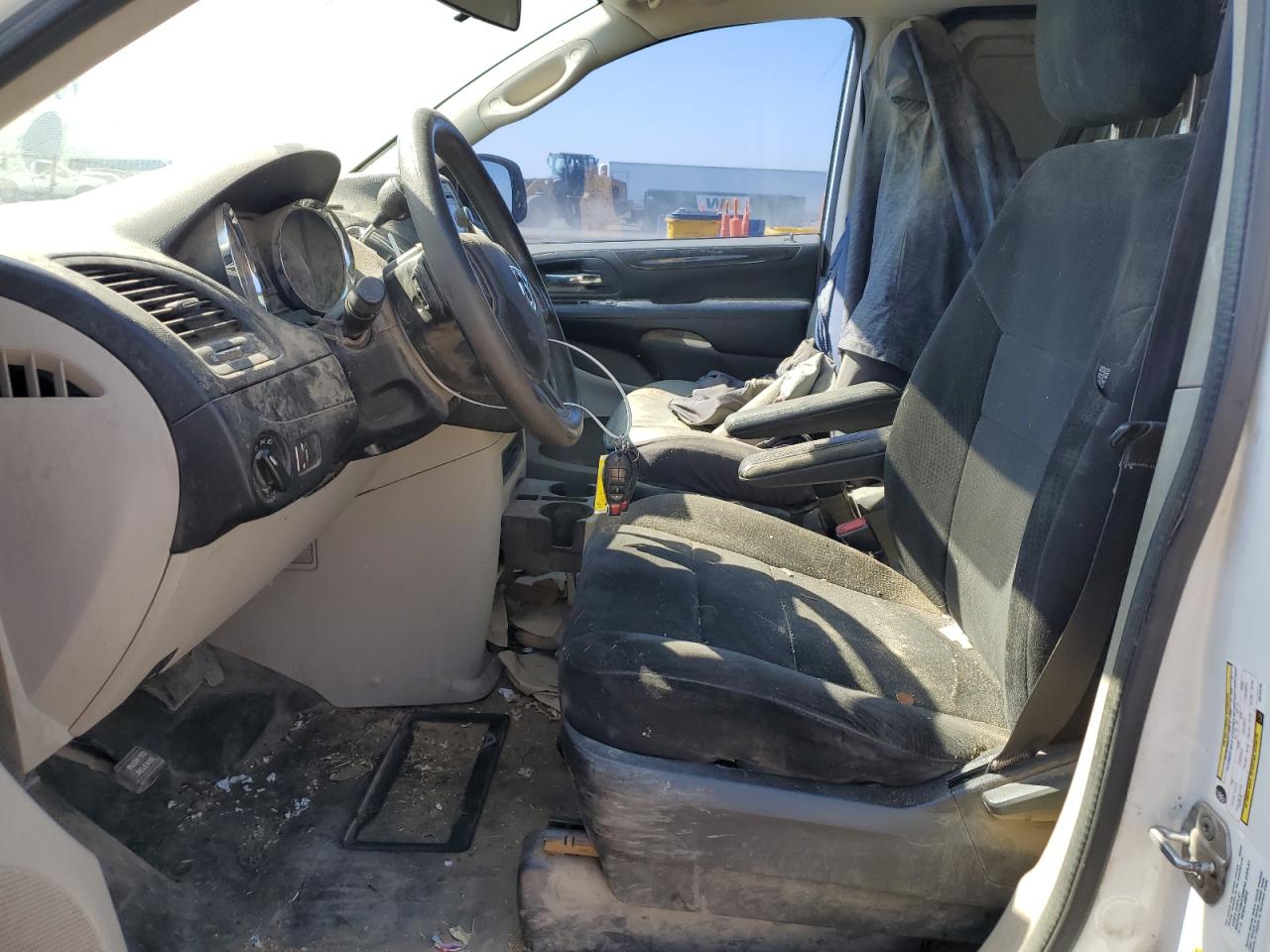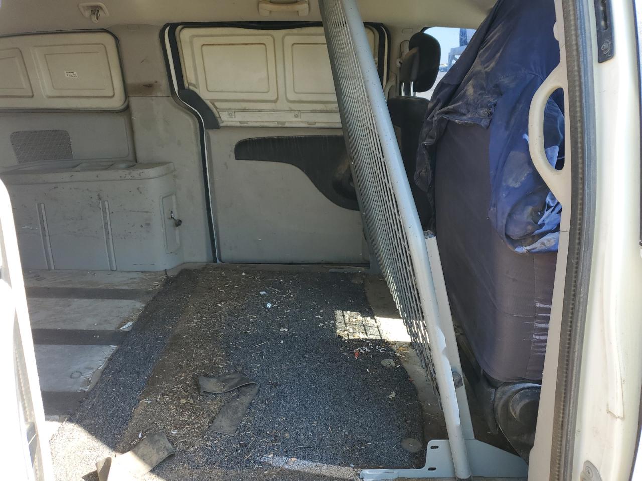 The vehicle exhibits moderate visible damage, primarily due to hail. Side damage is also present. The vehicle's exterior has signs of wear. The interior is dusty and shows signs of wear and tear.