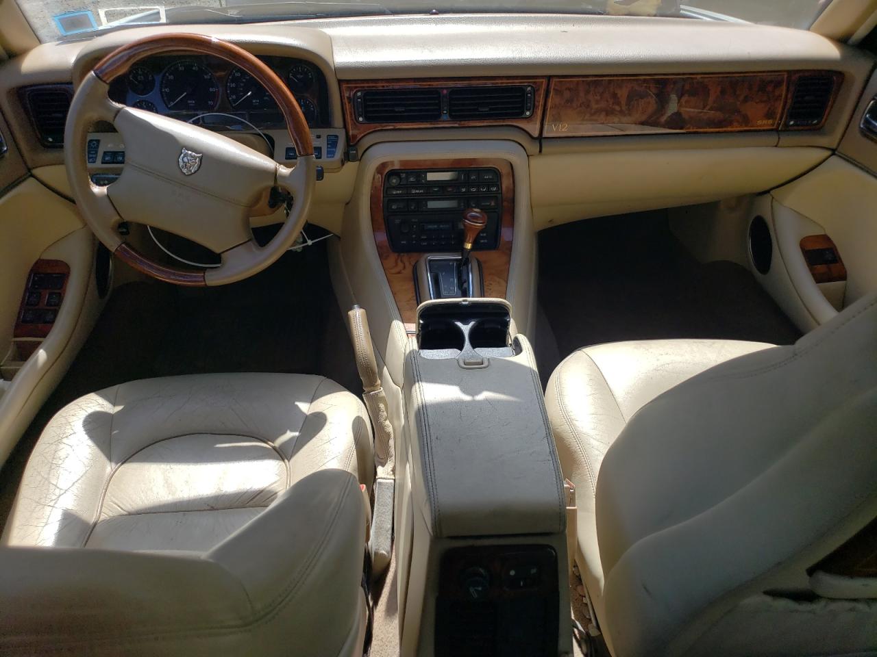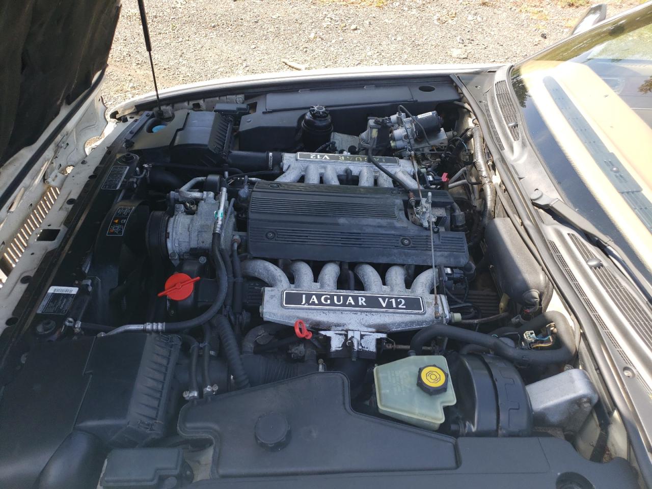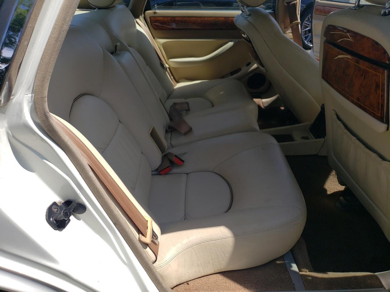 Good1995 JAGUAR XJ12, white color. Primary damage WATER/FLOOD, secondary - no damage. Run & Drive Verified. The car appears to have suffered from water damage. The exterior paint is white, with some visible wear and tear. The wheels and lights appear to be intact. The interior shows signs of wear consistent with its age and mileage. There is interior damage to the seats and dashboard, airbags are not visible in the provided pictures.